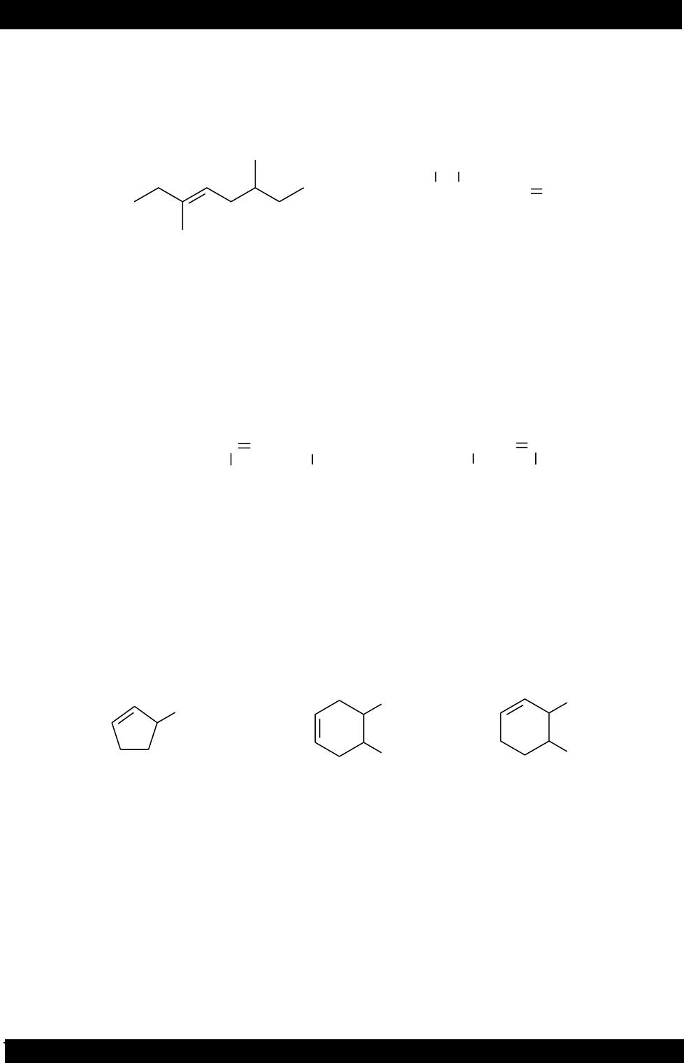 61 www.cursoanualdequimica.com.br e-mail: alexandrequimica.ce@gmail.com Substituintes são citados em ordem alfabética. 3. Se uma cadeia possui mais de um substituinte, eles são citados em ordem alfabética, usando-se a mesma regra para a ordem que foi explicada anteriormente. (Os prefixos di, tri, sec e terc devem ser ignorados quando os substituintes são postos em ordem alfabética, mas iso, neo e ciclo não são ignorados.) O número apropriado é então assinalado para cada substituinte. 3,6-dimetil-3-octeno CH3CH2CHCHCH2CH CH2 Br Cl 7 6 5 4 3 2 1 5-bromo-4-cloro-1-hepteno 1 2 3 4 5 6 7 8 4. Se o mesmo número para o sufixo do grupo funcional no alceno for obtido para ambas as direções, o nome correto é o que contém o menor número para o substituinte. Por exemplo, 2,5-dimetil-4-octeno é um 4-octeno em que a cadeia mais longa é numerada da esquerda para a direita ou da direita para a esquerda. Se você numerar da esquerda para a direita, os substituintes estão na posição 4 e 7, mas se numerar da direita para a esquerda eles se apresentam na posição 2 e 5. Comparando os quatro números para substituintes, 2 é menor, sendo a substância chamada 2,5-dimetil-4-octeno, e não 4,7-dimetil-4-octeno. CH3CH2CH2C CHCH2CHCH3 CH3CH3 2,5-dimetil-4-octeno e não 4,7-dimetil-4-octeno porque 2 < 4 CH3CHCH CCH2CH3 Br CH3 2-bromo-4-metil-3-hexeno e não 5-bromo-3-metil-3-hexeno proque 2 < 3 5. Em alcenos cíclicos, um número não é necessário para denotar a posição do grupo funcional, porque o ciclo é sempre numerado com as ligações duplas entre os carbonos 1 e 2. CH2CH31 2 3 45 3-etilciclopenteno CH3 CH3 1 2 3 4 5 4,5-dimetilciclo-hexeno CH3 CH2CH3 4-etil-3-metilciclo-hexeno Em ciclo-hexenos, a ligação dupla está entre os carbonos C-l e C-2, não importando que se desloque pelo anel no sentido horário ou anti-horário. Então, você deve mover ao redor do anel na direção que o substituinte leve o menor número, e não na direção que resultaria na menor soma dos números dos substituintes. Por exemplo, 1,6-diclorociclo-hexeno não é chamado 2,3- diclorociclo-hexeno porque l,6-diclorociclo-hexeno tem o menor número de substituinte (1); observe que ele não apresenta a menor soma de números de substituintes (1 + 6 = 7 versus 2 + 3 = 5). 62 www.cursoanualdequimica.com.br e-mail: alexandrequimica.ce@gmail.com Cl Cl CH3CH3CH2 1,6-diclorociclo-hexeno e não 2,3-diclorociclo-hexeno porque 1 < 2 5-etil-1-metilciclo-hexeno e não 4-etil-2-metilciclo-hexeno porque 1 < 2 6. Se ambas as direções levam ao mesmo número para o sufixo do grupo funcional e o mesmo menor número(s) para um ou mais substituintes, os substituintes são ignorados e a direção é alterada para a que fornece o menor número para o substituinte que resta. CH3CHCH2CH CCH2CHCH3 Br CH2CH3CH3 Cl CH3Br 2-bromo-4-etil-7-metil-4-octeno e não 7-bromo-5-etil-2-metil-4-octeno porque 4 < 5 6-bromo-3-cloro-4-metilcicloexeno e não 3-bromo-6-cloro-5-metilcicloexeno porque 4 < 5 Os carbonos sp2 de um alceno são chamados carbonos vinílicos. O carbono sp3 que está adjacente ao carbono vinílico é chamado carbono alílico. RCH2 CH CH CH2R carbono vinílicos carbonos alílicos Dois grupos que contêm uma ligação dupla carbono-carbono podem usar nomes comuns - o grupo vinílico e o grupo alílico. O grupo vinílico é o menor grupo possível que contém o carbono vinílico; o grupo alílico é o menor grupo possível que contém o carbono alílico. Quando “alil” for usado na nomenclatura, o substituinte deve estar ligado ao carbono alílico. H2C CH H2C CHCH2 grupo vinílico grupo alílico H2C CHCl H2C CHCH2Br 3-bromo-propeno brometo de alila cloroeteno cloreto de vinila nomenclatura sistemática: nome comum: 2.4.1. Estrutura dos alcenos A estrutura do menor alceno foi descrita no módulo 1. Outros alcenos apresentam estruturas similares. Cada carbono da ligação dupla em um alceno possui três orbitais sp2 que se encontram em um plano com ângulos de 63 www.cursoanualdequimica.com.br e-mail: alexandrequimica.ce@gmail.com 120°. Cada um dos orbitais sp2 apresenta sobreposições com outros orbitais de outros átomos para formarem ligações . Assim, uma das ligações carbono-carbono da ligação dupla é uma ligação , formada pela sobreposição de um orbital sp2 de um carbono com outro orbital sp2 do outro carbono. A segunda ligação carbono- carbono na ligação dupla (a ligação ) é formada pela sobreposição lado a lado do orbital p remanescente do carbono sp2. Uma vez que três pontos determinam um plano, cada carbono sp2 e os dois átomos ligados por ligações simples se encontram no mesmo plano. Para ocorrer uma sobreposição máxima entre orbitais, os dois orbitais p devem estar paralelos entre si. Dessa maneira, todos os seis átomos do sistema da dupla ligação se encontram no mesmo plano. H3C C C CH3 CH3H3C os seis átomos de carbono estão em um mesmo plano É importante lembrar que a ligação representa as nuvens que se encontram acima e abaixo do plano definido pelos dois carbonos sp2 e os quatro átomos ligados a eles. H3C C C CH3 CH3H3C sobreposição de orbitais p para formarem a ligação 2.5. Nomenclatura de alcenos com mais de um grupamento funcional Para se chegar ao nome sistemático de um dieno, devemos inicialmente identificar pelo nome de seu alceno a cadeia contínua mais longa que contenha ambas as ligações duplas, e depois trocar a terminação “eno” pela terminação “adieno”. A cadeia é numerada na direção que fornece à ligação dupla os menores números possíveis. Os números que indicam a localização das ligações duplas são citados antes do nome da substância ou precedem o sufixo. Os substituintes são citados em ordem alfabética. O propadieno, o menor dos membros da classe de substâncias conhecidas como alenos, é Frequentemente chamado aleno. CH2 C CH2 CH2 C CH CH2 CH3 Br sistemático: comum: propadieno aleno 2-metil-1,3-butadieno ou 2-metilbut