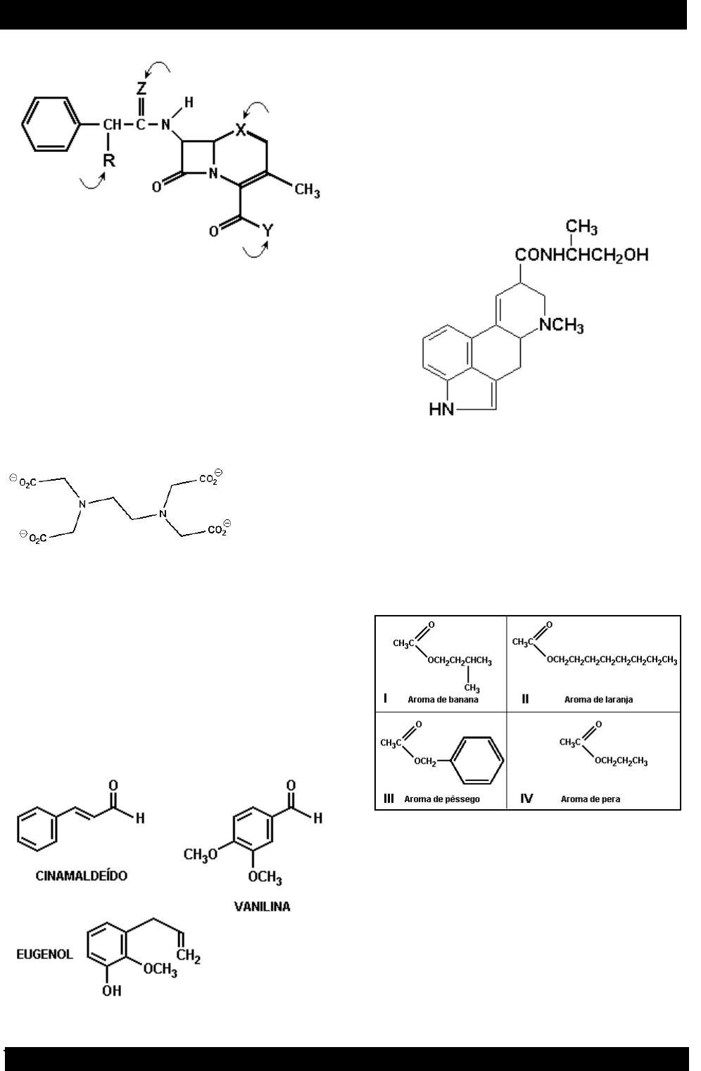 121 www.cursoanualdequimica.com.br e-mail: alexandrequimica.ce@gmail.com a) R = OH, X = O, Y = NH‚ e Z = S b) R = NH‚, X = S, Y = OH e Z = O c) R = OH, X = S, Y = NH‚ e Z = O d) R = NH‚, X = O, Y = OH e Z = S e) R = SH, X = O, Y = NH‚ e Z = O 32. (Ufc) A forma totalmente ionizada do EDTA, um sequestrante de metais, encontra-se representada a seguir. Sobre esta molécula, pode-se afirmar, corretamente, que: a) é bastante solúvel em hexano. b) apresenta quatro grupos carboxilatos. c) possui vinte pares de elétrons não ligantes. d) sequestra metais por interações íon-dipolo induzido. e) é um sequestrante mais eficiente de Ca++ em pH ácido. 33. (Ufes) Dados os compostos orgânicos adiante, pode-se AFIRMAR que a) apenas um desses compostos é um éter aromático. b) todos são aldeídos aromáticos. c) apenas vanilina e eugenol são éteres aromáticos. d) apenas cinamaldeído é um ácido aromático. e) todos são alquenos aromáticos. 34. (Ufmg) A ergonovina é um alcalóide natural encontrado em alguns fungos parasitas: Considerando-se a estrutura desse produto, é INCORRETO afirmar que a ergonovina apresenta a) um grupo carbonila. b) um grupo hidroxila. c) dois anéis benzênicos. d) dois grupos amino. 35. (Ufmg) Observe este quadro, em que estão representadas quatro substâncias orgânicas - numeradas de I a IV - e os aromas a elas associados: Essas substâncias são usadas na indústria como aromatizantes sintéticos, no lugar de extratos das frutas correspondentes. Considerando-se as estruturas de cada uma dessas substâncias, é INCORRETO afirmar que a) III é um éster. b) I apresenta cadeia ramificada. c) IV é a mais volátil. d) II tem um grupo funcional aromático. 36. (Ufpe) Sobre as propriedades de alguns compostos orgânicos, podemos afirmar: 122 www.cursoanualdequimica.com.br e-mail: alexandrequimica.ce@gmail.com ( ) os álcoois apresentam uma hidroxila ligada ao carbono como grupo funcional, podendo formar pontes de hidrogênio. ( ) os ácidos carboxílicos não formam pontes de hidrogênio e, por isso, apresentam ponto de ebulição muito baixo. ( ) os ésteres, as cetonas, os aldeídos, os ácidos carboxílicos e as amidas têm em comum o grupo funcional carbonila. ( ) os aldeídos, assim como os álcoois, possuem uma hidroxila como grupo funcional. ( ) as aminas são compostos que apresentam uma ligação carbono-nitrogênio, como grupo funcional e apresentam um caráter básico. 37. (Ufpe) A seguir são dadas as fórmulas de alguns constituintes nutricionais encontrados em diversos alimentos: 1, 2 e 3 são conhecidos, respectivamente, como: a) ácidos graxos, hidrocarbonetos e aminoácidos. b) carboidratos, ácidos graxos e proteínas. c) ésteres graxos, carboidratos e proteínas. d) ácidos graxos, carboidratos e hidrocarbonetos. e) ésteres graxos, hidrocarbonetos e proteínas. 38. (Ufpi) O Viagra, o principal agente oral contra impotência sexual masculina, é um sal de Ácido cítrico e Sildenafila, a substância mostrada abaixo. Escolha a opção que contém três funções orgânicas presentes na Sildenafila. a) Cetona; éter; amina. b) Cetona; hidrocarboneto; amida. c) Fenol; éster; amina. d) Álcool; amina; amida. e) Éter; amina; amida. 38. (Ufpi) Algumas indústrias de laticínios introduziram recentemente no mercado o "leite ômega". Um tipo de leite rico em gorduras poliinsaturadas. O Ácido Linolênico, um ácido -3 (ômega três, em virtude da última insaturação situar- se entre o antipenúltimo carbono da cadeia e seu anterior), apresenta a estrutura dada a seguir. Com relação a esta, escolha a opção que contém o nome correto do Ácido Linolênico. a) Ácido octadeca-3,6,9-trienoico b) Ácido octadeca-9,12,15-trienoico c) Ácido octadeca-8,11,14-trienílico d) Ácido octadeca-8,11,14-trienoico e) Ácido octadeca-3,6,9-trienílico 40. (Ufpi) Amburosídeo B (Phytochemistry 50, 71-74, 2000), cuja estrutura é dada a seguir, foi isolada de 'Amburana cearensís' (imburana-de-cheiro ou cumaru) na busca pelo principio ativo responsável pela atividade anti-malárica da mesma. Escolha a alternativa que apresenta quatro funções orgânicas presentes no Amburosídeo B. a) Fenol; Cetona; Ácido carboxílico; Álcool b) Cetona; Éter; Éster; Álcool 123 www.cursoanualdequimica.com.br e-mail: alexandrequimica.ce@gmail.com c) Cetona; Éter; Ácido carboxílico; Álcool d) Fenol; Éter; Éster; Álcool e) Fenol; Cetona, Éter; Álcool 41. (Ufpi) O composto antibacteriano ácido oxalínico é representado pela fórmula estrutural: e apresenta as seguintes funções: a) éster, cetona, amina e éter. b) éter, cetona, amina e ácido carboxílico. c) éster, amida, amina e ácido carboxílico. d) éster, amina, fenol e cetona. e) éter, amida, éster e amina. 42. (Ufrgs 2015) O ELQ 300 faz parte de uma nova classe de drogas para o tratamento de malária. Testes mostraram que o ELQ 300 é muito superior aos medicamentos usados atualmente no quesito de desenvolvimento de resistência pelo parasita. São funções orgânicas presentes no ELQ 300 a) amina e cetona. b) amina e éster. c) amida e cetona. d) cetona e éster. e) éter e ácido carboxílico. 43. (Pucpr 2015) Durante muito tempo acreditou-se que a cafeína seria a droga psicoativa mais consumida no mundo. Ao contrário do que muitas pessoas pensam, a cafeína não está presente apenas no café, mas sim em uma gama de outros produtos, por exemplo, no cacau, no chá, no pó de guaraná, entre outros. Sobre a cafeína, cuja fórmula estrutural está apresentada abaixo, são feitas as seguintes afirmações. I. Apresenta em sua estrutura as funções amina e cetona. II. Apresenta propriedades alcalinas devido à presença de sítios básicos de Lewis. III. Todos os átomos de carbono presentes nos anéis estão hibridizados na forma 2sp . IV. Sua fórmula molecular é 8 9 4 2C H N O . São VERDADEIRAS: a) somente as afirmações I, II e III. b) somente as afirmações II e III. c) somente