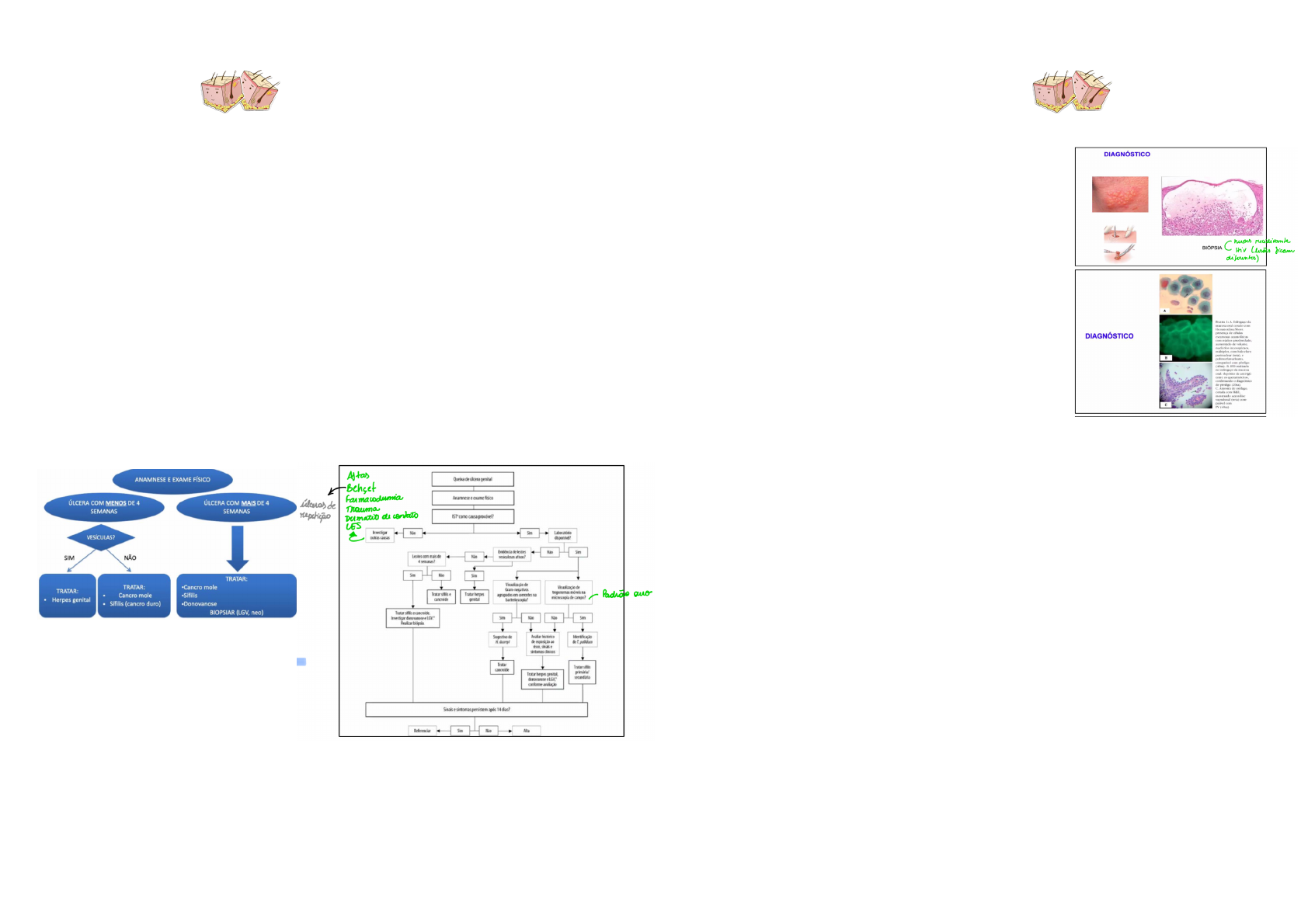 IST’s e Doenças Exantemáticas Infecciosas Introdução: Atualmente a denominação correta é IST, porque a pessoa pode estar infectada (com o vírus) e não estar doente. A grande maioria das pessoas com IST’s são assintomáticas e não procuram atendimento, sem diagnóstico e sem tratamento correto, acabam infectando outras pessoas e isso se torna um ciclo persistente de transmissão. A prevenção combinada é um conjunto de medidas que incluem: prevenir a transmissão vertical, imunizar para HBV e HPV, redução de danos, diagnosticar e tratar as pessoas com IST e HV, usar preservativo masculino, feminino e gel lubrificante, tratar todas as pessoas vivendo com HIV/AIDS, testagem regular para o HIV, outras IST e HV, profilaxia pós-exposição, profilaxia pré-exposição. O atendimento das úlceras genitais pode ser facilitado por meio de um fluxograma: Herpes Genal: Caracterizada por base eritematosa com vesículas agrupadas, ardor e dor local.Se a vesícula romper vê-se apenas a exulceração. O agente etiológico é Herpesvírus hominis tipo 2 (90% - sexual) e a transmissão ocorre por contato direto, pela saliva, epitélio traumatizado e outras secreções infectadas (vaginal, oral, sêmen). Apresente uma clínica de lesões em vesículas agrupadas, ardor e dor local, sintomas sistêmicos (principalmente na primoinfecção). O diagnóstico se dá por meio citodiagnóstico de Tzanck (raspar a base da vesícula/bolha) e sorologia (presença de anticorpos circulantes, em níveis correlacionados ao grau de atividade da doença, em 80% a 90% dos pacientes). As recidivas podem ser desencadeadas por leve trauma, pós-relação sexual, por determinados processos febris e não febris, após cirurgia e em algumas mulheres, no período pré-menstrual e após estresse emocional. Muitos casos, não há razão evidente para a erupção. O tratamento do primeiro episódio consiste em ACICLOVIR 200mg 4/4 horas, 5x ao dia por 7 dias. Em casos de reicidiva utiliza-se aciclovir 200mg 4/4 horas, 5x ao dia por 5 dias. O tratamento deve ser reiniciado de preferência ao aparecimento dos primeiros pródromos: aumento de sensibilidade, ardor, dor, prurido. Gestantes devem tratar o primeiro episódio em qualquer trimestre da gestação; devemos nos atentar ao herpes neonatal; Casos recidivantes (supressão), isto é, 6 ou mais episódios por ano utiliza- se aciclovir 400mg 12/12 horas por até 6 meses. A herpes no HIV apresenta manifestações severas, lesões extensas; indicado o tratamento injetável; Aciclovir: 5-10mg/kg 8/8 hora de 5-7 dias ou até resolução do caso. Cancro Mole: O cancro mole é uma ulceração aguda, específica e contagiosa, geralmente localizada na genitália externa. A moléstia é causada por bacilo gram- negativo (Haemophilus ducreyi). O cancroide resulta quase sempre de transmissão direta no ato sexual. O cancroide é mais comum no homem que na mulher, em proporção de 1:20. Como em todas as ulcerações genitais, o cancroide facilita a infecção pelo HIV, pois, rompida a barreira epitelial, a penetração do HIV e o seu contato com células inflamatórias, inclusive linfócitos CD4, alvos do vírus, tornam-se mais prováveis. Caracteriza-se clinicamente com o aparecimento de uma papulapústula que se transforma em ulceração. O tempo de incubação geralmente é de dois a quatro dias. Os caracteres clínicos são de ulceração, de bordas solapadas e cortadas a pique, com fundo purulento e base mole. O cancroide é autoinoculável. Localiza-se preferencialmente na genitália, podendo também ser encontrado em torno do ânus. Como complicação mais frequente, surge o bubão cancroso, que é a adenite inguinal observada em menos de um terço dos casos, processo agudo que evolui rapidamente para liquefação e fistulização. O diagnóstico é feito pela anamnese + exame físico + bascterioscopia e biópsia se necessário. - Cancro misto de Rollet: cancro mole e cancro duro na mesma lesão; lesão u l c e r a d a d e g e n i t a l o n d e h á a concomitância dos microrganismos: Treponema pallidum (sífilis – cancro duro) e Haemophilus ducreyi (cancro mole). O tratamento se dá por: • Azitromicina 1,0 g VO em dose única. • Ceftriaxona 250 mg IM em dose única. • Eritromicina 500 mg VO acada 8horas por 7dias • Ciprofloxacina 500 mg VO a cada 12 horas por 3 dias. A ceftriaxona é o tratamento de escolha para mulheres grávidas. Como tratamento tópico, limpeza local com água boricada e creme de antibiótico. Drenagem da adenite é contraindicada, pois prolonga o tempo de evolução. É preferível esvaziá-la, se necessário, por punção. Donovanose: A donovanose é uma enfermidade de evolução progressiva e crônica, de localização genital, podendo ocasionar lesões granulomatosas e destrutivas. O agente etiológico é o Calymatobacterium granulomatis (Klebsiella granulomatis, Donovania granulomatis). O parasita gram negativo, encontrado dentro dos macrófagos. A donovanose é uma infecção pouco frequente. É mais encontrada na Índia e Indonésia sendo registrada também no sul dos Estados Unidos, em comunidades aborígenes da Austrália e nordeste do Brasil. A ocorrência da doença é relacionada a fatores socioeconômicos e vida promíscua de grupos populacionais. É mais frequente em negros, mas é possível que essa No que diz respeito ao sexo, a doença parece ter predomínio no sexo masculino. A doença é mais frequente entre os 20 e 40 anos, coincidindo, portanto, com a fase de maior atividade sexual. O período de incubação é de 3 dias a 80 dias. A doença inicia-se por lesão nodular, única ou múltipla, de localização subcutânea, cuja erosão produz ulceração bem definida, que cresce lentamente e sangra com facilidade. A partir daí, as manifestações estão diretamente ligadas às respostas tissulares do hospedeiro, originando formas localizadas ou extensas e, até mesmo, lesões viscerais, por disseminação hematogênic