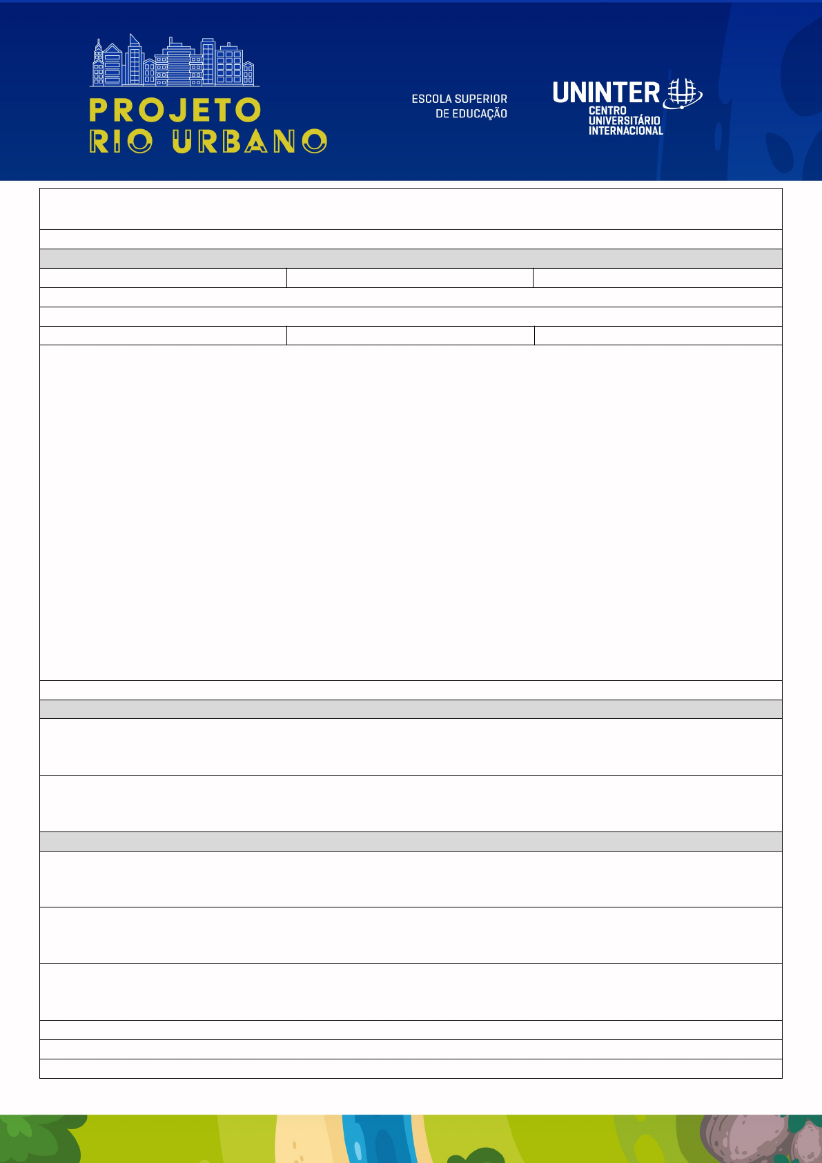 ETAPA I – DIAGNÓSTICO DO SISTEMA FLUVIAL PROJETO RIO URBANO – GEOCIÊNCIAS UNINTER Participante (s): CARACTERIZAÇÃO DO RIO URBANO SELECIONADO Estado: Bairro: Município: Nome de ruas próximas: Nome do urbano em análise: Coordenada do ponto de análise: 24°47'53.06"S 50°59'31.15"O Cartograma do ponto de análise do rio: Inserir imagem de satélite do ponto em análise no rio urbano selecionado Largura do canal no ponto de observação: CONTEXTUALIZAÇÃO DO RIO SELECIONADO NA BACIA HIDROGRÁFICA Bacia que o rio se encontra a nível municipal: Bacia que o rio se encontra a nível estadual/federal: CARACTERIZAÇÃO DO MEIO FÍSICO, BIÓTICO E SOCIOECONÔMICO Classificação climática: Bioma e características da vegetação local: Características da fauna local: População estimada: Densidade demográfica: IDH: PRINCIPAIS TRANSFORMAÇÕES NA PAISAGEM Data de análise: dia/mês/ano Imagem do acervo Google Earth para comparação: Inserir imagem de satélite histórica do ponto em análise no rio urbano selecionado Quanto a vegetação: Quanto a forma do canal: Quanto a urbanização: Outras transformações relevantes: