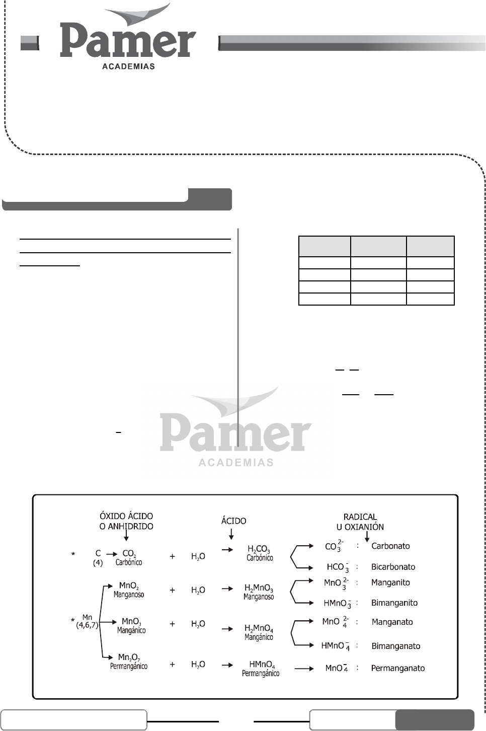 45UNI SEMESTRAL 2013 - III QUÍMICA TEMA 11 NOMENCLATURA INORGÁNICA: ÁCIDOS Y SALES QUÍMICA I. FUNCIÓN ÓXIDO ÁCIDO (ANHÍDRIDO), ÁCIDO OXÁCIDO (OXOÁCIDO) Y SU OXIANIÓN Obtención: Sea el No Metal: N 22 2 x 2 2 2 (x 1) 2 (x 1) Anhídrido Oxoácido Oxianión O N O H O H N O N O x+N Nombre tradicional a) Si el No Metal “N” tiene un N.O. Anhídrido N.........ico o Ácido b) Si el No Metal “N” tiene dos o mas N.O. Anhídrido prefijo N sufijo o Ácido N.O. del No metal PREFIJO SUFIJO 1 ó 2 HIPO OSO 3 ó 4 ----------- OSO 5 ó 6 ----------- ICO 7 HIPER o PER ICO Observación: • Para nombrar al oxianión se cambia los sufijos: oso por ito os ito ico por ato r i c o p a t o • Si el número de hidrógenos extraídos es la mitad, entonces se antepone el prefijo BI al nombre del No Metal. • En 2 xN O , si "x" es par, la fórmula se puede simplificar: DESARROLLO DEL TEMA 46UNI SEMESTRAL 2013 - III QUÍMICA NOMENCLATURA INORGÁNICA: ÁCIDOS Y SALES TEMA 11 Exigimos más! • Nombres modernos Para nombrar al oxianión se cambia los sufijos: – 4 2 3 • según la UIQPA : trioxo carbonato (IV) de hidrógeno H C O • según A stock : ácido trioxo carbónico (IV) – 6 2 4 • UIQPA : tetraoxo manganato (VI) de hidrógeno H Mn O • A stock : ácido tetraoxo mangánico (VI) Método práctico 1. Para hallar la fórmula de un ácido oxácido: • Sea "x" el N.O. del No Metal. a) Si x es impar x 1 2 HNO b) Si x es par 2 x 2 2 H NO Ejemplo: • Ácido nítrico: 5 1 3 (3,5) 2 N :HNO HNO ó ................................................... ................................................... • Ácido hipocloroso: 1 1 (1,3,5,7) 2 C : HC O ó HC O ................................................... ................................................... • Ácido sulfúrico: 2 6 2 2 4 (4,6) 2 S :H SO ó H SO ................................................... ................................................... • Ácido Manganoso: (4,6,7) Mn : .................... ó ............... ................................................... ................................................... 2. Hallar el nombre de una fórmula del oxácido: • 21 2 3 2 3 Te :H TeO H TeO (4,5) Ácido ................... • 1 2 4 4HC O HC C : (1,3, 5,7) O Ácido ................. • 1 2 2 3 2 3H CO H CO C : (4) Ácido ......................... Ejercicios: Nombrar los siguientes compuestos: • HNO2 __________________________________ • HIO3 __________________________________ • H2SeO4 ________________________________ • H2SO3 _________________________________ 47UNI SEMESTRAL 2013 - III QUÍMICA TEMA 11 NOMENCLATURA INORGÁNICA: ÁCIDOS Y SALES Exigimos más! • HClO2 __________________________________ • HBrO3 _________________________________ • H2SeO3 _________________________________ • H2TeO4 _________________________________ • HPO=3 __________________________________ • _ 4C O __________________________________ • 3BrO _ __________________________________ • 2CrO _ __________________________________ • 3C O _ __________________________________ • BrO _ __________________________________ • SeO=3 __________________________________ • TeO=4 __________________________________ Formular los siguientes compuestos: • Ácido cromoso: __________________________ • Ácido crómico: ___________________________ • Ácido hipobromoso: _______________________ • Ácido bromoso: ___________________________ • Ácido brómico: ___________________________ • Ácido perbromico: ________________________ • Ácido selenioso: __________________________ • Ácido selénico: ___________________________ • Telurito: ________________________________ • Bitelurito: _______________________________ • Telurato: _______________________________ • Bitelurato: ______________________________ • Vanadito: ________________________________ • Bivanadito: ______________________________ • Cromato: _______________________________ • Bicromato: ______________________________ • Perbromato: _____________________________ Clases de ácidos oxácidos 1. Ácido Polihidratado o Polihidroxilado Nombre: Ácido PREFIJO No Metal: PREFIJO Si el N.O. del No Metal es Impar Si el N.O. del No Metal es Par META ANHÍDRIDO + 1 H2O ANHÍDRIDO + 1 H2O PIRO ANHÍDRIDO + 2 H2O 2ANHÍDRIDO + H2O ORTO ANHÍDRIDO + 3 H2O ANHÍDRIDO + 2 H2O Observaciones: i) Sólo el: B, P, As, Sb y Si pueden formar ácidos polihidratados. ii) En el nombre se puede obviar el prefijo ORTO. Ejemplo 1: Veamos sus radicales: Ejemplo 2: 2 :(4) Si SiO Anhídrido Silícico (Silice) • SiO2 + 1H2O H2SiO3: Ac. Metasilícico • 2SiO2 + 1H2O H2Si2O5: Ac. Pirosílico • SiO2 + 2H2O H4SiO4 : Ác. Ortosilícico (Ác. Silícico) Veamos sus radicales: 48UNI SEMESTRAL 2013 - III QUÍMICA NOMENCLATURA INORGÁNICA: ÁCIDOS Y SALES TEMA 11 Exigimos más! 2. Ácido Poliácido nANHÍDRIDO + H O POLIÁCIDO2 Nombre: PREFIJO No Metal. Ejemplo: 2 2 3 2 2 4 7 4 7 (3) Anhídrido Ácido TetraboratoBórico Tetrabórico B 2B O H O H B O B O 2 3 2 2 2 7 2 7 .......... (4,6) Anhídrido Disulfato Súlfurico Disulfurico S 2SO H O H S O S O Ácido 23 2 2 2 7 2 7 (3,6) Anhídrido Ácido Dicromatoácido o ........Crómico Dicrómico Cr 2CrO H O H Cr O HCr O Casos especiales • 4 4 2 8 3 10 Ac.TrisilícicoAc.Ortosilícico oSilícico 3H SiO 2H O H Si O OH OH OH | | | HO Si O Si O Si OH | | | OH OH OH • Ácido pentaortovanádico: 2 5 2 3 5 14V 5V O 3H O H V O (4,5) O O HO P O P OH | | OH OH O O O HO P O P O P OH | | | OH OH OH Ácido difosfórico Ácido trifosfórico Ácido ciclo Ácido ciclo trimetafosfórico tetrametafosfórico 3. Ácido Peroxácido Son compuestos en los que se ha sustituido un oxígeno (O2–) por el grupo peróxido 22O . Nombre: Ácido peroxo o peroxi No metal. Ejemplo: • 2 4 2 5 Ácido Ácido Sulfúrico Peroxisulfúrico H SO H SO • O O HO S OH HO S O OH O O • 3 4 3 3 2 3 5 cido cidoÁ Á Fosfórico Peroxifosfórico H PO H PO O H PO • 3 2 2 4 Ácido Ác