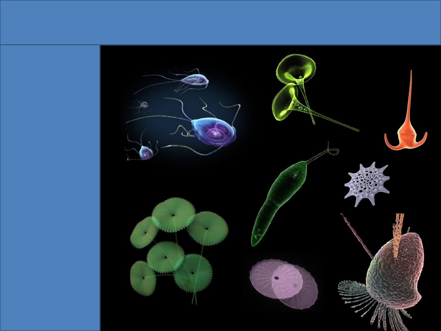 Aula de Biologia Tema: O Reino protista Reino Protista * Reino Protista Reino Protista 2) Características Gerais dos Protistas Morfologia: Todos Eucariontes. Núcleo com membrana nuclear ou carioteca. Citoplasma com todas as organelas celulares. Uni ou pluricelulares. Parede celular presente em alguns, que pode ser formada por: pectina, sílica ou celulose. Os protistas pluricelulares não formam tecidos verdadeiros. Habitat: (Maioria aquático) Marinho Água doce Nutrição: Heterótrofos (Ex: Paramecium sp.) Autótrofos (Ex: Algas verdes) Alguns são Mixotróficos - Alternam entre os dois modos de nutrição (Ex: Euglenas) Obs.: Alguns são parasitas, habitando fluídos corporais de outros organismos. Reino Protista Protistas Autótrofos Todos Fotossintetizantes Algas Unicelulares Euglenas Dinoflagelados Diatomáceas Algas Douradas Algas Pluricelulares Algas Verdes Algas Pardas ou Marrons Algas Vermelhas Reino Protista 3) Protistas Autótrofos Algas Unicelulares 1) Filo Euglenophyta (Euglenas) Dulcícolas (vivem em água doce rica em matéria orgânica e inorgânica). Flageladas (possuem dois flagelos, um rudimentar “não visível” e outro emergente e visível). Apresentam uma película envolvendo a membrana celular bastante flexível. Possuem uma estrutura próximo ao flagelo (estigma) responsável pela percepção luminosa. Possuem vacúolo contrátil ou pulsátil, o qual é responsável pelo equilíbrio osmótico das Euglenas. Nutrição do tipo mixotrófica, pode atuar tanto como autótrofo (sintetizando glicose através da fotossíntese) como heterotrófico (capturando partículas alimentares no meio através de uma pequena abertura na base do flagelo). Reprodução: Divisão binária Reino Protista 3) Protistas Autótrofos Algas Unicelulares 1) Filo Euglenophyta (Euglenas) Flagelo Vestigial Nucléolo Vacúolo Contrátil Película Cloroplasto Núcleo Estigma Flagelo Assistir ao vídeo Reino Protista 3) Protistas Autótrofos Algas Unicelulares 2) Filo Dinophyta ou Dinoflagelados (Algas de fogo) Marinhas (constitui parte importante do fitoplâncton oceânico). Flageladas (possuem dois flagelos). Os flagelos localizam-se em sulcos e as algas se movimentam “como um pião”. Muitas possuem uma carapaça celulósica, que além de protegê-las atua como órgão flutuador em mares abertos. Muitos são endossimbiontes, pois vivem em mutualismo no interior de vários invertebrados, como os corais, águas-vivas, anêmonas-do-mar, esponjas, etc. Quando são endossimbióticas, recebem a denominação de zooxantelas. Nutrição do tipo mixotrófica. São responsáveis pela liberação de substâncias tóxicas nos oceanos, causando a morte de outros organismos, relação denominada amensalismo e o fenômeno Maré Vermelha. Reino Protista 3) Protistas Autótrofos Algas Unicelulares 2) Filo Dinophyta ou Dinoflagelados (Algas de fogo) Sulco Flagelo Carapaça celulósica Assistir ao vídeo Reino Protista 3) Protistas Autótrofos Algas Unicelulares 3) Filo Bacillariophyta ou Diatomáceas Marinhas (vivem principalmente em mares de águas frias) São responsáveis por 25% da produtividade primária total ta Terra. Muitas possuem parede celular dividida em duas metades (frústulas), constituídas de sílica. As carapaças, por serem resistentes à decomposição, se depositam no assoalho oceânico, formando após milênios, uma rocha porosa, denominada diatomito. Os diatomitos são utilizados na indústria para a fabricação de isolante elétrico, creme dental, filtros e lixas. Apresentam o pigmento fucoxantina (carotenóide marrom dourado). Nutrição: Mixotróficas Reprodução: Divisão binária ou sexuada. Reino Protista 3) Protistas Autótrofos Algas Unicelulares 3) Filo Bacillariophyta ou Diatomáceas . Assistir ao vídeo Formas variadas Reino Protista 3) Protistas Autótrofos Algas Unicelulares 4) Filo Chrysophyta (Algas Douradas) Habitat: Marinho e Água doce. Podem viver isoladas ou formar colônias. Possuem pigmento marrom-amerelado (fucoxantina). Parede celular formada por sílica. Podem possuir um ou mais flagelos Reprodução: Divisão binária ou sexuada. Assistir ao vídeo Reino Protista 3) Protistas Autótrofos Algas Pluricelulares 1) Filo Chlorophyta (Algas Verdes) Maioria das espécies são pluricelulares. Habitam ambiente marinho e água doce. Não formam tecidos verdadeiros, mas já há divisão de trabalho entre as células. Importância: Podem viver em mutualismo com fungos formando os líquens. Outras podem vivem no citoplasma de células animais, principalmente de cnidários de água doce no gênero Hydra. Reino Protista 3) Protistas Autótrofos Algas Pluricelulares 2) Filo Phaeophyta (Algas Pardas) Habitam ambiente marinho. Comum em águas temperadas e polares. Coloração marrom provém do pigmento (Fucoxantina). Reprodução pode ser sexuada e assexuada. Importância: A parede celular é composta por celulose e pelo polissacarídeo algina (mucilagem) A algina é utilizada nas indústrias alimentícia (sorvetes) e de cosméticos (cremes). Reino Protista 3) Protistas Autótrofos Algas Pluricelulares 3) Filo Rhodophyta (Algas Vermelhas) Habitam ambiente marinho. Comum em águas tropicais (quentes). Coloração marrom provém do pigmento (Ficoeritrina). Reprodução: sexuada e assexuada. Importância: A parede celular é composta por celulose e os polissácarídeos ágar e carragena. O ágar é usado em laboratório para a confecção de meios de cultura para o crescimento de fungos e bactérias. Reino Protista 4) Reprodução a) Reprodução Assexuada Divisão binária: Uma célula origina dois novos indivíduos. Divisão binária de um Euglenóide. Divisão binária de uma diatomácea. Reino Protista 4) Reprodução b) Reprodução Sexuada I. Haplobionte A meiose ocorre no zigoto (2n), produzindo células haplóides (n). O organismo adulto é haplóide (n), que por mitoses produz gametas também haplóide (n). Fusão Zigoto Células Haplóides (n) Meiose Gametas n n 2n 