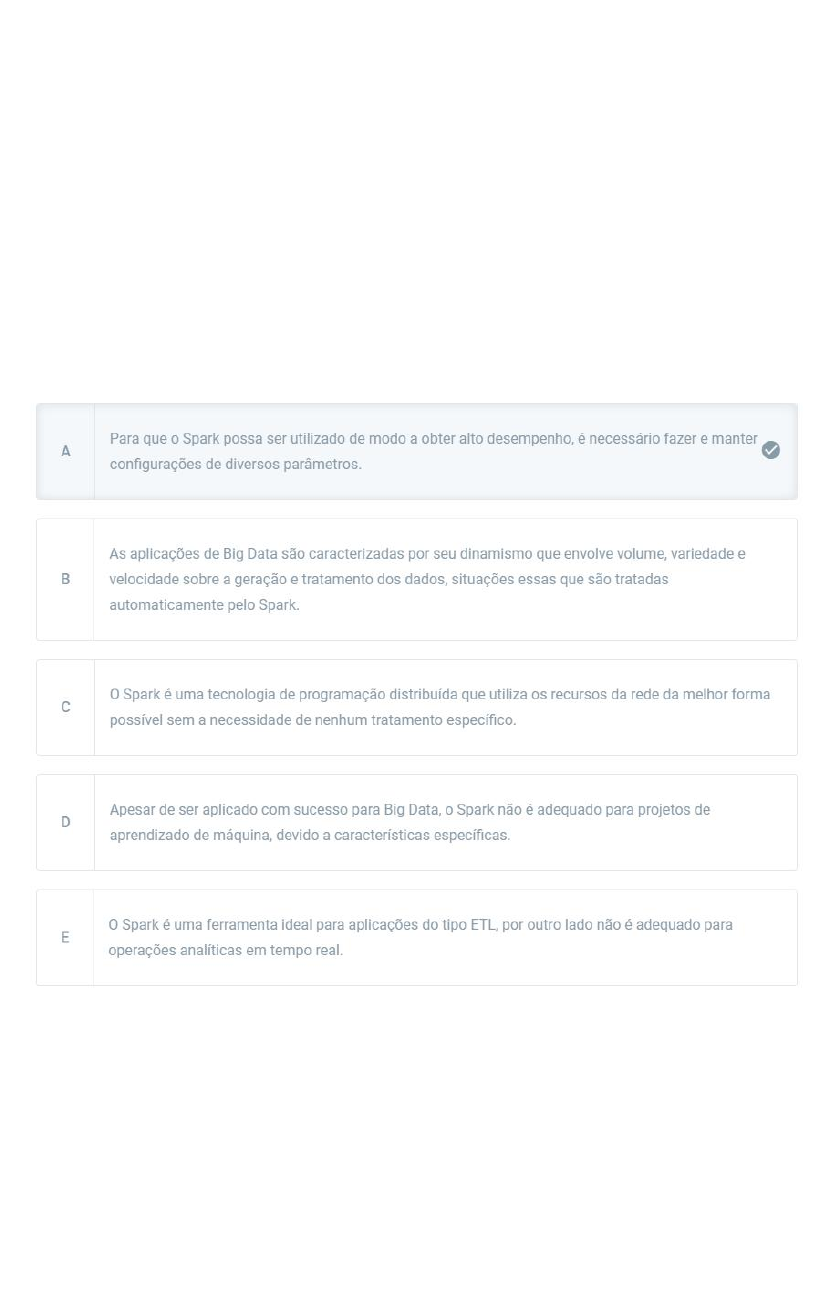 Princípios de Desenvolvimento de Spark Com Python Questão 1 As aplicações de Big Data são dinâmicas e, cada vez, mais comuns. Então, é necessário utilizar recursos computacionais que auxiliem na criação de aplicações eficientes para atender a essa demanda, tais como frameworks e plataformas de desenvolvimento. O Spark é um framework de alto desempenho usado com sucesso exatamente para esse tipo de situação. Nesse sentido, selecione a opção correta a respeito do Spark em relação aos cenários de aplicação: Parabéns! A alternativa A está correta. Questão 2 A arquitetura do Spark é projetada em modelo hierárquico com entidades com responsabilidades bem definidas. Essas entidades relacionam-se entre si para gerenciar etapas do ciclo de vida dos processos. A forma como o processo é executado é essencial para a obtenção do alto desempenho do Spark. Nesse sentido, selecione a opção correta a respeito da arquitetura do S Parabéns! A alternativa A está correta. As abstrações fundamentais da arquitetura do Spark são o conjunto de dados de distribuição resiliente, ou RDD, e o grafo acíclico dirigido, DAG. O RDD é um conjunto de dados que é tolerante a falhas e pode ser executado em paralelo, sendo que todos os dados particionados em um RDD são distribuídos e imutáveis. E o DAG é a forma como as operações sobre os dados são executadas. Questão 1 Parabéns! A alternativa A está correta. Questão 2 Parabéns! A alternativa A está correta.
