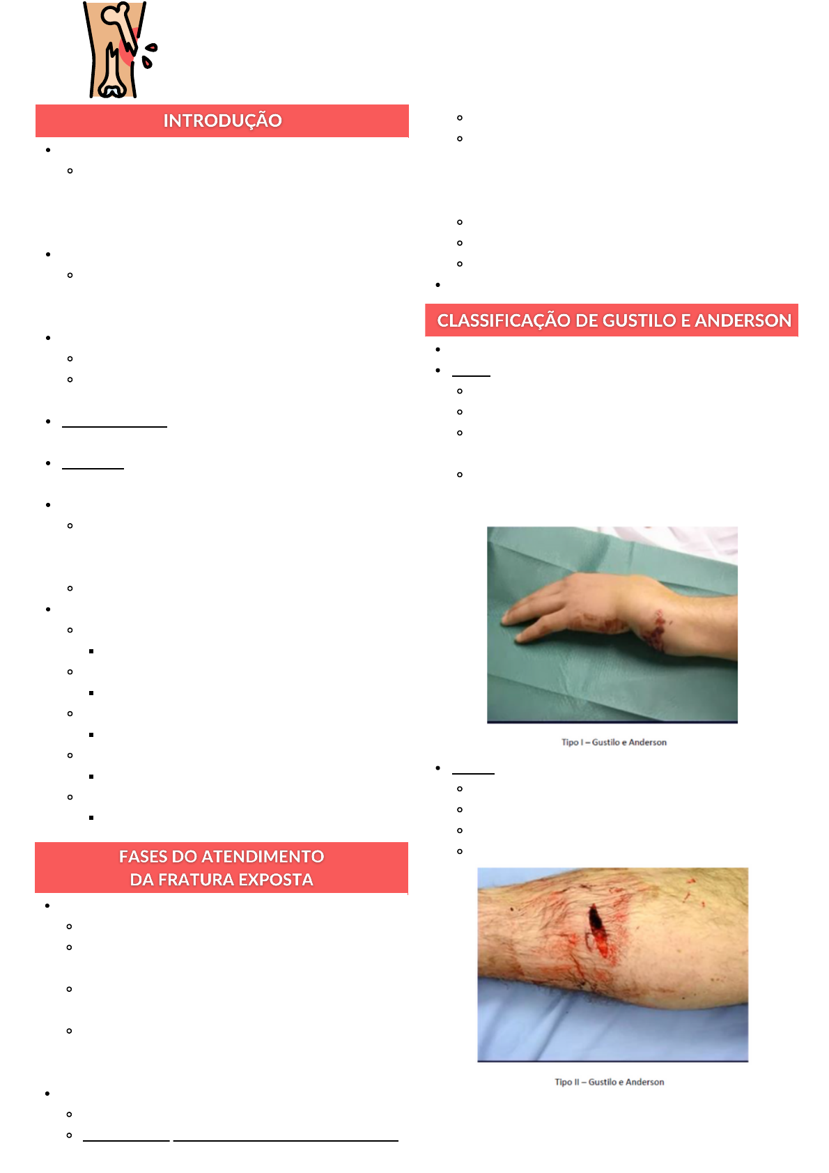 FRATURAS EXPOSTAS CONCEITO Aquelas em que há uma ruptura da pele e dos tecidos subjacentes, comunicando diretamente o osso fraturado e/ou seu hematoma com o meio externo EPIDEMIOLOGIA: MOTO E SUA PARTICIPAÇÃO: Com o aumento da circulação de motos e sua forte participação nesse tipo de fratura CASCATA DA FRATURA EXPOSTA: FRATURA > Lesões associadas > morte FRATURA > Lesões associadas > longo período de hospitalização > amputação > sequelas PSEUDOARTROSE: Ausência de consolidação, sendo uma complicação comum nas fraturas expostas SEQUELAS: Tanto de funcionalidade quando do ponto de vista neurológico central MEIO DE CONTAMINAÇÃO: POR BACTÉRIAS DO AMBIENTE, CAUSANDO: Desvascularização tecidual e perda da função do membro por lesão INFECÇÃO TEM RELAÇÃO COM PIOR PROGNÓSTICO PATÓGENOS MAIS COMUNS Trauma pontiagudo de baixa energia Strepto, Staph Ferimentos em fazendas Clostridium Ferimentos na água corrente Pseudomonas e Aeromonas Água do mar Aeromonas e Vibrio Ferimentos de guerra de alta energia Gram negativos ATENDIMENTO PRÉ-HOSPITALAR: Garantir vias aéreas e ressucitação, se necessário COBERTURA DA FERIDA - evitar contaminação secundária IMOBILIZAÇÃO PROVISÓRIA: Auxilia na analgesia, previamente ATENDIMENTO INICIAL PRECOCE: Em caso de provável infecção é possível a aplicação de antibióticos antes de chegar ao hospital FASE HOSPITALAR: ATLS DOCUMENTAÇÃO VISUAL E DESCRITIVA DA LESÃO: Com avaliação da gravidade e também do ponto de legal ao paciente e ao médico! EXAME COMPLETO DA EXTREMIDADE: Pulso, perfusão, temperatura, cor, sensibilidade, motricidade, deformidades (fotografando e escrevendo) AVALIAÇÃO RADIOGRÁFICA ANTIBIÓTICO PROFILAXIA E TETANOPROFILAXIA Profilaxia de trombose! FASE CIRÚRGICA: Melhor detalhada posteriormente IMPORTÂNCIA: Gravidade das lesões TIPO I: Lesão de pele igual ou menor que 1cm Mínima contusão muscular Geralmente um mecanismo de dentro para fora: Um fragmento de fratura calvagada perfura a pele IMAGEM ABAIXO: Deformidade distal da extremidade dos ossos do antebraço e com uma lesão de pele menor que 1 cm na região da ulna TIPO II: Laceração da pele de 1 a 10cm Extensa lesão de partes moles Geralmente de fora para dentro IMAGEM: FRATURAS EXPOSTAS FASES: LIMPEZA (PRIMEIRO): Solução degermante (água e sabão): Sem contato com a ferida Soro fisiológico 0,9% de 10 a 20L (empírico) Retirada de corpos estranhos; Tricotomia Solução alcóolica e campos estéreis D & I – DEBRIDAMENTO E IRRIGAÇÃO: Não existe consenso sobre volume de líquido e área de debridamento necessários Usa sabão e antibióticos DEBRIDAMENTO: Remove corpos estranhos, tecidos desvitalizados Reduz contaminação bacteriana Cria uma ferida vascularizada: segue dissecando até atingir um sangramento adequado Avaliar vitalidade tissular, tecido muscular e retirar framentos osseos desvitalizados Novo debridamento em 48 horas, se necessário TIPO III: Todas acima de 10cm SUBCLASSIFICAÇÃO: IIIA: Extensa laceração cutânea com adequada cobertura óssea (cobre a lesão com a pele que está ao redor) IMAGEM: Duas regiões de contato com o meio externo, de modo que a extensão total é dada pela soma de uma com a outra IIIB: Extensa lesão de partes moles que requer enxerto ou retalho musculocutâneo IMAGEM: Precisa documentar e fotografar, pois pode precisar de amputação e o paciente não ter consciência e nenhum familiar por perto Apesar da extensão, é IIIB, por que não há lesão vascular Não há chance de fazer uma cobertura óssea ou muscular IIIC: Lesão vascular que requer reparo Não necessariamente precisa de mais de 10cm, pois basta ter lesão vascular que é IIIC IMAGEM: Lesão vascular extensa que não pode ser recuperada EPIDEMIOLOGIA: Maioria das fraturas por acidentes de moto são IIIC IIIA e III são, muitas vezes, definidas no momento do tratamento para saber se consegue ou não recobrir a parte óssea PRIORIDADES: ABORDAGEM MULTIDISCIPLINAR: Ortopedia (fixação), cirurgião vascular (revascularização), neurocirurgião, cirurgião plástico (cobertura) e infectologista POIS O PACIENTE PODE CHEGAR COM Choque hipovolêmico - muito em fraturas de bacia Lesões extensas associadas Tétano Necessidade de antibiótico Necessidade de redução das fraturas (restaurando a congruência articular) Necessidade de imobilização externa-temporária ou com implantes definitivos FRATURAS EXPOSTAS DE ACORDO COM A CLASSIFICAÇÃO: GUSTILO I E II: Cefalosporina de primeira geração CEFAZOLINA/CEFUROXIMA POR 24 HORAS: Cobre GRAM + OBSERVA EVOLUÇÃO GUSTILO III: AMINOGLICOSIDEOS (Genta) + CEFALOSPORINA DE ÚLTIMA GERAÇÃO + PENICILINA: Cobertura para GRAM NEGATIVO E POSITIVO durante 72 horas ESTABILIZAÇÃO DA FRATURA: POR QUÊ? Por que precisa estar constantemente debridando, ou seja, é preciso estabilizar para dar conforto de dor ao paciente O QUE USA? TRAÇÃO CUTANEA OU ESQUELETICA QUANDO? Quando não há fixadores externos disponíveis PARA QUÊ? Tracionar o membro fraturado EXEMPLO DE FRATURA EXPOSTA DE FEMUR: Coloca-se um pino (um fio de Steinmann grosso) transósseo ao nível da tuberosidade anterior da tíbia onde é aplicado um estribo com a férula de Bohler- Braun perpendicular para tracionar o membro fraturado (peso tracionado é cerca de 10% do peso corporal do paciente A ESTABILIZAÇÃO MELHORA A DOR TALAS OU GESSO RAFI: Placas ou hastes FIXADORES EXTERNOS: Lineares (biplanar) ou circulares FRATURA EXTERNA INICIAL: Não obrigado ser com fixadores circulares, pode-se precisar mais na frente quando for fazer alongamentos ósseos por perdas de material em relação as fraturas GRANDE ESTABILIDADE AO PACIENTE (perto-perto longe-longe): Moldura biplanar com pinos de 5mm, mais perto possível da fratura e dois mais distantes possíveis (preservando a lâmina epifisária de crescimento e as articulações) TRATAMENTO DAS LESÕES ASSOCIADAS: NEURORRAFIA TENORRAFIA (TENDÃO) Novas intervenções cirúr