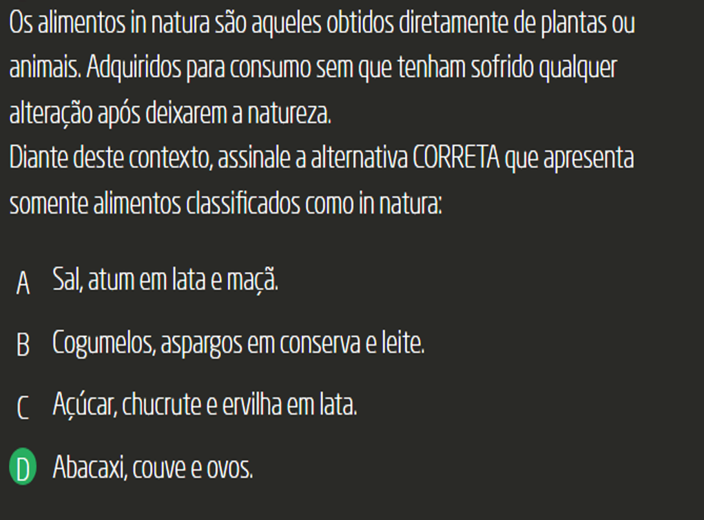 Os alimentos in natura são aqueles obtidos diretamente de plantas ou animais. Adquiridos para consumo sem que tenham sofrido qualquer alteração após deixarem a natureza.Diante deste contexto, assinale