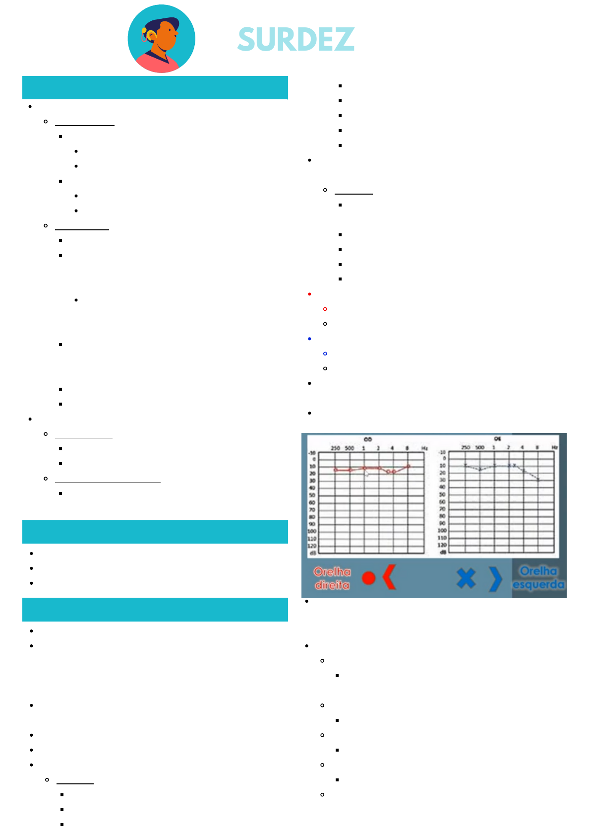 SURDEZSURDEZ FISIOLOGIA DO OUVIDO APARELHO TRANSMISSOR Orelha externa PAVILHÃO AURICULAR Captador de ondas sonoras Orientador sobre origem da fonte CONDUTO AUDITIVO EXTERNO Trajeto sinuoso - proteção Proteção a MT (temperatura e umidade) Orelha média Transmissão de onda sonora Na MT, a pars tensa tem maior capacidade vibratória pela camada intermediária -> transmite a onda para os ossículos Efeito alavanca martelo-bigorna (após a puberdade a articulação incudomalear se ossifica - vibram como um só) Relação hidráulica - toda energia que chega nos 55mm² da pars tensa -> passa para os 3,2mm² do estribo Ação muscular - acomodação Tuba auditiva - arejamento e pressão ideal APARELHO TRANSDUTOR Orelha interna Células ciliadas externas e internas Despolarização - produção de potencial elétrico NC VIII - vestibulococlear Condução do potencial elétrico ao tronco encefálico Audiometria tonal Audiometria vocal Imitanciometria Cadeia ossicular Cóclea VIII Tronco cerebral Córtex Se na via aérea o paciente tiver alguma perda, testa-se a via óssea Via óssea Coloca uma tiara que tem um vibrador ósseo na mastoide Cóclea VIII Tronco cerebral Córtex Vermelho -> orelha direita Bola vermelha -> via aérea direita < vermelha -> via óssea direita Azul -> orelha esquerda X azul -> via aérea esquerda > azul -> via óssea esquerda. O teste é feito com o paciente apertando um botão para demonstrar que ele escuta aquela determinada frequência Nessa audiometria abaixo só foi testada a via aérea, pois o paciente não apresentou perda: PROPEDÊUTICA AUDIOLÓGICA BÁSICA Teste realizado em cabine acústica + fone de ouvido Como tem que ir com a requisição, se por acaso a perda for unilateral começa o exame pelo ouvido que não tem alteração. Se for bilateral, começa pela menos afetada, se ambas forem muito afetadas, começa pela direita Tons puros - frequências (Hz) e intensidades (dBNAS) determinadas Via aérea X via óssea Audiograma VIAS AUDITIVAS Via aérea Pavilhão Canal auditivo externo MT PROPEDÊUTICA AUDIOLÓGICA BÁSICA O zero é a padronização de uma audição normal, e se fala em 20-25dB porque é o considerável para estar na faixa da normalidade, como no exame acima. PERDAS AUDITIVAS Leve: 25 a 40dB >3m de distância já há uma dificuldade (teatro/cinema) Moderada: 41 a 70dB >1m Severa: 71 a 90dB Voz alta ou usando aparelho auditivo que se escuta Profunda: >91dB Incapaz Essas perdas estão baseadas nas frequências de 500Hz, 1000Hz e 2000Hz (no exame representados por 500, 1 e 2) SURDEZSURDEZ Assim, se houver perda a partir de 3000Hz, se fala que os limiares auditivos estão dentro da normalidade Se existir uma perda em 500Hz de 30dB e nas demais estiver normal, se considera perda leve Se em 500Hz está uma perda de 40dB, mas as de 1000Hz e 2000Hz a perda de 70Hz -> perda leve/moderada. AUDIOMETRIA VOCAL Também chamado de Logoaudiometria Cabine acústica Também é uma orelha por vez Monossílabas e dissíladas: o paciente tem que repetir o que for dito pelo fonoaudiólogo Discriminação auditiva 100 a 80% = normal 80 a 60% = condutiva ou neurossensorial <60% = neurossensorial retrococlear (acometimento do nervo?) ou central (interpretação comprometida) Se houver uma perda auditiva com muito baixa discriminação, deve-se considerar que o problema pode ser no nervo IMITANCIOMETRIA Timpanometria Estuda a resistência apresentada pelo ouvido médio (MT e cadeia ossicular) à passagem da energia vibratória Coloca uma sonda no ouvido do paciente e faz uma pressão negativa e positiva -> avalia o quanto a MT e a cadeia ossicular vai desviar de ar Impedância Massa do conjunto tímpano-ossicular Atrito das articulações Complascência Reflexo estapediano Abolido: doença orelha média e doença retrococlear Verifica a contração do músculo do estapédio O músculo estapédio é o menor do corpo humano e é inervado pelo nervo facial NC VII Ajuda no diagnóstico de paralisias faciais periféricas Curvas de timpanograma: Curva A é a normal (-200 a +200 de pressão em mmH2O) com o pico no 0 (ta meio torto na foto) -> deslocamento de 0,7 a 1mm³ de ar Curva B: não tem pico, ou seja, você faz a pressão positiva e a negativa e não há deslocamento de ar - muito comum quando há líquido dentro da orelha média Curva C: intermediária DEFINIÇÃO Disacusia Distúrbio da audição que cursa com perda auditiva em maior ou menor grau de intensidade, em caráter transitório ou definitivo, estacionário ou progressivo Hipoacusia Diminuição da audição sem alterar a qualidade da captação sonora - aplicável a todos os quadros de PC (perda condutiva) com reserva coclear normal e PNS (perda neurossensorial) que ainda não interferiram nas frequências de fala Anacusia Incapacidade auditiva - profunda PERDA AUDITIVA Uni ou bilateral Contínua ou flutuante Instalação súbita ou progressiva Percepção da fala - compreensão Intolerância a sons intensos Presença de tinnitus (zumbido) - caracterizar Presença de tontura - caracterizar Outros sintomas e sinais otológicos: dor, otorreia, otorragia Interrogatório diversos aparelhos, antecedentes pessoais e familiares; FATORES DE RISCO Prematuridade, baixo peso Admissão em UTI Anóxia neo-natal, hiperbilirrubinemia Ototóxicos Incubadora Infecções congênitas Doenças neurológicas e/ou degenerativas DISACUSIAS CONDUTIVAS E NEUROSSENSORIAIS SURDEZSURDEZ EXAME FÍSICO Exame físico geral e otorrinolaringológico Fáceis característica Mal-formações Otoscopia Exame otoneurológico; TIPOS DE DISACUSIAS Condutivas Aparelho transmissor (OE e OM) Neurossensoriais Cóclea/ nervo acústico Mista OM e OI Central Processamento auditivo central PERDA AUDITIVA (PA) POR ALTERAÇÃO NO APARELHO CONDUTOR - OE E OM Causas relacionadas à orelha externa Otite externa Oto-hematoma Rolha de cerume Corpo estranho Queratose obliterante Colesteatoma Estenose adquirida Tumores benignos e malignos Mal-formações Causa