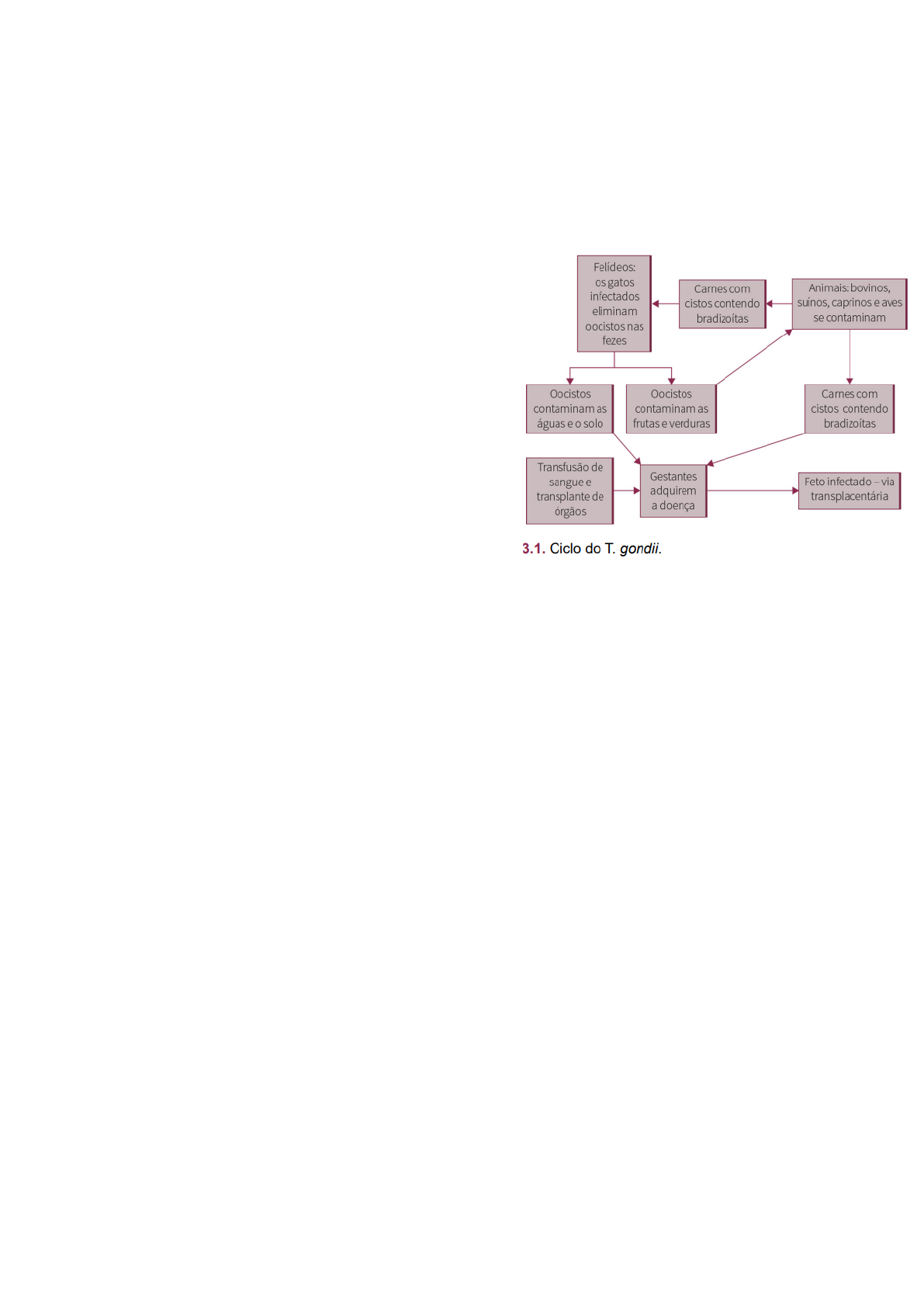 TORCHS ● série de infeções que podem afetar o decurso da gravidez e provocar malformações fetais, caso a mãe as contraia pela primeira vez durante a gravidez ● Toxoplasmose – Outras doenças – Rubéola – Citomegalovírus – Herpes→ TORCHS Toxoplasmose ● agente etiológico: T. gondii ○ parasita intracelular obrigatório que se apresenta em três formas: o esporozoíta, que está presente nos oocistos eliminados nas fezes dos gatos infectados; os taquizoítas (a forma observada na fase aguda da infecção); e os bradizoítas (a forma de multiplicação lenta encontrada nos cistos teciduais) ● felídeos: únicos animais nos quais o T. gondii completa seu ciclo reprodutivo ○ infecção primária: gatos podem eliminar milhões de oocistos, diariamente, durante um período de uma a três semanas → tornam-se infectantes após 5 dias e podem permanecer infecciosos durante + de 1 ano (esp. em ambientes quentes e úmidos) ○ gatos normalmente desenvolvem imunidade após uma infecção primária ● formas de infecção ○ principal fonte de infecção materna: ingestão de bradizoítos presentes na carne ou nos seus produtos crus ou pouco cozidos ○ ingestão materna de esporozoítos durante o consumo de água ou vegetais contaminados é também uma importante fonte de infecção ○ porcos, galinhas, cordeiros e cabras se tornam infectados pelas mesmas vias que os humanos→ carne contendo bradizoítos ○ transplante de órgãos infectados ou transfusão de sangue é uma fonte rara de infecção ● incidência da infecção aguda na gestação: 1,5 caso para cada 1.000 nascidos vivos (OMS) ○ incidência de toxoplasmose congênita depende de cada região do país Manifestação clínica ● materna: geralmente assintomática ● sintomas inespecíficos: febre (duram 2-3 dias), calafrios, suores, dores de cabeça, mialgia, faringite, hepatoesplenomegalia e exantema maculopapular difuso ○ adenopatia cervical: frequente e simétrica, sendo generalizada em aproximadamente 20% a 30% dos pacientes→ pode persistir por semanas Diagnóstico diferencial ● infecção aguda do vírus Epstein-Barr, infecção por citomegalovírus, infecção por HIV, sífilis, infecção por Zika, sarcoidose, doença de Hodgkin e linfoma Rastreamento no pré-natal ● objetivo: identificar as gestantes suscetíveis à toxoplasmose, visando à adoção de medidas de prevenção primária e também diagnosticar os casos de toxoplasmose aguda na gestação, para iniciar o tratamento adequado o mais precocemente possível, com o objetivo de prevenir a transmissão vertical ● sorologia para toxoplasmose é recomendada no início do pré-natal ○ se gestante for suscetível→ repetição da sorologia a cada trimestre ● anticorpos IgM: aparecem 2 semanas após a infecção e podem persistir por anos ● anticorpos IgG: atingem o pico 6-8 semanas após a infecção e depois diminuem nos próximos 2 anos, porém podem permanecer detectáveis em baixos títulos por tempo indeterminado ● maioria dos casos com suspeita de infecção aguda: IgM e IgG reagentes na primeira consulta de pré-natal, sem quadro clínico ○ gestante testada até o fim do 1º trimestre com IgM e IgG positivas: probabilidade da infecção ter ocorrido durante a gravidez é de 1% a 3%, dependendo do teste utilizado ● presença de IgM no soro materno: não é diagnóstico definitivo de infecção aguda (pode também ser reação cruzada com IgM de outras infecções ou persistência dessa, após infecção ocorrida há algum tempo) ● pesquisa de avidez de IgG: avalia a afinidade entre o anticorpo da classe IgG e o antígeno ○ presença de alta avidez: permite definir se a infecção ocorreu há mais de 12 a 16 semanas ○ baixa avidez: pode indicar que a infecção ocorreu mais recentemente ○ afinidade do anticorpo pelo antígeno tende a aumentar com o passar do tempo ○ presença de IgG de baixa avidez não é suficiente para indicar com certeza um quadro agudo, já que há fatores que interferem na maturação da IgG → depende da idade gestacional no momento da infecção, da utilização da espiramicina e de fatores individuais ● ausência de IgG e IgM: gestante suscetível → receber orientações da equipe de saúde de como evitar a doença, reforçando para o grupo de gestantes que desenvolvem diabetes gestacional e que modificarão suas dietas, com a introdução de mais verduras e frutas ○ não ingerir carnes cruas ou mal cozidas ○ toda carne deve ser cozida até atingir temperatura superior a 67 °C ○ água deve ser tratada ou fervida ○ lavar frutas e verduras adequadamente ○ usar luvas para manipular carnes cruas ○ não utilizar a mesma faca para cortar carnes e outros vegetais ou frutas; Ferver e pasteurizar o leite antes do consumo ○ evitar contato com qualquer material que possa estar contaminado com fezes de gatos (solo, gramados e caixas de areia) Infecção fetal ● resulta da transmissão transplacentária de taquizoítos após a infecção materna primária ○ provável que a transmissão ocorra na maioria dos casos durante a fase de parasitemia e antes do desenvolvimento da resposta imune materna ● fatores que influenciam: idade gestacional no momento da infecção, virulência do T. gondii, alta carga de parasitas, fonte do parasita materno (o risco de infecção fetal é maior quando a fonte é esporozoíto em oocistos do que bradizoítos em cistos de tecido), imunodeficiência materna ● risco de infecção fetal aumenta com o avançar da idade gestacional no momento da soroconversão materna porém o risco de desenvolver sequelas clínicas graves diminui ● transmissão vertical do T. gondii em gestantes com quadro de doença aguda no período periconcepcional, até dois meses antes da concepção→ risco de transmissão vertical nesse período é de até 3,8% ● associada a: abortamento, prematuridade, baixo peso ao nascimento, óbito fetal e doença fetal 
