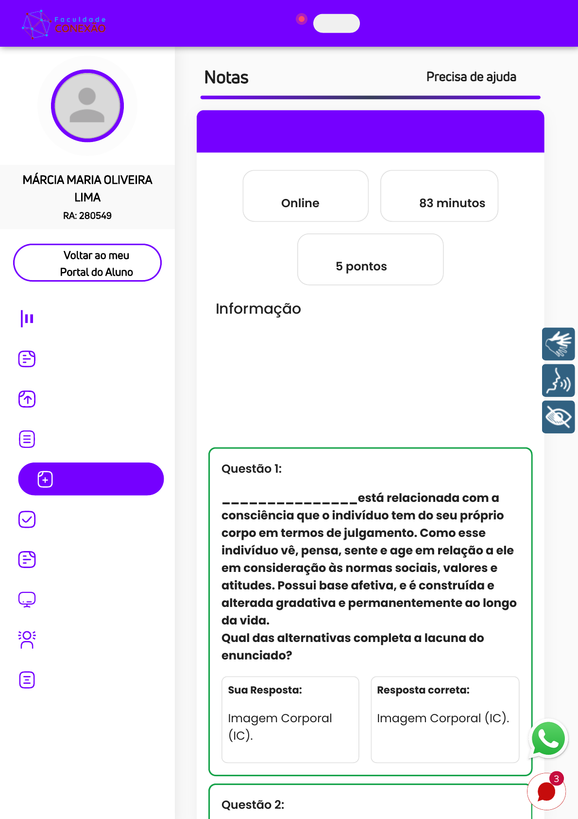 Notas Precisa de ajuda Rever Avaliação Introdução à Psicomotricidade Tipo de avaliação Online Tempo utilizado 83 minutos Sua nota de avaliação 5 pontos Informação A contestação da questão poderá ser feita em até 7 dias após a realização da avaliação, clicando em "contestar questão", após este prazo não será mais permitido realizar a contestação. Descreva o porquê não concorda com o gabarito de cada questão baseando-se no material didático fornecido. Questão 1: _______________está relacionada com a consciência que o indivíduo tem do seu próprio corpo em termos de julgamento. Como esse indivíduo vê, pensa, sente e age em relação a ele em consideração às normas sociais, valores e atitudes. Possui base afetiva, e é construída e alterada gradativa e permanentemente ao longo da vida. Qual das alternativas completa a lacuna do enunciado? Sua Resposta: Imagem Corporal (IC). Resposta correta: Imagem Corporal (IC). Questão 2: Voltar ao meu Portal do Aluno MÁRCIA MARIA OLIVEIRA LIMA RA: 280549 Início Carteirinha Estudantil Disciplinas Avaliações Minhas Notas Agenda Educacional TCC Curso Preparatório Simulados Biblioteca Sair 3 https://alunos.institutoprominas.com.br/meus-cursos https://ava.institutoprominas.com.br/dashboard https://ava.institutoprominas.com.br/carteirinha-estudante https://ava.institutoprominas.com.br/disciplines https://ava.institutoprominas.com.br/atividades https://ava.institutoprominas.com.br/notas https://ava.institutoprominas.com.br/agenda-educacional javascript:; https://ava.institutoprominas.com.br/preparatorio https://ava.institutoprominas.com.br/simulados javascript:; https://alunos.institutoprominas.com.br/ https://alunos.institutoprominas.com.br/ https://alunos.institutoprominas.com.br/ https://ava.institutoprominas.com.br/ À resistência de um músculo à distensão ou um movimento passivo e está presente tanto nos músculos em repouso como em movimento, dá- se o nome de: Sua Resposta: Tônus. Resposta correta: Tônus. Questão 3: Sobre as finalidades da Psicomotricidade, assinale a alternativa correta: Sua Resposta: Busca mobilizar e reorganizar as funções psíquicas emocionais e relacionais. Resposta correta: Todas as afirmativas correspondem às finalidades da Psicomotricidade. Questão 4: Negrine (1983) estabeleceu uma relação muito estreita entre lateralidade destra e linguagem. O fato dos centros da linguagem se encontrarem localizados no hemisfério esquerdo explicaria, assim, os transtornos apresentados nessa esfera. Reflita, pondere e assinale a alternativa correta: Sua Resposta: n.d.a. (nenhuma das alternativas). Resposta correta: No caso do recém- nascido, a plasticidade diminui conforme a idade, tornando-se limitada ou até inexistente após a adolescência. Questão 5: Analise as afirmativas e assinale V para as verdadeiras e F para as falsas, em seguida marque a sequência correta: ( ) Considerar o gesto ou a linguagem corporal como forma de expressão do ser humano é um caminho para reconhecer a importância da atividade corporal no processo ensino- aprendizagem. ( ) Geralmente, as áreas de atuação do psicomotricista são a educação, clínica, consultoria, supervisão e pesquisa. ( ) A Psicomotricidade é uma prática pedagógica que visa contribuir para o desenvolvimento da criança no processo de ensino-aprendizagem, favorecendo apenas os aspectos físicos do educando. Sua Resposta: V-V-V Resposta correta: V-V-F Questão 6: A base de toda a coordenação dinâmica global é: Sua Resposta: Equilíbrio. Resposta correta: Equilíbrio. Questão 7: Teoricamente, a psicomotricidade compreende em síntese, um ramo de conhecimentos interdisciplinar onde se cruzam várias contribuições científicas, integrando vários conceitos. Relacione as colunas abaixo e assinale a alternativa correta: (1) Psicológicos (2) Psiquiátricos (3) Psicossomáticos ( ) dimensão imaginária do corpo, simbiótica e simbólica corporal. ( ) noção do inconsciente, emergência das pulsões, síndromes de despersonalização, membro fantasma, alucinações, anorexias mentais, hipocondrias. ( ) desenvolvimento psicomotor, gênese da noção do corpo, formação do caráter e da personalidade. Sua Resposta: 3-2-1 Resposta correta: 3-2-1 Questão 8: Analise as afirmativas abaixo e assinale a incorreta: Sua Resposta: A orientação do indivíduo em relação à gravidade, à superfície de suporte e aos objetos externos requer uma combinação entre aferências visuais, vestibulares e somato-sensoriais. Resposta correta: O esquema corporal é importante, mas não é indispensável para a formação da personalidade da criança. Questão 9: A educação psicomotora deve ser considerada como uma educação de base na escola primária, pois: I - Ela condiciona todos os aprendizados escolares II - Leva a criança a tomar a consciência de seu corpo, da lateralidade, a situar-se no espaço, a dominar seu tempo, a adquirir a coordenação de seus movimentos. III - Desenvolve principalmente a oralidade da criança Está(ão) correta(s): Sua Resposta: Resposta correta: As afirmativas I e II. As afirmativas I e II. Questão 10: Leia atentamente as afirmativas abaixo e assinale a alternativa correta: I – Psicomotricidade, portanto, é um termo empregado para uma concepção de movimento organizado e integrado, em função das experiências vividas pelo sujeito cuja ação é resultante de sua individualidade, sua linguagem e sua socialização. II – a Psicomotricidade é uma ciência mais profunda, que está relacionada ao processo de maturação, onde o corpo é a origem das aquisições cognitivas, afetivas e orgânicas, sendo, deste modo, sustentada por três conhecimentos básicos: o movimento, o intelecto e o afeto. III – é a ciência encruzilhada, onde se cruzam e se encontram múltiplos pontos de vista biológicos, psicológicos, psicanalíticos, sociológicos e linguísticos. Sua Resposta: Somente a afirmativa II é