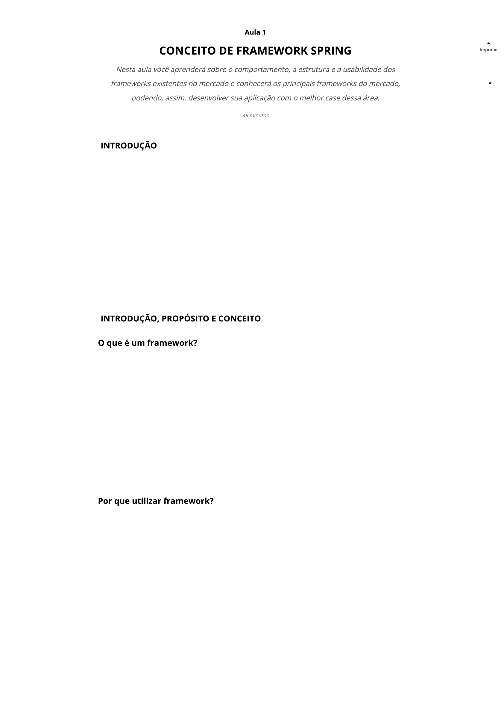 Nos dias atuais, é imprescindível a utilização de ferramentas que favorecem a programação de sistemas cada vez mais complexos. Para facilitar a compreensão e o reúso da codi�cação realizada por diversos programadores, surgiram estruturas, bibliotecas e ferramentas que estão sendo introduzidas para simpli�car o ciclo de desenvolvimento de software. Com o emprego de frameworks, pode-se criar aplicações complexas com alguns poucos comandos, por isso aprender a utilizá-los é muito importante para desenvolver códigos limpos e consistentes. Nesta aula você aprenderá sobre o comportamento, a estrutura e a usabilidade dos frameworks existentes no mercado e conhecerá os principais frameworks do mercado, podendo, assim, desenvolver sua aplicação com o melhor case dessa área. Um framework pode ser considerado uma estrutura ou plataforma para o desenvolvimento de aplicativos ou, ainda, um conjunto de códigos pré-escritos e usados por programadores para desenvolver programas em plataformas especí�cas. Essas estruturas podem incluir classes e funções prede�nidas com o objetivo de que o programador não precise criar o mesmo código cada vez que desenvolve um novo aplicativo (CHRISTENSSON, 2013). Um framework pode assumir uma forma de plataforma concreta ou conceitual, em que o código comum, com funcionalidade genérica, pode ser seletivamente especializado ou substituído pelos desenvolvedores. As estruturas assumem a forma de bibliotecas, onde uma interface de programa de aplicativo (API) bem de�nida é reutilizável em qualquer lugar dentro do software em desenvolvimento. O desenvolvimento de software é algo complexo e que deve requerer uma grande quantidade de tarefas, dentre elas a codi�cação, o design e o teste. Para a parte de códigos, os programadores devem ter cuidado com a sintaxe, as declarações, instruções, exceções e diversos outros parâmetros. Os frameworks para esses softwares facilitam tanto o desenvolvimento que lhes é permitido assumir o controle desse processo, ou seja, grande parte dele a partir de uma única plataforma. Vamos a algumas vantagens de se usar frameworks: • Processo de depuração fácil. • E�ciência de código aprimorada. • Fácil reutilização de código. • Desenvolvimento acelerado. • Segurança melhorada. Nesta aula você aprenderá sobre o comportamento, a estrutura e a usabilidade dos frameworks existentes no mercado e conhecerá os principais frameworks do mercado, podendo, assim, desenvolver sua aplicação com o melhor case dessa área. 49 minutos Imprimir V er a n o ta çõ es A principal diferença entre uma biblioteca e um framework é a "inversão de controle". Ao chamar um método de biblioteca, assume-se que você está no controle. Mas, com um framework, o controle é invertido: ele é que chama você. Em um framework, todo o �uxo de controle já está lá e há muitos pontos brancos prede�nidos que devem ser preenchidos com código. Um framework normalmente é mais complexo e pode conter várias bibliotecas; ele de�ne um esqueleto, que deverá ser preenchido pelo aplicativo, o qual de�ne seus próprios recursos para isso. Já uma biblioteca executa operações especí�cas e bem de�nidas, uma vez que é apenas uma coleção de de�nições de classe. O motivo é simplesmente a reutilização do código, ou seja, obtém o código que já foi escrito por outros desenvolvedores. O vídeo apresentará a linguagem de programação Java juntamente com alguns ambientes para programação da linguagem como o NetBeans e o Intellij. Posteriormente, serão apresentados os sites para download de ambas as ferramentas e uma breve introdução ao que se refere o Spring utilizando o próprio site do software para exempli�cação. Antigamente, a programação de computador envolvia o uso da linguagem certa. Entre sistemas como C, Lisp e Pascal, os programadores podiam escolher sua especialidade e formato. No entanto, as diferenças entre as linguagens de programação foram amplamente corrigidas com o aumento do poder de computação, que permite que os sistemas entendam e se movam facilmente entre todas as linguagens. Hoje, o foco está nos frameworks, que tendem a ser mais modernos e com visão de futuro e que podem superar muitas das práticas desatualizadas das linguagens de programação. Frameworks são conjuntos coesos de código de biblioteca que simpli�cam a programação em qualquer linguagem (sintaxe e gramática reais para escrever um código). Esses frameworks vêm com uma série de vantagens. Embora as linguagens de programação nunca sejam completamente obsoletas, um número crescente de programadores opta por trabalhar com frameworks e vê-los como a opção mais moderna e de ponta por uma série de razões. A mudança em direção ao framework faz parte da transformação da Tecnologia da Informação (TI), que certamente ganhará força nos próximos anos. Graças aos sistemas automatizados, ter um conhecimento profundo de várias linguagens de programação simplesmente não é tão importante quanto antes. Os erros podem ser corrigidos automaticamente através dos vários programas que estão constantemente procurando por erros de codi�cação. Assim, em vez de gastar tempo examinando os detalhes minuciosos de um código, os frameworks permitem que os programadores pensem no cenário maior. Com uma melhor compreensão do que os sistemas e APIs são capazes e com sistemas automatizados para cuidar dos detalhes mais tediosos, os programadores podem se esforçar mais para transformar seus programas em algo maior com mais recursos e potencial de alto nível. Uma das partes mais importantes do uso de uma linguagem de programação é compreender os algoritmos e certi�car-se de que o código se encaixa neles. No entanto, os algoritmos podem ser limitados pela linguagem, porque são realmente de�nidos pelos frameworks. Alterar e estabelecer algoritmos como parte Videoa