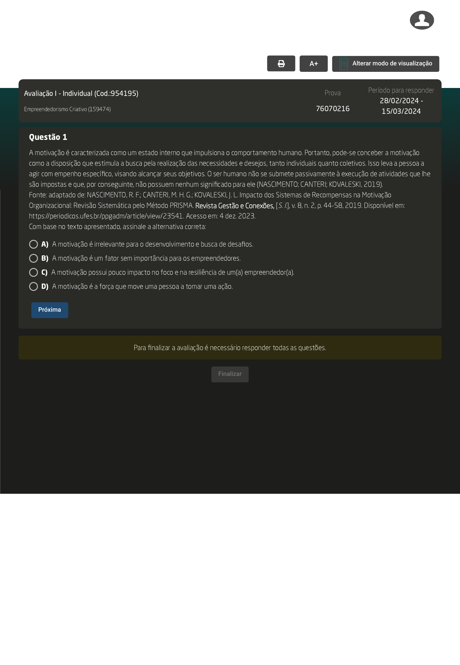 29/02/24, 17:34 AVA https://ava2.uniasselvi.com.br/subject/grades-and-tests/answer/eyJ0ZXN0Ijp7InRlc3RDb2RlIjoiOTU0MTk1IiwiZGVzY3JpcHRpb24iOiJBdmFsaWHDp8OjbyBJIC0gSW5kaXZpZHVhbCIsInBhcmFtZXRlciI6MTgzMjIwL… 1/1 RESPONDER AVALIAÇÃO Avaliação I - Individual (Cod.:954195) Empreendedorismo Criativo (159474) Prova 76070216 Período para responder 28/02/2024 - 15/03/2024 Questão 1 A motivação é caracterizada como um estado interno que impulsiona o comportamento humano. Portanto, pode-se conceber a motivação como a disposição que estimula a busca pela realização das necessidades e desejos, tanto individuais quanto coletivos. Isso leva a pessoa a agir com empenho específico, visando alcançar seus objetivos. O ser humano não se submete passivamente à execução de atividades que lhe são impostas e que, por conseguinte, não possuem nenhum significado para ele (NASCIMENTO; CANTERI; KOVALESKI, 2019). Fonte: adaptado de: NASCIMENTO, R. F.; CANTERI, M. H. G.; KOVALESKI, J. L. Impacto dos Sistemas de Recompensas na Motivação Organizacional: Revisão Sistemática pelo Método PRISMA. Revista Gestão e Conexões, [S. l.], v. 8, n. 2, p. 44-58, 2019. Disponível em: https://periodicos.ufes.br/ppgadm/article/view/23541. Acesso em: 4 dez. 2023. Com base no texto apresentado, assinale a alternativa correta: Para finalizar a avaliação é necessário responder todas as questões. VOLTAR A+ Alterar modo de visualização A) A motivação é irrelevante para o desenvolvimento e busca de desafios. B) A motivação é um fator sem importância para os empreendedores. C) A motivação possui pouco impacto no foco e na resiliência de um(a) empreendedor(a). D) A motivação é a força que move uma pessoa a tomar uma ação. Próxima Finalizar Leticia Orlandina Luciano Sagas Pedagogia (5454227)