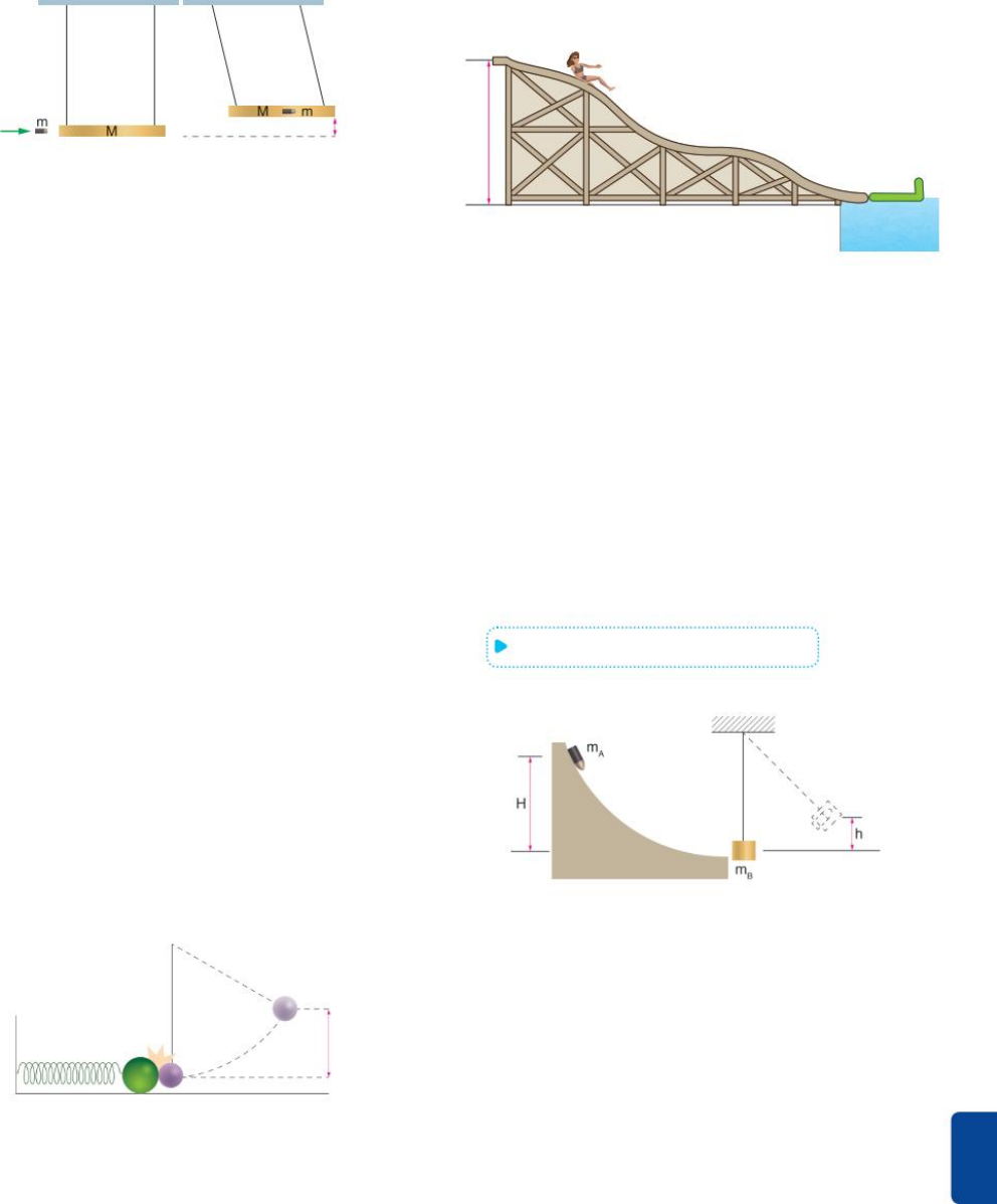 F R E N T E 1 33 63 UFSC Um pêndulo balístico é um aparato experimental que permite determinar a velocidade de um projétil. Na figura I, estão representados o projétil de massa m e velocidade inicial v 1 , bem como um bloco de massa M, inicialmente em repouso. Após o impacto, o projétil se aloja no bloco e este se eleva a uma altura máxima y, conforme representação na figura II. Figura I Figura II y � iv Assinale a(s) proposição(ões) correta(s). 01 O projétil, logo após se alojar no interior do bloco, perde toda a sua energia cinética e toda a sua quantidade de movimento. 02 O sistema formado pelo projétil mais o bloco atingirá uma altura máxima, à direita, a qual de- penderá da velocidade inicial do projétil. 04 Sendo a colisão característica deste processo perfeitamente inelástica, haverá perda de ener- gia cinética. 08 É impossível aplicar a lei de conservação da quan- tidade de movimento ao processo apresentado. 16 Utilizando-se o princípio de conservação da energia mecânica, pode-se calcular a altura máxi ma atingida pelo bloco de massa M. 32 A energia cinética inicial é igual à metade da energia cinética nal para o processo dado. 64 O sistema formado pelo projétil mais o bloco atin girá uma altura máxima, à direita, que dependerá das massas M e m. Soma:�� 64 UFRJ Uma esfera de massa igual a 100 g está sobre uma superfície horizontal sem atrito, e prende-se à extremidade de uma mola de massa desprezível e constante elástica igual a 9 N/m. A outra extremidade da mola está presa a um suporte fixo, conforme mos- tra a figura a seguir. Inicialmente, a esfera encontra-se em repouso e a mola no seu comprimento natural. A esfera é então atingida por um pêndulo de mesma massa que cai de uma altura igual a 0,5 m. Suponha a colisão elástica e g = 10 m/s2. M 0,5 mM Calcule: a) as velocidades da esfera e do pêndulo imediata- mente após a colisão. b) a compressão máxima da mola. 65 UFG A figura adiante mostra uma pessoa com massa de 60 kg que desliza, sem atrito, do alto de um tobo- gã de 7,2 m de altura (ponto A), acoplando-se a um carrinho com massa de 120 kg, que se encontra em repouso no ponto B. A partir desse instante, a pessoa e o carrinho movem-se juntos na água até parar. Con- sidere que a força de atrito entre o carrinho e a água é constante e que o coeficiente de atrito dinâmico é 0,10. A aceleração gravitacional local é 10 m/s2. A B 7,2 m a) Calcule a velocidade do conjunto pessoa-carri- nho, imediatamente após o acoplamento. b) Calcule a distância percorrida na água pelo con- junto pessoa-carrinho até parar 66 UFG Um corpo cilíndrico pontiagudo de massa mA desliza por uma rampa sem atrito, a partir da altura H, e, no final da rampa, já na horizontal, colide com outro corpo de massa mB suspenso por um fio de massa desprezível, inicialmente em repouso. Após a colisão, os corpos permanecem unidos e sobem juntos até uma altura h acima da posição do choque, conforme ilustrado na figura. Dados: mA = 0,5 kg; mB = 1,5 kg; H = 80 cm. a) Qual é o valor de h? b) Que fração da energia inicial é dissipada na co- lisão? 67 UFRJ Dois pêndulos com fios ideais de mesmo com- primento b estão suspensos em um mesmo ponto do teto Nas extremidades livres do fio, estão pre- sas duas bolinhas de massas 2m e m e dimensões desprezíveis. Os fios estão esticados em um mesmo plano vertical, separados e fazendo, ambos, um ân- gulo de 60° com a direção vertical, conforme indica a figura. FÍSICA Capítulo 11 Impulso, quantidade de movimento, colisões, centro de massa e análise dimensional34 60°60° b b 2m m Em um dado momento, as bolinhas são soltas, descem a partir do repouso e colidem no ponto mais baixo de suas trajetórias, onde se grudam instantaneamente, formando um corpúsculo de massa 3m. a) Calcule o módulo da velocidade do corpúsculo imediatamente após a colisão em função de b e do módulo g da aceleração da gravidade. b) Calcule o ângulo θ que o fio faz com a vertical no momento em que o corpúsculo atinge sua altura máxima. 68 ITA Na figura, temos uma massa M = 132 g, inicial- mente em repouso, presa a uma mola de constante elástica k = 1,6 ⋅ 104 N/m, podendo se deslocar sem atrito sobre a mesa em que se encontra Atira-se uma bala de massa m = 12 g, que encontra o bloco horizontalmente, com uma velocidade v0 = 200 m/s, incrustando-se nele. Qual é a máxima deformação que a mola experimenta? A 25 cm 50 cm C 5,0 cm 1,6 m Nenhum dos resultados anteriores. 69 FEI Um corpo A, de massa 2,0 kg, é lançado com velo- cidade v0 = 4,0 m/s num plano horizontal liso, colidindo com a esfera B, de massa 5,0 kg. A esfera, inicialmen te parada, suspensa por um fio ideal de comprimento L e fixo em O, atinge a altura máxima H = 0,20 m após a colisão. Adote g = 10 m/s2. A L v 0 O H B B a) Qual a velocidade da esfera B imediatamente após o choque? b) Qual o módulo e o sentido da velocidade do cor po A após a colisão? c) Qual a perda de energia cinética no choque? 70 Cesgranrio Na figura a seguir, a bolinha do pêndulo de massa m parte do repouso na horizontal. Ao passar pelo ponto mais baixo de sua trajetória, a bolinha coli- de frontal e elasticamente com um carrinho de massa 2m, inicialmente em repouso e apoiado em um trilho que é horizontal naquela região. Depois do choque, o carrinho se desloca sem atrito ao longo do trilho e sobe até uma determinada altura máxima H. m 2m L H O valor de H é: A L L 2 C L 4 2L 3 2 3 L 2 71 Mackenzie Um pequeno tubo de ensaio está suspen- so por um fio ideal, de comprimento 0,50 m, que tem uma extremidade presa ao pino O. O tubo de 100 g está cheio de gás e está fechado por uma rolha de 50 g. Aquecendo o tubo, a rolha salta com velocidade de módulo v. O A menor velocidade v da rolha que faz com que o tubo descreva uma volta completa em torno de O é: Despreze a massa do gás. A 2,0 m/s 4,0 m/s C 5,0 m/s 8,0 m/s 10,0 m/s 72 ITA Uma bala de mass