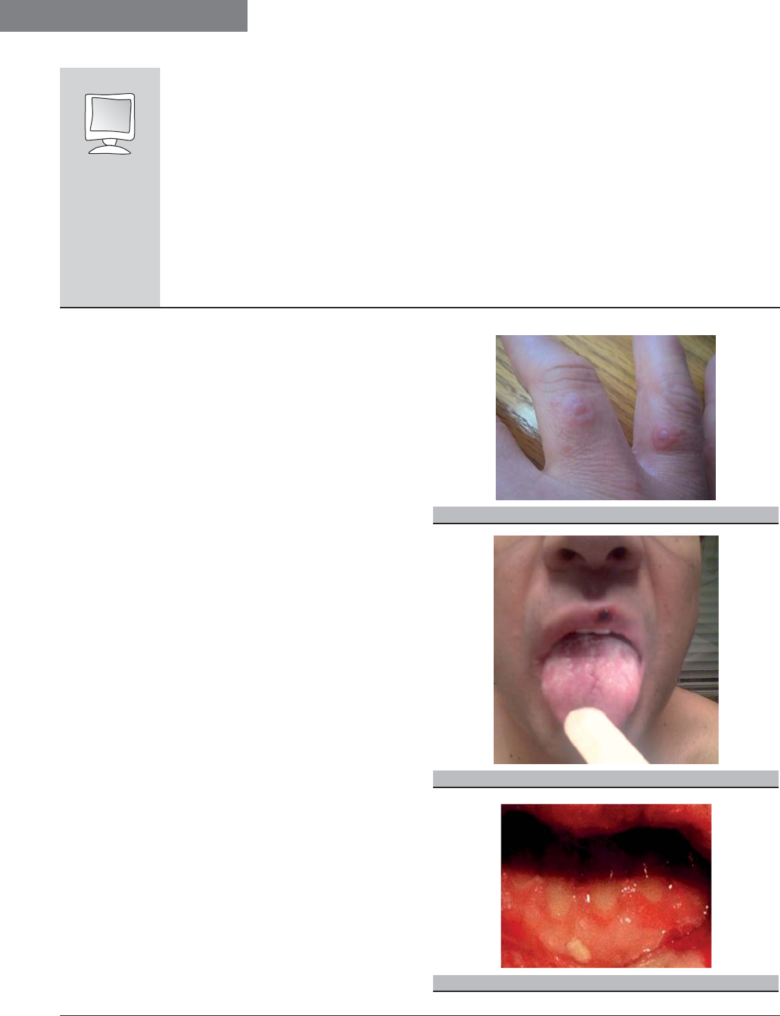 Casos Clínicos A propósito de un caso Casos Clínicos 169 Lesiones en piel y mucosa bucal Ana Sampayo Montenegro Médico especialista en medicina Familiar y Comunitaria. Área Sanitaria de A Coruña. Ángel Núñez Vázquez Médico especialista en medicina Familiar y Comunitaria. S.A.P. San José-B. Unidade Docente Área sanitaria de A Coruña. Manuel Almagro Sánchez Servicio de Dermatología. Complejo Hospitalario Universitario A Coruña. Paciente varón de 40 años de edad. Motivo de Consulta: lesiones en piel y mucosa bucal Antecedentes Patológicos: No alergias medicamentosas conocidas. Resto sin interés. Historia Actual: Acude al servicio de urgencias por lesiones doloro- sas en la mucosa bucal. Una semana antes de su visita presentó una lesión vesiculosa en labio superior que evolucionó a costra, en días posteriores comienza con lesiones eritematosas, ligeramente sobre- elevadas y morfología en diana. Localizadas en ambas palmas de las manos, superficies extensoras de codos y rodillas. Además presentó lesiones dolorosas en la boca que empeoran progresivamente afec- tando a mucosa yugal con depapilación de superficie lingual. El paciente padeció un cuadro similar, autolimitado, 2 años antes que se trató con clorhexidina bucal y mupirocina tópica. PREGUNTAS 1.- ¿Qué padece este paciente? a. Exantema vírico b. Reacción cutánea a medicamentos c. Eritema multiforme d. Gingivoestomatitis herpética e. Sífilis secundaria 2.- ¿Qué tratamiento realizarías? a. Corticoides orales b. Corticoides tópicos c. Antisépticos bucales d. Antibióticos Cad Aten Primaria Ano 2009 Volume 16 Páx. 169-169 Admitido para publicación en decembro 2008 FIGURA 1 FIGURA 2 FIGURA 3 www. agamfec .com 170 Casos Clínicos Varón de 25 años con placas eritemato-violáceas en extremidades Lourdes Navia Ruiz Residente de Medicina Familiar y Comunitaria. Complejo Hospitalario Arquitecto Marcide-Novoa Santos. Área Sanitaria de Ferrol. Benigno Monteagudo Sánchez Servicio de Dermatología. Complejo Hospitalario Arquitecto Marcide-Novoa Santos. Área Sanitaria de Ferrol. Miguel Cabanillas González Servicio de Dermatología. Complejo Hospitalario Arquitecto Marcide-Novoa Santos. Área Sanitaria de Ferrol. Elvira León Muiños Residente de Pediatría. Complejo Hospitalario Arquitecto Marcide-Novoa Santos. Área Sanitaria de Ferrol. Rosa Romarís Barca Residente de Pediatría. Complejo Hospitalario Arquitecto Marcide-Novoa Santos. Área Sanitaria de Ferrol. Alba Corrales Santos Residente de Pediatría. Complejo Hospitalario Arquitecto Marcide-Novoa Santos. Área Sanitaria de Ferrol. Iria Carballeira Residente de Pediatría. Complejo Hospitalario Arquitecto Marcide-Novoa Santos. Área Sanitaria de Ferrol. Cad Aten Primaria Ano 2009 Volume 16 Páx. 170-170 Casos Clínicos Varón de 25 años con placas eritemato-violáceas en extremidades ANTECEDENTES PERSONALES: Varón de 25 años de edad, homosexual, con el antecedente perso- nal de asma en la infancia. ENFERMEDAD ACTUAL: Ingresado en el Servicio de Medicina Interna por un cuadro de males- tar general y fiebre de 1 mes de evolución. Presentaba lesiones asin- tomáticas en extremidades de más de 2 meses de evolución que no había tratado previamente. EXPLORACIÓN FÍSICA: A la exploración dermatológica se observaron placas y pápulas erite- mato-violáceas, de 3 a 15 mm de diámetro, con bordes netos y superficie lisa, localizadas de manera bilateral en piernas y antebra- zos (figura 1). En el resto de la superficie cutánea, mucosa oral o genital, no se apreciaron lesiones similares. De forma concomitante se apreciaron condilomas acuminados en pene, moluscos contagio- sos en ingles, úlcera herpética crónica a nivel perianal y tiña subun- gueal proximal en varias uñas de los pies. EXPLORACIONES COMPLEMENTARIAS: Se realizó una biopsia de una de las lesiones cutáneas de rodilla derecha, cuyo estudio histopatológico mostró en la dermis un nódu- lo mal delimitado constituido por células fusiformes entre las que se aprecian espacios vasculares sin endotelio en forma de hendiduras y ocasional extravasación de hematíes (figura 2). ANTE ESTA SITUACIÓN, ¿DIAGNÓSTICO Y ACTITUD? Correspondencia: Benigno Monteagudo Sánchez. Hospital Arquitecto Marcide. C/San Pedro de Leixa, S/N. 15403 Ferrol. benims@hotmail.com Admitido para publicación en decembro 2008 FIGURA 1 FIGURA 2 www. agamfec .com Casos Clínicos Mujer de 75 años con mareo y palpitaciones Casos Clínicos 171 Mujer de 75 años con mareo y palpitaciones Naya Cendón, Chelo. Médico Especialista en Medicina Familiar y Comunitaria del PAC de Culleredo. Área sanitaria de A Coruña. Rodríguez de la Iglesia, Miguel A. Médico especialista en Medicina Familiar y Comunitaria del Centro de Salud de Sada. Área sanitaria de A Coruña. Blanco Rodríguez, Elena. Médico Especialista en Medicina Familiar y Comunitaria del Centro de Salud de Culleredo. Área sanitaria de A Coruña. ANTECEDENTES PERSONALES: Mujer de 75 años, con antecedentes de histerectomía y anexectomía, osteoporosis, insuficiencia venosa en miembros inferiores y lupus eri- tematoso bien controlado. ENFERMEDAD ACTUAL: La paciente acude al PAC por presentar de forma ocasional desde hace 3 meses, episodios de palpitaciones y sensación de mareo inespecífico sin otra sintomatología acompañante, que se hacen más intensos los últimos 4 días. EXPLORACIÓN FÍSICA: A la exploración la paciente está discretamente ansiosa, con TA 130/70 y la auscultación cardiopulmonar rítmica, sin soplos y con aumento ocasional de la frecuencia cardiaca. PRUEBAS COMPLEMENTARIAS: Se le realiza EKG y se obtiene la siguiente tira de ritmo (figuras 1 y 2): ANTE ESTA SITUACIÓN, ¿CUÁL ES EL DIAGNÓSTICO Y ACTITUD SEGUIR? Cad Aten Primaria Ano 2009 Volume 16 Páx. 171-171 Correspondencia: Chelo Naya Cendón Lg/ Peteiro, Nº17 B. 15166 Bergondo (A Coruña). Mail: chelo.naya.cendon@gmail.com Admitido para publicación en decembro 2008 FIGUR