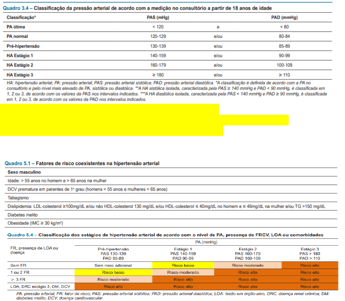 MARIA CLARA GREGOLINI MANEJO HIPERTENSÃO ARTERIAL 1) DIAGNÓSTICO SE PA≥ 180/110 → DIAGNÓSTICO DE HAS (com uma aferição) Se PAS 140 – 180 OU PAD 80 – 110 → MAPA ou MRPA ou 2ª Aferição consultório *MAPA ou MRPA – PSM ≥130 / PDM≥80 → DIAGNÓSTICO HAS 2) ESTRATIFICAÇÃO DE RISCO HAS FATORES DE RISCO: idade, tabagismo, dislipidemia (LDL >100 ou TRI >150), DM, HF positiva para DAC precoce). ♡ Fatores de risco adicionais • sexo masculino • idade (homem>55 e mulher 65) • HF de DAC prematura (infarto ou stent ou revascularizacao em H<55 e M<65) • Tabagismo • DLP (CT>190 ou LDL>100 ou HDL <40/46 ou TRI>150) • Resistência insulinica ou pre-DM (GJ entre 100 e 125, glicada entre 5,7 e 6,4% ou TTOG entre 140 e 200) • Obesidade ( IMC>30 ou Circunferência abdom >102 (H) é 88 (M) E agora procurar LOA (lesão de órgão alvo) - VERMIH ▪︎ V - VOP >10 (esquece) ▪︎ Emi positiva ▪︎ Ritmo filtração glomerular <60 ▪︎Microalbuminuria (30 a 300) ou relação alb/creatina entre 30 e 300 ▪︎ Índice tornozelo-braquial <0,9 pela de periferica ▪︎Hve (ECG ou ECO) MARIA CLARA GREGOLINI 3) META DA PA Risco alto –> 120 - 129 / 70 - 79 Médio/baixo risco –> 140/90 Exceção: Se E3 sem fator de risco – meta 140/90 4) TRATAMENTO MARIA CLARA GREGOLINI 1. IECA * / BRA * *NÃO podem ser usados na IRA (poupam potássio) IECA → ICC (captopril 25 mg 8/8hr | enalapril 10 ou 20mg 12/12hr) BRA → PA (losartana 50 mg 12/12hr) 2. BCC ANLODIPINO (5mg 12/12hr) NIFEDIPINA (GESTANTE)... Efeito colateral: edema de tornozelo/edema MMII -> suspender medicação 3. DIURÉTICOS TIAZÍDICOS – HIIDROCLOROTIAZIDA (não pode se nAC. URICO, não pode se nTRIG). ESPIRONOLACTONA * (dose inicial 25mg 1x dia) 4. VASODILATADOR DIRETO HIDRALAZINA (GESTANTE) NITRATO 5. BETA BLOQUEADOR Usado se: ICFER (FE≥50%), DAC, TAQUIARRITIMIAS, HAS + CEFALEIA, TREMOR ESSENCIAL, CIRROSE HEPÁTICA... 6. VASODILATADOR DIRETO CENTRAL METILDOPA (GESTANTE) CLONIDINA – ATENSINA podem ser usados associados MARIA CLARA GREGOLINI 5) ESTRATIFICAÇÃO RISCO CARDIOVASCULAR Cálculo do risco cardiovascular pelo aplicativo. Avaliar meta do LDL. Avaliar LDL do paciente – se necessário medicar com estatina. LDL = CT – HDL – (TRIG/5) ***PARA TRIG ≤ 400 EXAMES: HAS: CT HDL LDL * TRIG GLIC JEJUM CREATININA TFG POTÁSIO ÁC. ÚRICO URINA TIPO 1 + ECG DISLIPIDEMIA: CT HDL LDL* TRIG TGO TGP CPK TOTAL DIABETES: GLIC JEJUM HB GLICOSADA CT TRIG CREATININA URINA 1 HIPO/HIPER TIREOIDISMO: TSH T4L HOMEM > 70: PSA MULHER MENOPAUSA: VIT D O QUE MAIS PODE SER PEDIDO: HEMOGRAMA. Retorno: vai depender do risco do paciente (ver, amarelo, vermelho). CARDIO 2 (sem.29 ) Hipertensão Arterial Sistêmica * De�nição ∙ Níveis médios de PA que conferem risco signi�cativo de eventos cardiovasculares (IAM, AVC...) ∙ Primária / idiopática (90-95% dos casos) ∙ Secundária (5 – 10% dos casos) * Semiologia da PA ∙ 3 – 5 minutos em repouso ∙ Sentado, com os pés no chão ∙ Braço na altura do coração ∙ Bexiga vazia ∙ Sem: cigarro por 30 minutos, exercício por 60 minutos → Sons de Korotko� 1. Som nítido (PA sistólica – 1° som de Korotko�) 2. Som suave 3. Som ampli�cado 4. Som abafado 5. Desaparece (PA diastólica - 2° som de Korotko� ) * Diagnóstico Consultório > 140 x 90 mmHg (2 consultas diferentes, com 2 medidas em cada) > 180 x 110 mmHg (Apenas 1 consulta) MAPA > 130 x 80 mmHg (24 horas) > 135 x 85 mmHg (vigília) > 120 x 70 mmHg (sono) MRPA > 135 x 85 mmHg (3 medidas manhã e 3 a tarde, por 5 dias consecutivos) (A média deve ser > 135 x 85) LOA especí�ca da HAS Obs.: Diretriz Americana: > 130 x 80 mmHg (questões são claras no enunciado!) → HAS jaleco branco x HAS mascarada ∙ HAS jaleco branco: não tem, mas parece (paciente ansioso no consultório) ∙ HAS mascarada: tem, mas não parece (paciente tranquilo no consultório) * Lesões de órgão alvo (LOA) ∙ ❤Coração o Coronariopatia o Cardiopatia hipertensiva: HVE, IC ∙ Cérebro o Doença cérebro vascular isquêmica ou hemorrágica (microaneurismas cerebrais) o Demência vascular (microinfartos cerebrais) ∙ Retina (retinopatia hipertensiva) o Classi�cação de Keith-Wagener ▪ Grau 1: Estreitamento arteriolar ▪ Grau 2: Cruzamento artério-venoso patológico ▪ Grau 3: Hemorragias e exudatos retinianos ▪ Grau 4: Edema de papila o Alterações crônicas do fundo de olho o Alterações agudas do fundo de olho (Emergência hipertensiva) ∙ Rim (nefropatia hipertensiva) ∙ Doença arterial periférica – DAOP (especialmente de MMII) Claudicação intermitente * Classi�cação Classi�cação PAS PAD Terapêutica Inicial Normal < 120 < 80 Reavaliar em 1 ano Pré-HAS 121 81 Tratamento não farmacológico HAS Estágio I 140 90 Início com 1 droga (monoterapia) Obs.: se risco CV baixo, pode-se tentar MEV por 3-6 meses HAS Estágio II 16 – 179 100 Início com 2 drogas (associação) HAS Estágio III > 180 > 110 1° linha: tiazídico, BCC, IECA (pril), BRA-II (sartan). 2° linha: BB (deve ser prescrito somente para pacientes que tem outra doença que justi�que o uso do BB (ICC, coronariopata)), alfa-bloqueador (para HPB), clonidina (efeito sedativo), metildopa, espironolactona, hidralazina, alisquireno ... ● Não associar IECA e BRA-II: agem de modo muito parecido, ↑ EC, não traz benefícios. Obs.: Considerar o valor que se enquadra em estágio mais grave (ex.: 160 x 92 é HAS estágio II) Exceções ● Pré-HAS ○ Alto risco CV: iniciar 1 droga se não melhorar em 3m ● HAS I ○ Baixo risco CV: tto não farmacológico por 3m ○ Alto risco CV: início com 2 drogas ● HAS II ○ Grande idoso (> 80 anos, frágil): início com 1 droga (evitar grande variação pressórica - hipotensão) * Tratamento Obs.: Risco cardiovascular elevado: ● DRC ● DM ● Dç cardiovascular (AVE, ICC, coronariopatia) ● Risco de dç cardiovascular em 10 anos > 10% → Metas / PA alvo ∙ Geral: < 140 