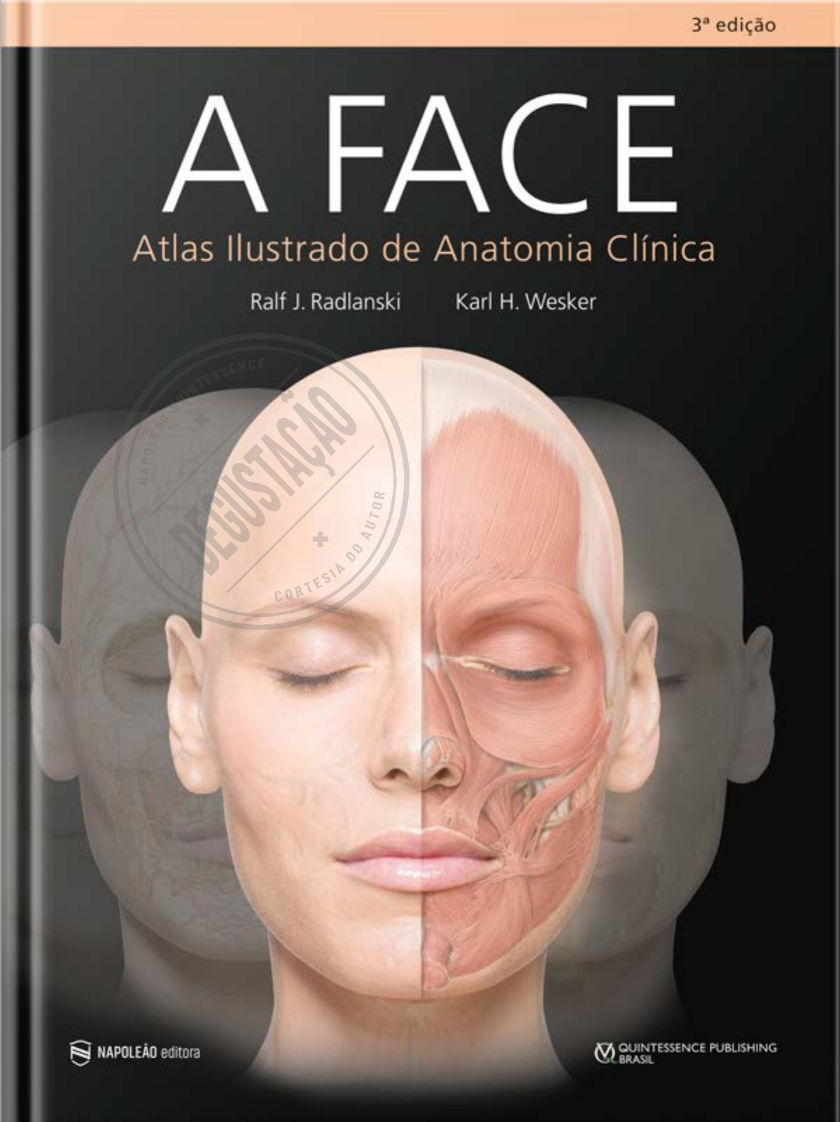 SUMÁRIO 1. A FACE 2. A REGIÃO ORBITAL 3. A REGIÃO NASAL E MÉDIO-FACIAL 4. A BOCA 5. OUVIDO 6. A PELE E O ENVELHECIMENTO DA FACE Região parietal Região temporal Região infratemporal Região nasal Região zigomática Região oral Região parotideo-massetérica Região mentoniana Região esternocleidomastóidea Região cervical lateral Região frontal Região orbital Região auricular Região Infraorbital Região bucal Triângulo omotraqueal Região cervical posterior Região nasal Região zigomática Região infratemporal Região orbital Região frontal Região Infraorbital Região oral Região bucal Região parotídeo-massetérica Região mentoniana Triângulo submentoniano Triângulo submandibular Triângulo omotraqueal Região parietal Região temporal Região occipital Região auricular Região mastoide Fossa retromandibular Região esternocleidomastóidea Região cervical posterior Triângulo carotídeo Vértebra proeminente (C7) Região cervical lateral Fig 1-3 Regiões da cabeça e do pescoço em vista anterior. Fig 1-4 Regiões da cabeça e do pescoço em vista lateral. 1.1.2 Regiões da Face A face 4 Região temporal Região mastoide Região parotídeo-massetérica Região esternocleidomastóidea Região cervical lateral Região auricular Região parietal Região occipital Região posterior cervical Vértebra proeminente (C7) Região orbital Região infraorbital Região zigomática Região auricular Região parotídeo-massetérica Triângulo submandibular Triângulo carotídeo Região esternocleidomastóidea Região cervical lateral Fossa supraclavicular maior Região oral Região bucal Região mentoniana Triângulo submental Triângulo omotraqueal Fossa jugular Fossa supraclavicular menor Fig 1-5 Regiões do pescoço e da face em vista anterior. Fig 1-6 Regiões da cabeça e do pescoço em vista dorsal. Introdução 5 Galea aponeurotica Occipitofrontal, ventre frontal Prócero Orbicularis ocul ROOF (gordura retroorbicular do olho) Músculo elevador do lábio superior e da asa do nariz Nasal Zigomático menor Elevador do lábio superior Elevador do ângulo da boca Zigomático maior Orbicular da boca Masseter Depressor do lábio inferior Mentoniano Temporoparietal SOOF (gordura suborbicular do olho) ROOF (gordura retroorbicular do olho) Osso zigomático, arco zigomático Mandíbula Glândula parótida Compartimento de gordura bucal (de Bichat) Duto parotídeo Compartimento de gordura submentoniana Corpo de gordura da glabela Fig 1-28 A metade direita da face mostra a camada de gordura subcutânea removida e a gordura da bochecha exposta. Metade esquerda da face mostra o músculo orbicular do olho removido e a gordura retro-orbicular do olho (ROOF), gordura suborbicular do olho (SOOF) e compartimentos de gordura bucal expostos. A face 24 A relação entre os compartimentos de gordura e os múscu- los faciais foi o principal tópico da seção anterior. Nas figuras a seguir, os próprios músculos faciais serão abordados direta- mente, começando novamente com as camadas musculares mais superficiais do rosto. Fig 1-29 O lado esquerdo da face mostra os músculos fa- ciais superficiais. O músculo occipitofrontal (visto aqui: ven- tre frontal) está conectado à resistente gálea aponeurótica. Os tratos fibrosos dos músculos depressores do supercílio ori- ginam-se da região da glabela e tornam-se concomitantes com as fibras musculares da região da sobrancelha. Algumas fibras musculares se fundem com o músculo orbicular do olho. Na re- gião da glabela, o músculo prócero se estende e corresponde às fibras do músculo occipitofrontal subjacente. O esqueleto cartilaginoso externo do nariz é coberto pelo músculo nasal, músculo dilatador nasal anterior e músculo compressor nasal menor. No limite entre o músculo orbicular do olho e o nariz, o músculo elevador do lábio superior e da asa do nariz segue um trajeto estreito, mas longo. Na região do lábio inferior, o mús- culo orbicular da boca é totalmente recoberto pelos músculos depressor do ângulo da boca e lábio inferior. O lábio superior é parcialmente sobreposto pelos músculos elevador do lábio superior e da asa do nariz, elevador do lábio superior e zigo- mático menor. No canto da boca, o músculo zigomático maior se insere junto com o músculo risório, com fibras que correm preferencialmente na horizontal. Ainda mais posteriormente, algumas extensões do músculo platisma percorrem a margem da mandíbula. A ponta do queixo é dominada pelo músculo mentoniano. Grande parte dos músculos da bochecha inferior e da região temporal ainda está coberta por uma fáscia sólida. O quiasma dos músculos faciais nos cantos da boca é denomi- nado modíolo. É formado pelos músculos orbicular da boca, bucinador, elevador do ângulo da boca, depressor do ângulo da boca, zigomático maior, risório e platisma. Fig 1-30 Assim que o platisma, o músculo risório e a fáscia na região da bochecha profunda são removidos na parte es- querda da face, a glândula parótida, o ducto parotídeo, o mús- culo masseter e a bola gordurosa de Bichat tornam-se expostos. Fig 1-31 Após a remoção da porção periférica do músculo orbicular do olho na metade esquerda da face, a inserção do músculo elevador do lábio superior na maxila torna-se visível. Além disso, na metade esquerda da face, os músculos zigomá- tico menor e maior e o músculo depressor do ângulo da boca são removidos. Como resultado, o trajeto do ducto parótico, que atravessa o músculo masseter, pode ser rastreado. Além disso, algumas partes da mandíbula se tornam visíveis. Fig 1-32 Na metade esquerda da face, o músculo de- pressor do supercílio foi removido para expor algumas par- tes do músculo corrugador do supercílio. Embora a maior parte desse músculo passe por baixo do ventre frontal do músculo occipitofrontal, suas fibras devem penetrar nesse músculo. A remoção completa do músculo orbicular dos olhos expõe o septo orbita