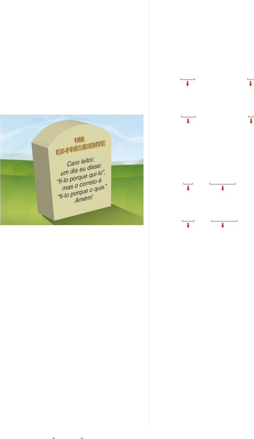 III. lho = lhe + o lha = lhe + a lhos = lhe + os lhas = lhe + as I. no-lo = nos + o no-la = nos + a no-los = nos + os no-las = nos + as II. vo-lo = vos + o vo-la = vos + a vo-los = vos + os vo-las = vos + as III. lho = lhes + o lha = lhes + a lhos = lhes + os lhas = lhes + as Trata-se de formas concisas: em uma só palavra, temos o objeto direto e o indireto. Eu vo-la dei. = Eu dei a vós (vo) a boneca (la). Eles mo deram. = Eles deram o chá (o) a mim (me). As formas lo, la, los, las e no, na, nos, nas Fig. 3 Emprego da forma lo. Quando o verbo terminar em r, s, z, os pronomes o, a, os, as receberão o l. Fiz o trabalho. = Fi-lo. Quis o serviço. = Qui-lo. Amar as flores. = Amá-las. Se terminado em ditongo nasal ou m, o pronome que segue deverá receber o acréscimo do n. Põe a mesa! = Põe-na! Amavam a melodia de Jobim. = Amavam-na. Recursos enfáticos e expressivos A língua apresenta vários recursos expressivos que utilizam os pronomes pessoais. Eis alguns deles: a. o objeto direto pleonástico: O amor, ela o procurou em todos os homens que teve. (amor = o) b. o anacoluto (quebra da sequência sintática): Eu me parece que o senhor está enganado. (Eu = me) c. o pronome tônico reforçando o átono: Que me importa a mim a glória? (me = a mim) d. o pronome de interesse me (sem função sintática): Você me anda com a Espingarda?! Como? Com isso, o enunciador revela seu interesse pelo ocor- rido; trata-se de um recurso expressivo. O paralelismo A norma exige concordância entre as pessoas do dis- curso; verbo e pronome precisam estar na mesma pessoa quando se referem a um mesmo interlocutor. Compare: Transgressão à norma Você é um bom garoto, eu te admiro. 3a pessoa 2a pessoa Obediência à norma Você é um bom garoto, eu o admiro. 3a pessoa 3a pessoa É frequente a falta de concordância quando o falante utiliza, concomitantemente, o imperativo e o pronome de tratamento você. Transgressão à norma Sai daqui, você está atrapalhando. 2a pessoa 3a pessoa Obediência à norma Saia daqui, você está atrapalhando. 3a pessoa 3a pessoa O desrespeito à norma deve ser tratado nesse caso como variante linguística (variante popular), visto que seu uso está cristalizado na maioria das regiões do país. Particularidades Eis algumas particularidades a respeito das pessoas gramaticais: a. plural de modéstia (primeira pessoa do plural no lugar da primeira do singular: evitar o tom impositivo). Nós explicamos na aula passada a teoria... b. plural majestático (primeira pessoa do plural no lugar da primeira do singular: símbolo de poder). Nós El-Rei fazemos saber. Celso Cunha. Gramática da Língua Portuguesa. c. fórmula de cortesia (terceira pessoa do singular no lu- gar da primeira do singular: por deferência). Danilo Gomes de Carvalho, aluno desta universidade, requer... d. pronome vós de cerimônia (segunda do plural no lu- gar da segunda pessoa do singular: polidez, apreço). Bem, bem! Escusai-me vós. Tendes razão, Duque. Celso Cunha. Gramática da Língua Portuguesa. LÍNGUA PORTUGUESA Capítulo 8 Sintaxe dos pronomes40 Texto para as questões de 1 a 4. O amor e o uso dos pronomes meu amor me presenteia com flores esquecidas na rua meu amor tem pesadelos para que eu durma quentinha meu amor é um urso com a pelúcia por dentro meu amor é meu : porque essa língua é surda nos enrosca e troça e só pensa nos possessivos. Ana Rüsche. Disponível em: <http://peixedeaquario.zip.net/ arch2007-01-01-2007-01-31.html>. Acesso em: 12 jun. 2010. 1 Identifique, na primeira estrofe, um pronome oblíquo átono e esclareça a quem ele se refere. 2 Em “para que eu durma”, observa-se o emprego de pronome pessoal do caso reto. Justifique seu empre- go do ponto de vista sintático. 3 Explique a ambiguidade em “meu amor é meu”. 4 A quem se refere o pronome oblíquo “nos” na segun- da estrofe? Texto para as questões de 5 a 9. Há quanto tempo eu vinha me procurando Quanto tempo faz, já nem lembro mais Sempre correndo atrás de mim feito um louco Tentando sair desse meu sufoco Eu era tudo que eu podia querer Era tão simples e eu custei pra aprender Daqui pra frente nova vida eu terei Sempre a meu lado bem feliz eu serei Eu me amo, eu me amo Não posso mais viver sem mim Como foi bom eu ter aparecido Nessa minha vida já um tanto sofrida Já não sabia mais o que fazer Pra eu gostar de mim, me aceitar assim Eu que queria tanto ter alguém Agora eu sei sem mim eu não sou ninguém Longe de mim nada mais faz sentido Pra toda vida eu quero estar comigo Eu me amo, eu me amo Não posso mais viver sem mim Foi tão difícil pra eu me encontrar É muito fácil um grande amor acabar, mas Eu vou lutar por esse amor até o fim Não vou mais deixar eu fugir de mim Agora eu tenho uma razão pra viver [...] Roger Rocha Moreira. “Eu me amo”. Intérprete: Ultraje a Rigor. In: Nós vamos invadir sua praia. Rio de Janeiro: Warner Chappell, 2001. CD. Faixa 9. 5 Em que medida a letra surpreende? Explique também do ponto de vista das pessoas gramaticais. 6 Passe o oblíquo átono para a terceira pessoa do singular: “Eu me amo” Revisando F R E N T E 1 41 7 Considere o excerto: “Foi tão difícil pra eu me encontrar” Embora pareça estar correta a frase, na realidade ela fere a norma no que tange ao emprego do pronome pessoal. Corrija e escreva em ordem direta. 8 Considere este outro excerto: “Não vou mais deixar eu fugir de mim” Reescreva a frase obedecendo à norma culta. 9 As transgressões à norma no texto em exame estão em conformidade com o contexto? Justifique. 10 Leia o texto a seguir. Então você me compra uma Ferrari com o dinheiro da herança de seu avô?! É, pai, é aquela música do Gonzaguinha: “Sonho meu...” Explique o efeito de sentido que o pronome dá à frase e ao diálogo. Exercícios propostos 1 Mackenzie Identifique a série de pronomes que com- pleta adequadamente as lacunas do seguinte período. Os desentendimentos existentes entre e advêm de um