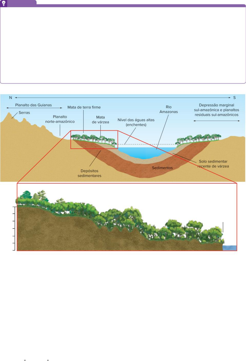 GEOGRAFIA Capítulo 7 Biogeografia106 A floresta y A Amaznia a maior floresta contínua do mundo, totalizando 40% das áreas de florestas pluviais tropicais do planeta. No Brasil, estende-se por cerca de 4 milhões de km². y 78% dos solos de terra firme so ácidos e com baixa fertilidade natural. y Temperatura mdia: 26 °C. A variaço da duraço dos dias ao longo do ano pequena, entre 30 e 50 minutos. y A quantidade anual de chuva na Bacia Amaznica cerca de 15 trilhões de m³. Dessa quantidade, todo o ecossistema amaznico utiliza e eva potranspira, em mdia, 48%; os outros 52%, ou seja, aproximadamente a metade, escoam pelos rios. y Na Amaznia existem cerca de 5 mil espcies de árvores (maiores que 15 cm de dimetro). Para efeitos de comparaço, em toda a Amrica do Norte existem cerca de 650 espcies de árvores. y A diversidade de árvores na Amaznia varia entre 40 e 300 espcies diferentes por hectare, sendo que na Amrica do Norte varia de 4 a 25. y Das 250 mil espcies de plantas superiores da Terra, 170 mil (68%) vivem exclusivamente nos trpicos, e 90 mil na Amrica do Sul. Saiba mais m1 500 1 250 1 000 750 500 250 0 Mata de igapó Fonte: elaborado com base em FERREIRA, Álvaro Xavier. Distribuição e propriedade hidráulica dos solos da várzea de Curuai, Pará. Dissertaço de Mestrado Universidade de Brasília. Brasília, 2016. p. 14. Disponível em: http://repositorio.unb.br/bitstream/10482/20937/1/2016_AlvaroXavierFerreira.pdf. Acesso em: 13 out. 2020; IBGE. Atlas geográco escolar. 8. ed. Rio de Janeiro: IBGE, 2018. p. 101. Fig. 12 Representação esquemática dos três degraus de vegetação da Amazônia, também denominados como floresta ombrófila densa, associados às principais feições geológicas e geomorfológicas. Trata-se de uma vegetação bastante heterogênea, mas que mantém algumas características comuns: plantas latifoliadas (folhas grandes e largas), perenifólias (folhas sempre verdes) e ombrófilas (densa, úmida e sombreada). Suas diversas forma- çes são consequência da organização da drenagem da bacia hidrogrfica, destacando-se três grandes subgrupos de matas: y as matas de igap (ou caaigap), que são constantemente inundadas pelas guas dos rios e, por isso, apresentam mui- tas plantas hidrófilas, como a vitória régia As rvores dessas matas têm ramificação baixa e densa e estão localizadas na beira dos rios; entre elas, destaca-se a palmeira do açaí. É o subgrupo que apresenta a menor quantidade de espécies. y as matas de várzea, que estão presentes em terras periodicamente alagadas (tesos ou terraços fluviais). Como o período de alagamento pode variar muito de acordo com a altitude em que a floresta se encontra, essa formação se caracteriza como transição entre a mata de igapó e a mata de terra firme. São rvores de porte médio, que não ultrapassam 20 metros de altura, como a seringueira, da qual se extrai o ltex, e o pau-mulato. As matas de vrzea e de igapó, juntas, correspon- dem aos terrenos da Planície Amaznica, a região onde ocorrem os processos de sedimentação com maior intensidade. F R E N T E 1 107 y as matas de terra firme (ou caaetê), que ocupam uma área que não sofre inundações periódicas e que corresponde a 90% do total da floresta. Possuem árvores altas, com até 65 m, e grande volume de epífitas. São bastante densas, o que faz com que o seu dossel fechado barre a entrada de 95% da luz solar que incide sobre elas. Por causa disso, não apresentam muitos estratos constituídos de árvores mais baixas. Seu interior é bastante úmido. São a parte mais devastada da floresta, já que aí são encontradas as melhores espécies de madeira para exploração. Destacam-se o cedro, a castanheira-do-pará, o mogno, o guaraná, entre outras espécies. Dossel: é o encontro entre as ramificações superiores das árvores mais altas, formando o “teto” da floresta. Epfitas: são plantas que se sustentam nos troncos de outras maiores, no entanto não são parasitas. As epífitas apenas procuram locais em que possam receber mais energia solar. Um bom exemplo desse tipo de planta é a orquídea. Fig. 13 Mata de igapó, mata de várzea e mata de terra firme, as três principais formações vegetais presentes na floresta amazônica. Nas últimas décadas, a Amazônia se tornou foco de preocupação dos ambientalistas de todo o mun- do. A importância ecológica da floresta baseia-se na sua biodiversidade, na sua contribuição para a umidade do ar e no seu papel na absorção de CO2. Por muito tempo, a Floresta Amazônica foi considerada o “pulmão do mundo”, em função do oxigênio que produzia. Contudo, essa afirmação se mostrou equivocada, uma vez que, em razão da sua densidade de biomassa, essas florestas acabam consumindo o oxigênio que produzem. Foi verifica- do, ainda, que as grandes produtoras de oxigênio são as algas marinhas. Porém, a Amazônia tem um papel fundamental na absorção de CO2 para a rea- lização da fotossíntese, processo necessário para sua manutenção. Até meados do século XX, a intervenção huma- na na Floresta Amazônica era muito baixa. Porém, esse quadro começou a mudar com o início dos programas de desenvolvimento na região, que implementaram projetos agropecuários, de mi- neração e de exploração madeireira; instalaram usinas hidrelétricas e facilitaram a abertura de es- tradas. Assim, iniciou-se um processo sistemático de desmatamento da floresta, que já atingiu apro- ximadamente 20% da sua área original. D r M o rl e y R e a d /S h u tt e rs to c k .c o m ; T ra v e l S to c k /S h u tt e rs to c k .c o m ; C h ri s ti a n V in c e s /S h u tt e rs to c k .c o m Amazônia: arco do desmatamento Fonte: elaborado com base em Evolução do desmatamento na Amazônia. Estadão, [s.d.]. Disponível em: http:// infogracos.estadao.com.br/politica/terra-bruta/extra-evolucao-do-desmatamento. Acesso em: 13 out. 2020. No mapa: O “arco do desmatamento” é a área e