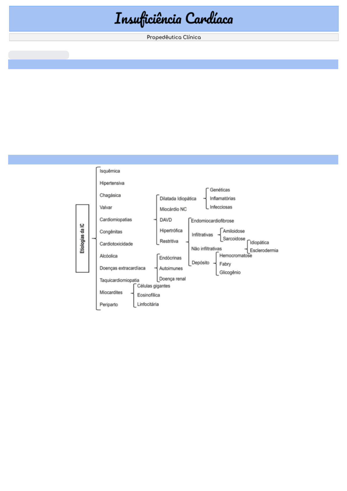 Medicina - 5º Semestre - Ana Paula Cuchera 7 de mar. de 2023 Definição - Insuficiência cardíaca → incapacidade do coração emmanter a demanda do organismo ● Fluxo de sangue diminuído → não consegue mandar um conteúdo adequado de sangue para a nutrição dos órgãos - Síndrome complexa secundária à agressão miocárdica aguda ou crônica, com desencadeamento de hiperativação neuro-hormonal e suas consequências ● Crônica → vai lentamente danificando o miocárdio ● Hiperativação neuro-hormonal → tipo de defesa do organismo para vencer essa IC e causa diversas consequências Etiologia - Existem várias doenças que podem causar dano ao miocárdio: ● Maior causa de morte cardiovascular → IAM (infarto agudo do miocárdio) ● Hipertensão ● Chagas ● Doenças que afetam as válvulas ● Cardiopatias congênitas (malformações → embriogênese) ● Cardiotoxicidade → existem várias drogas que a levam. Ex: quimioterapia ○ Cardio-onco → é uma especialidade que precisam de quimioterapia e que desenvolve uma cardiopatia ● Alcoólica ● Doenças extracardíaca ○ Autoimune (lúpus), tireoidite, insuficiência renal ● Taquicardiomiopatias → alteração do ritmo cardíaco ● Miocardite puerperal → miocardite pós-parto e se tratado adequadamente ele regride OBS! Anamnese nos direciona para um diagnóstico coerente de acordo com o que vamos encontrando 1 Fisiopatologia - Deficiência sistólica → agressão que altera a contração ● Dificuldade de fazer a sístole ● Alteração na contratilidade do coração → falta de relaxamento ● Quando maior quantidade de sangue dentro dele, maior a dificuldade de ejetar e com isso, ele tem que fazer maior força para vencer a resistência periférica ● Coração aumentado de tamanho, que tem uma cavidade menor ou igual ○ Se o cavidade ficar menor, o volume sistólico que sair vai ser menor → não enche adequadamente ● Músculo fica hipertrófico → cavidade do ventrículo fica menor e a parede fica maior ● Exemplo: Chagas - Deficiência diastólica → relaxamento comprometido que não deixa haver bom enchimento ● Dificuldade de fazer a diástole, uma vez que temmuito sangue na cavidade ● Com isso não é possível ejetar, pois perde a capacidade de contração (dificuldade de ejetar o sangue pela dilatação das paredes) ● O coração bate muito superficialmente OBS! Dependendo da doença que o paciente tiver, ele vai desenvolver hipertrofia ou dilatação - Na estenose mitral pode ter congestão pulmonar, já na insuficiência mitral não tem ● Na estenose a valva não abre ● Na insuficiência a valva não fecha direito Débito Cardíaco = Volume Sistólico x FC DC = VS x FC - Volume Sistólico → volume que sai do coração e ele depende da: ● Pré-carga = volume de sangue que chega ao coração ao final da diástole ● Pós-carga = resistência vascular periférica ao volume ejetado (Ex: vasoconstrição) - Contratilidade → Força do coração para contrair (composição das fibras, relaxamento, Frank-Starling) ● Lei de Frank Starling → estabelece que quanto mais o miocárdio for esticado no enchimento, a força de contração irá aumentar e consequentemente, a quantidade de sangue bombeada aumento ○ Estabelece que o coração, dentro de limites fisiológicos, é capaz de ejetar todo o volume de sangue que recebe proveniente do retorno venoso - FC → Sistema nervoso autônomo Simpático e Parassimpático Conceitos - Frank-Starling → quanto maior o estiramento maior a força contrátil até um comprimento ótimo - Fração de Ejeção → quanto saiu de volume e quanto sobrou na cavidade ventricular ao final da sístole 2 - Débito cardíaco → volume de sangue bombeado por minuto (4 a 6 litros/min) DC= FC x VS Alterações anatômicas Normal Dilatado = sobrecarga de volume Hipertrófico = sobrecarga de pressão OBS! A hipertrofia com o tempo pode evoluir para uma dilatação - E o hipertenso se não tratado pode ter uma insuficiência cardíaca por dilatação Insuficiência Cardíaca Paciente cardíaco → temmuito sódio e água circulante - Disfunção Miocárdica: ● Síndrome de Baixo Débito → quando o débito cardíaco está comprometido (diminuído) ● Neste há falta de irrigação aos órgão nobres ● Ou seja, quando a quantidade que sai em litros na unidade de tempo bombeado do coração está baixa ● Para não ter comprometimento, ele usa mecanismo compensatórios: ○ Ativação neuro-hormonal: ■ Hormônio antidiurético ■ Sistema renina/angiotensina/aldosterona ■ Sistema nervoso autônomo simpático ● Efeitos: ○ Sobrecarga de volume ■ Paciente com edema, edema pulmonar e oligúria ○ Vasoconstrição, elevação de pressão ○ Aumento da FC (estado adrenérgico tóxico) ■ Se aumentar a frequência dá mais problema, médico deve controlar 3 Estímulos - Ativação do Hormônio antidiurético = Vasopressina ● Aumenta a retenção de água, a fim de aumentar a pré-carga - Estimulação sistema renina por hipoperfusão renal ● Aldosterona → aumento da pré-carga retendo sódio e água ○ Mas o coração não “dá conta” com o Frank-Starling - Ocorre: ● CONGESTÃO PULMONAR ● CONGESTÃO SISTÊMICA - Estímulo do Sistema Renina ● Angiotensina II ● Vasoconstrição e aumenta a pós carga=resistência maior ao coração e piora o Volume sistólico ● Ativa fibroblastos que produz colágeno alterando os miócitos. (alterando o relaxamento) remodelamento reverso errado e a contratilidade será alterada - Sistema nervoso autônomo = Catecolaminas ● Norepinefrina e epinefrina ● Ativar Receptor alfa 1 → vasoconstrição periférica ● Ativar Receptor beta1 → aumentar FC e promove sobrecarga de Ca nos sarcômeros para melhorar a contratilidade, levando a lesão e a morte do miócito - Catecolaminas: ● Aumentam a FC ● Diminuem o tempo de relaxamento , não há diástole adequada e diminui a perfus