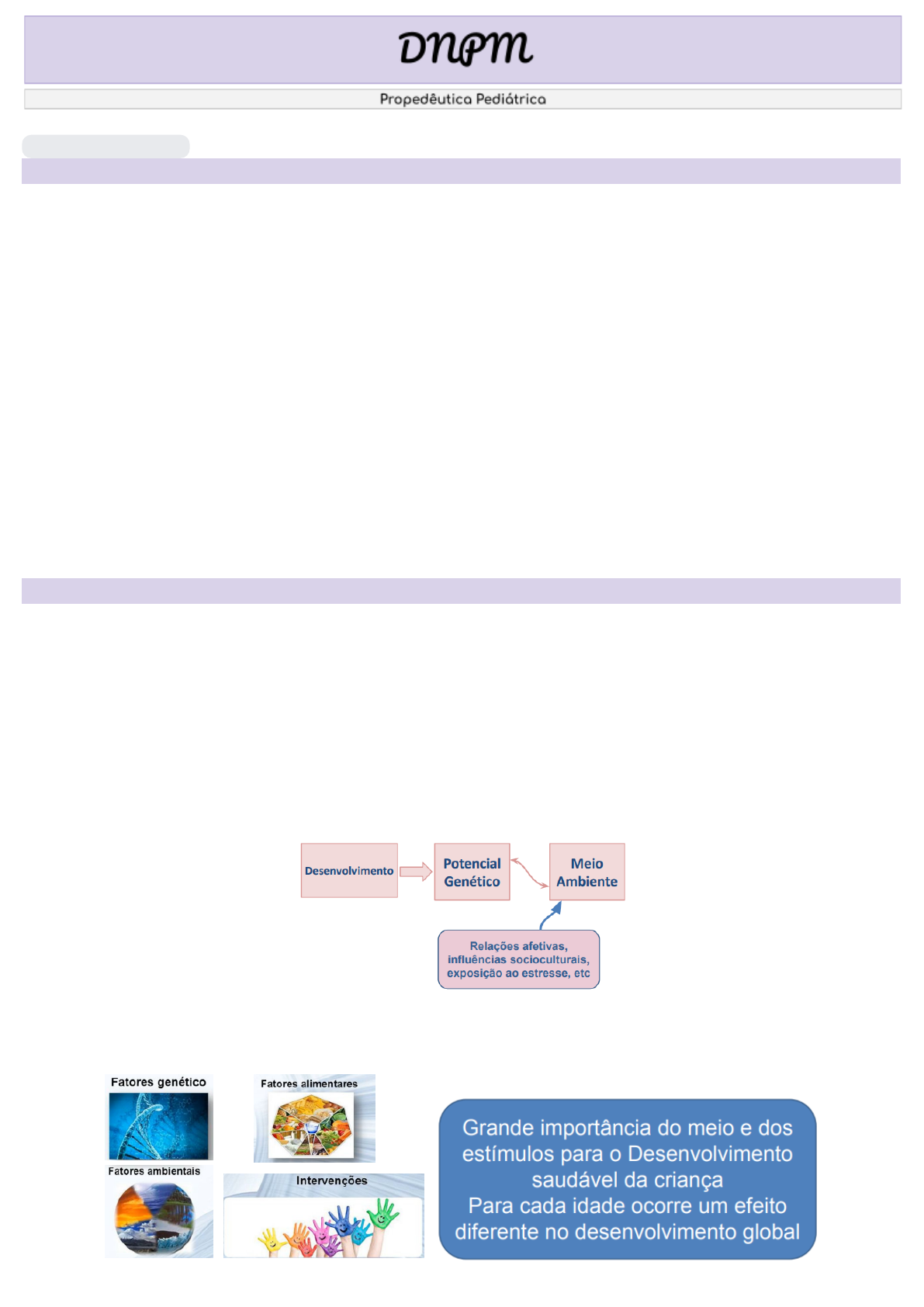 Medicina - 5º Semestre - Ana Paula Cuchera 13 de mar. de 2023 Caso clínico “QD: queda do trocador há 1 dia. Você recebe um paciente de 2 meses no Pronto Atendimento e a mãe refere que ele estava em cima do trocador, rolou sozinho e caiu no chão, ontem às 12:00. Logo em seguida chorou e ficou tudo bem (SIC). Hoje procurou atendimento médico pois notou o bebê muito sonolento, não tendo conseguido amamentá-lo nenhuma vez desde a queda até agora (13:00). AP: gestação a termo, mas com pré-natal inadequado (4 consultas), mãe G4P4A0, sem intercorrências gestacionais. Não sabe quanto aos testes de triagem. AF: mãe 23 anos, dona de casa, hígida. Pai 24 anos, pedreiro, hígido. Irmãos de 5 anos, 3 anos e 2 anos, hígidos.” - Rolou sozinho: Não rola com 2 meses - Não amamentou nenhuma vez no dia: Suspeita de maus-tratos - Pré natal inadequado: Suspeita de maus-tratos - Atraso de procura de atendimento - História não compatível com DNPM para a idade DNPM - Desenvolvimento Neuropsicomotor - “Um processo que se inicia desde a concepção, envolvendo vários aspectos, indo desde o crescimento físico, passando pela maturação neurológica, comportamental, cognitiva, social e afetiva da criança” “processo de amadurecimento humano” - Capacidade da criança desenvolver certas habilidade no campo: ● Motor ● Linguagem ● Cognitivo ● Psicoemocional e social - Meio ambiente: pode melhorar ou atrapalhar ao DNPM - Fatores alimentares: vitaminas, ácido essenciais (gordura → forma a bainha de mielina) - Exposição ao estresse: trauma, etc. 1 Desenvolvimento - Vacina: Rubéola → vacina a mulher para evitar malformações na criança ● Por ser um vírus atenuado, não pode receber durante a gestação e sim antes - Durante a gestação: fazer exames para ver má-formação de ossos, membros, pré-nucal - Tomar ácido fólico: fechamento do tubo neural. ● Pode gerar espinha bífida, mielomeningocele, etc. ● Isso pode gerar atraso, microcefalia, macrocefalia, etc. - Zika, Toxoplasmose, Citomegalovírus (TORCH) → afetam o desenvolvimento do feto - (TORCH) → Toxoplasmose, outras, Rubéola, Citomegalovírus, Hepatites. ● Afeta o feto - Primeiro 1.000 dias → afeta o resto da vida da criança ● Fase que infecções graves, internações são muito mais graves ● Nutrição ● Internações ● Cirurgias ● TCE Desenvolvimento na Primeira Infância ● Tempo variável para conquista de novas capacidades ● Não acontecem aos saltos, é progressivo e depende de estímulos ● Respeitar ritmo individual e não comparar ○ Não ocorre em saltos, é um conhecimento progressivo, não é de um dia para o outro. Ex: Com 6 meses senta e depois de um tempo vai aprender a engatinhar ○ Nem todas vãos sentar com 6 meses ● Motivadas pela necessidade de exploração e interação com omeio ○ Precisa ter estímulo para isso acontecer ● Aquisições já adquiridas nunca são desaprendidas em condições normais - transformam-se em aquisições com funções semelhantes, porémmais elaboradas. ○ Não perde a habilidade que ela adquiriu, ela só vai melhorar a habilidade ○ Agora se ela sentava e parou de sentar, isso é preocupante, ou seja, perder uma habilidade - Desenvolvimento Motor: ● Atividades reflexas substituídas por atividades voluntárias ○ Movimento grosseiro → habilidade de sentar e andar ○ Movimento fino → mais sensível, como o movimento de pinça com os dedos ● Diminuição progressiva do tônus flexor e predomínio do extensor ○ Bebê fica mais contraído (flexor) e conforme foi passando o tempo ele fica mais relaxado (extensor) ● Reflexos primitivos ○ Bebê temmuita atividade reflexa → exemplo fechar a mão 2 ● Direção céfalo-caudal ○ Criança sempre tem que sustentar a cabeça para depois desenvolver aos outras habilidades ○ Sempre craniocaudal ● Próximo–distal ○ Criança aprende segurar e depois fazer pinça ● Simples - complexa ● Processo sequencial, contínuo e relacionado a idade cronológica ● Ocorre de maneira dinâmica e pode ser moldado por estímulos externos OBS! Idade corrigida → até os 2 anos - Movimentação ocular → depende também da parte neurológica ● Quando é bebê é pequeno ele é estrábico - Reflexos Primitivos: ● Reflexo de Moro: nascimento até 4-6 meses ○ Quando a criança é submetida a barulho elevado ou movimento brusco, ela abre os braços ● Reflexo da marcha reflexa: 1ºs 2-4 meses ○ Quando criança é colocada em superfície, ela parece que está andando ● Reflexo da preensão palmar: até 3 meses ○ Fechar a mão ● Reflexo da preensão plantar: até 8-10 meses ○ Fechar os dedos do pé ● Reflexo de cutâneo plantar em extensão: até 10-15 meses ○ Apertar o calcanhar e a criança abre os dedos OBS! Não é Babinski ● Reflexo da sucção ○ Para mamar, quando toca no palato ● Reflexo do Espadachim ou tônico cervical assimétrico: até 6 meses ○ Quando vira a cabeça da criança, ela estende ● Reflexo de busca ○ Quando encosta no canto da boca, ela buscar o peito para mamar ● Reflexo de Landau ○ Quando flexiona a cabeça, ela flexiona as pernas também 3 OBS! Tummy time → deixar a criança de barriga para baixo sobre supervisão (5-10 minutos/2 a 3 vezes no dia) - para sustentar a cervical - Criança nunca pode dormir de barriga para baixo Marcos do Desenvolvimento Grosseiro ● 1º mês – tenta elevar a cabeça ● 2º mês – mantém a cabeça na linha média (sustentação cervical) ● 3º mês – apoia o antebraço quando em decúbito ventral ● 4º mês- levanta a cabeça em decúbito ventral e Rola ● 5º mês – rola e senta com apoio ● 6º mês – senta-se sozinho ● 8º mês – engatinha ● 9º mês – apoia-se para ficar de pé ● 12º mês – anda ● 15º mês – escala escadas e anda para trás ● 18º mês – corre, joga bola, empurra e puxa objetos ● 24º mês – joga bola, sobe esc