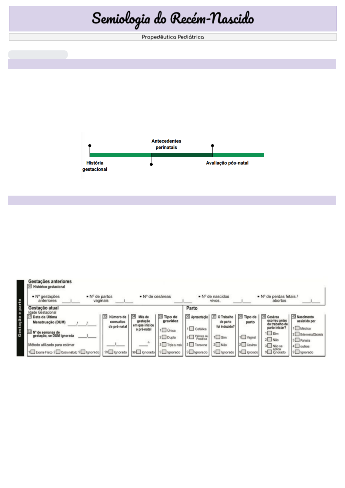 Medicina - 5º Semestre - Ana Paula Cuchera e Eduarda Costa 3 de mai. de 2023 Período Neonatal - Por definição até 28 dias de vida ● Período neonatal precoce → até 7 dias de vida ● Período neonatal tardio → 89 ao 289 dias de vida - Fundamental avaliar: ● História gestacional ● Antecedentes perinatais ● Avaliação pós-natal OBS! Os 1000 dias → do início da gestação até 2 anos → começa desde o período que a mãe engravida Anamnese Materna - Tem ficha detalhada com as seguintes informações: ● Identificação: ○ Nome, idade, cor, escolaridade, ocupação ● História familiar: ○ Malformações na família, síndromes genéticas, óbitos desconhecidos ○ Consanguinidade dos pais ● Antecedentes gestacionais (gestações anteriores): ○ Partos prévios, complicações em gestações anteriores, abortos e saúde dos irmãos doRN ○ G1P1A0 → 1 gestação, 1 parto e 0 abortos (pode acrescentar também se é cesárea ou não) - Na gestação atual: ● Número de consultas no pré-natal ● Uso de medicações, álcool, tabagismo, drogas... ● Doenças maternas relacionadas ou não a gestação ○ Obesidade, hipertensão, diabetes, doenças da tireoide. ● Intercorrências na gestação ● Necessidade de internação ● Avaliações fetais (cardiotocografia/USG fetal) ● Tipo sanguíneo materno ● Sorologias maternas ○ HIV, sífilis, hepatite B, hepatite C ○ CMV não é obrigatório no SUS ● Colonização pelo Streptococcus do grupo B 1 OBS! OMS recomenda no mínimo 6 consultas pré-natais - Existe estudo sobre fumo materno e PIG → geralmente quem fuma tem bebê pequeno - Mãe que usa álcool → síndrome alcoólica fetal OBS! Eritroblastose fetal consiste na anemia hemolítica no feto causada pela transmissão transplacentária de anticorpos maternos para os eritrócitos fetais OBS! Pesquisa que associa os fatores antenatais e parto com condições ruins para nascer Poliomielite → a placenta tem pus (LER) Avaliação da idade gestacional - Usar como referência para o cálculo ● Data da última menstruação (DUM) ● Ultrassonografia (preferência por 1º trimestre) - Após nascimento → Estimativa através do exame físico do RN ● Capurro ● New-Ballar → usa quando é prematuro 2 - A partir da data da última menstruação - A partir do ultrassom fetal (preferencialmente realizado entre 10-13 semanas) - Estimativas após o nascimento ● Capurro ● New-Ballard (mais utilizados para mais prematuros) - Método Capurro: OBS! O tamanho da glândula mamária tem que palpar Saber mais o itens do que a nota - Método de capurro: para avaliar a idade gestacional utiliza a tabela acima → a somatória dos ponto acrescenta-se 204 e divide-se por 7, o resultado corresponde a idade gestacional em semanas (Resultado + 204/7) 3 - Este método avalia: Formação do mamilo 0 pontos = apenas visível; 5 pontos = aréola pigmentada - diâmetro menor que 7,5mm; 10 pontos = aréola pigmentada, pontiaguda - diâmetro menor que 7,5mm, borda não levantada; 15 pontos = borda levantada - diâmetro maior que 7,5mm; Textura da pele 0 pontos = muito fina, gelatinosa; 5 pontos = fina e lisa; 10 pontos = algo mais grossa, discreta descamação superficial; 15 pontos = grossa, rugas superficiais, descamação nas mãos e pés; 20 pontos = grossa apergaminhada, com gretas profundas. Forma de orelha 0 pontos = chata disforme, pavilhão não encurvado; 8 pontos = pavilhão parcialmente encurvado em toda parte superior; 24 pontos = pavilhão totalmente encurvado. Tamanho da glândula mamária 0 pontos = não palpável; 5 pontos = palpável, menos de 5mm; 10 pontos = entre 5 e 10mm; 15 pontos = maior de 10mm. Pregas plantares 0 pontos = sem pregas; 5 pontos = marcas mal definidas sobre a parte anterior da planta; 10 pontos = marcas bem definidas sobre a metade anterior e sulcos no terço anterior; 15 pontos = sulcos na metade anterior da planta; 20 pontos = sulcos emmais da metade anterior da planta. - Método de New Ballard: 4 - Método de New Ballard: Avalia a questão neurológica também POSTURA Com o RN em repouso, observar a atitude dos 4 membros. ● 0: Deflexão total dos 4 membros. ● 1: Flexão ligeira dos quadris e joelhos. ● 2: Flexão moderada ou acentuada dos membros inferiores e discreta flexão do antebraço. ● 3: Membros inferiores em flexão, quadris abduzidos, commembros superiores com alguma flexão (posição de batráquio). ● 4: Os quatro membros apresentam flexão igual e forte. ÂNGULO DE FLEXÃO DO PUNHO Flexionar a mão sobre o punho, exercendo pressão suficiente para obter o máximo de flexão possível. Medir o ângulo entre a eminência hipotenar e a face anterior do antebraço. RETRAÇÃO DO BRAÇO Flexionar ao máximo o antebraço durante 5 segundos, em seguida estender ao máximo através de tração das mãos, soltando em seguida observando o ângulo entre o braço e antebraço. ÂNGULO POPLÍTEO Com o RN em decúbito dorsal e a pelve apoiada na superfície da mesa de exame, a perna é flexionada por completo sobre a coxa com uma das mãos, e coma outra mão a perna é estendida, observando-se o ângulo obtido. SINAL DO XALE Com o RN em decúbito dorsal, segurar umas das mãos e levá-la o máximo possível em direção ao ombro do lado contralateral. Permite-se levantar o cotovelo sobre o corpo. A contagem de pontos se faz segundo a localização do cotovelo. ● -1: cotovelo ultrapassa a linha axilar do lado oposto. ● 0: cotovelo atinge a linha a linha axilar anterior contralateral. ● 1: permanece entre a linha axilar contralateral e a linha média. 5 ● 2: cotovelo na linha média do tórax. ● 3: cotovelo não chega à linha média do tórax. MANOBRA DE CALCANHAR-ORELHA Levar um dos pés ao máximo possível em direção à cabeça, mantendo a pelve sobre a mesa. Atribua os pontos conforme a figura. OBS! Postura → quanto mais prematura mais extensão e quanto mais maduro temmais flexão - Retração d