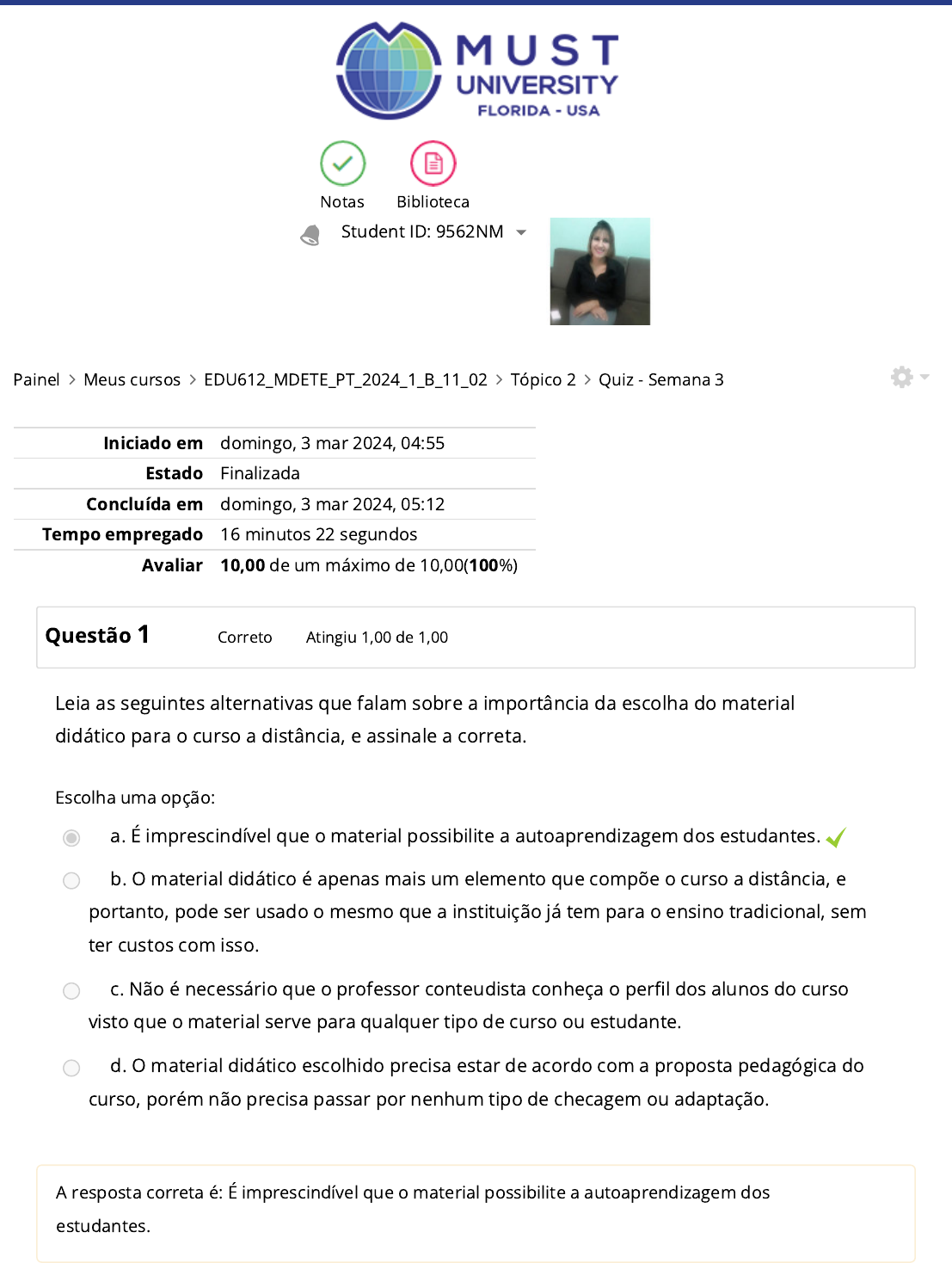 Painel Meus cursos EDU612_MDETE_PT_2024_1_B_11_02 Tópico 2 Quiz - Semana 3 Student ID: 9562NM Notas Biblioteca Iniciado em domingo, 3 mar 2024, 04:55 Estado Finalizada Concluída em domingo, 3 mar 2024, 05:12 Tempo empregado 16 minutos 22 segundos Avaliar 10,00 de um máximo de 10,00(100%) Questão 1 Correto Atingiu 1,00 de 1,00 Leia as seguintes alternativas que falam sobre a importância da escolha do material didático para o curso a distância, e assinale a correta. Escolha uma opção: a. É imprescindível que o material possibilite a autoaprendizagem dos estudantes. b. O material didático é apenas mais um elemento que compõe o curso a distância, e portanto, pode ser usado o mesmo que a instituição já tem para o ensino tradicional, sem ter custos com isso. c. Não é necessário que o professor conteudista conheça o per�l dos alunos do curso visto que o material serve para qualquer tipo de curso ou estudante. d. O material didático escolhido precisa estar de acordo com a proposta pedagógica do curso, porém não precisa passar por nenhum tipo de checagem ou adaptação. A resposta correta é: É imprescindível que o material possibilite a autoaprendizagem dos estudantes. https://my.mustedu.com/my/ https://my.mustedu.com/course/view.php?id=1039 https://my.mustedu.com/course/view.php?id=1039#section-2 https://my.mustedu.com/mod/quiz/view.php?id=83963 https://my.mustedu.com/ https://my.mustedu.com/ https://my.mustedu.com/user/view.php?id=9351&course=1039 https://my.mustedu.com/custom/minhas_notas.php Questão 2 Correto Atingiu 1,00 de 1,00 Estudamos, durante as aulas, que para a implantação de um curso a distância é necessário pensar sobre algumas questões. Identi�que dentre as opções abaixo uma informação correta. Escolha uma opção: a. Usar a tecnologia já implementada pela instituição para os cursos tradicionais. b. Usar um plano de gestão básico, válido para o ensino presencial. c. Selecionar professores habituados com a metodologia tradicional. d. Planejar o trabalho multidisciplinar. A resposta correta é: Planejar o trabalho multidisciplinar. Questão 3 Correto Atingiu 1,00 de 1,00 Vimos que Moore e Kearsley (1996) idealizaram um plano para a implantação de um curso EaD que se baseia em 5 partes. Leia as alternativas abaixo e assinale a que contém informações corretas conforme cada uma dessas partes. Escolha uma opção: a. Implementação: trabalho e residência. b. Tipos de cursos: design instrucional e produção de materiais. c. Implementação: videoconferências e redes de computadores. d. Interações: necessidades dos alunos e estratégia pedagógica. A resposta correta é: Implementação: videoconferências e redes de computadores. Questão 4 Correto Atingiu 1,00 de 1,00 Vimos que a comunicação no curso a distância deve ser bidirecional. Relembrando esse conteúdo, assinale a alternativa que traga uma característica correta desse tipo de comunicação. Escolha uma opção: a. Esse tipo de comunicação faz com que o estudante tenha acesso às suas informações por meio do contato direto e presencial com a secretaria da instituição. b. Esse tipo de comunicação faz com que o aprendiz possa acompanhar o andamento de sua situação constantemente, por meio do Ambiente Virtual de Aprendizagem. c. Esse tipo de comunicação faz com que o aluno estude sozinho, sem ter acesso aos colegas ou ao tutor. d. Esse tipo de comunicação faz com que o aluno possa mandar mensagens para o tutor, porém ele não precisa responder. A resposta correta é: Esse tipo de comunicação faz com que o aprendiz possa acompanhar o andamento de sua situação constantemente, por meio do Ambiente Virtual de Aprendizagem. Questão 5 Correto Atingiu 1,00 de 1,00 Vimos sobre a preparação dos alunos do curso a distância. Leia as seguintes opções e assinale a que contenha uma informação verdadeira sobre esse preparo. Escolha uma opção: a. É preciso que o estudante do curso a distância tenha como responsabilidade um conjunto de ações, e um �uxo de trabalho, desenvolvendo bem a sua função de forma a não comprometer o resultado do todo, ou seja, o trabalho de uma equipe compromete a qualidade e o funcionamento das demais equipes multidisciplinares. b. O estudante do curso a distância precisa entender a relevância de ele próprio assumir o seu papel de sujeito passivo, e quais as características e habilidades que precisa ter para estudar nessa modalidade. c. Além das di�culdades com as tecnologias, muitas vezes os estudantes têm muitos afazeres em suas vidas, então precisam de um curso objetivo, bem planejado, que lhes possibilite usar seu tempo de forma e�ciente. d. O estudante do curso a distância precisa receber um treinamento inicial, �car ciente da proposta pedagógica do curso, entender quais as ferramentas tecnológicas que precisarão ser utilizadas, e depois ter um acompanhamento constante da equipe, que poderá ajudá-lo na elaboração do material que será oferecido no curso. A resposta correta é: Além das di�culdades com as tecnologias, muitas vezes os estudantes têm muitos afazeres em suas vidas, então precisam de um curso objetivo, bem planejado, que lhes possibilite usar seu tempo de forma e�ciente. Questão 6 Correto Atingiu 1,00 de 1,00 Estudamos sobre as competências que os mediadores precisam ter para que o curso a distância seja bem desenvolvido para os estudantes. Relembre esse conteúdo, leia as alternativas abaixo e assinale a correta com relação ao que sempre deve ser avaliado na postura do mediador. Escolha uma opção: a. O mediador não precisa ter muito conhecimento sobre o uso de tecnologias da informação visto que ele não terá contato face a face com seus estudantes. b. O mediador precisa conhecer bem o conteúdo que será ministrado por ele no curso. c. O mediador precisa ser ético na sua função, e passar à coordenação do curso todos os detalhes sobre as atitudes dos estudantes
