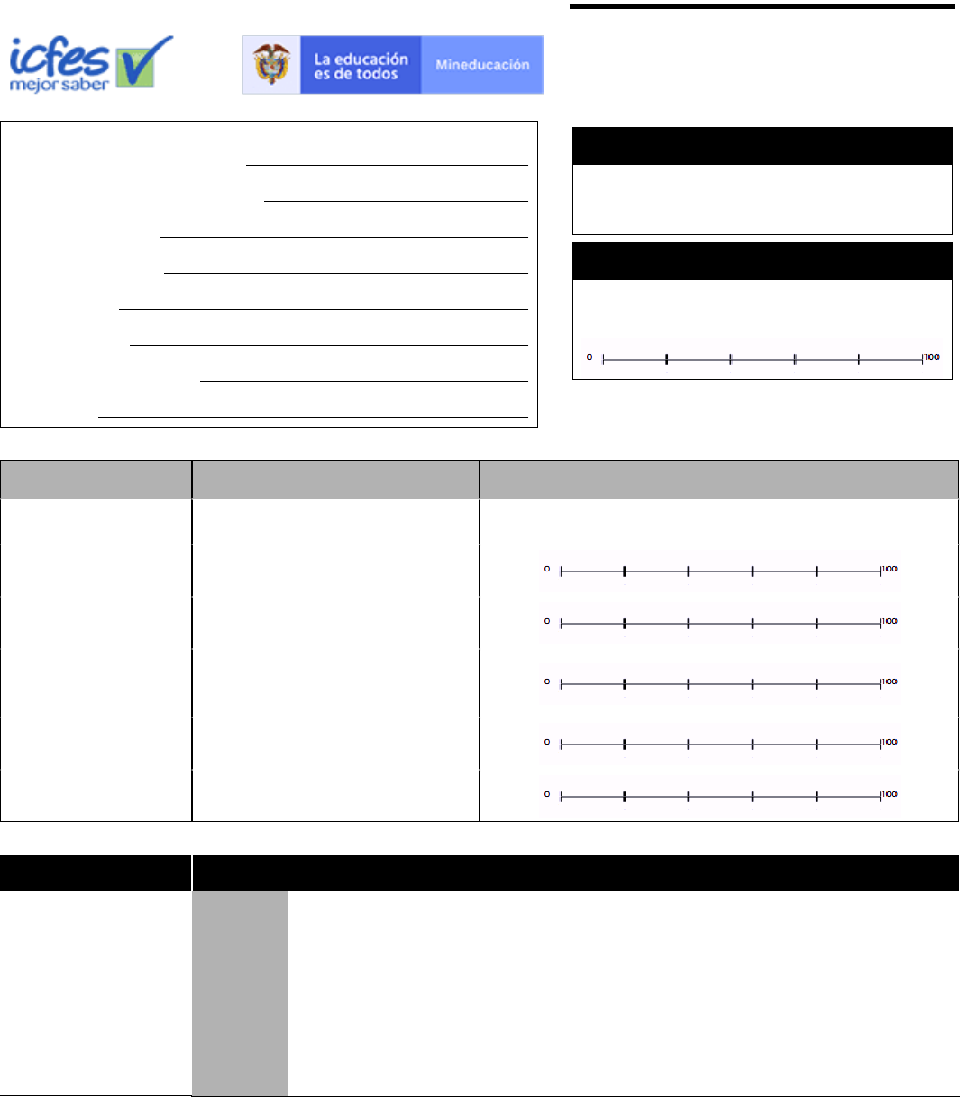 REPORTE DE RESULTADOS ESTUDIANTE •SABER 11• Fecha de aplicación del examen: 31 DE JULIO DE 2016 Fecha de publicación de resultados: 22 DE OCTUBRE DE 2016 Número de registro: AC201622816213 Apellidos y nombres: PETRO PEREZ LORAINE CANDELARIA Identificación: TI 1002497311 Código DANE: 113430000003 Establecimiento educativo: LICEO JOAQUIN F. VELEZ Municipio: MAGANGUÉ - BOLIVAR PUNTAJE GLOBAL De 500 puntos posibles, su puntaje global es ‣ 272 ¿EN QUÉ PERCENTIL ME ENCUENTRO? ⮝Con respecto a los estudiantes del país, usted está aquí. ⮝ 62 PRUEBA DE 100 PUNTOS POSIBLES, SUPUNTAJE ES ¿EN QUÉ PERCENTIL ME ENCUENTRO? ⮝Con respecto a los estudiantes del país, usted está aquí. Lectura Crítica 57 ⮝ 69 Matemáticas 55 ⮝ 62 Sociales Y Ciudadanas 49 ⮝46 Ciencias Naturales 55 ⮝ 60 Inglés 58 ⮝ 72 PRUEBA SU NIVEL DE DESEMPEÑO ES Lectura Crítica 3 Para clasificar en este nivel, el estudiante: •Jerarquiza la información presente en un texto. •Infiere información implícita en textos continuos y discontinuos. •Establece relaciones intertextuales: definición, causa-efecto, oposición, y antecedente-consecuente, entre textos presentes. •Reconoce la intención comunicativa del texto. •Relaciona marcadores textuales en la interpretación de textos. •Reconoce la función de figuras literarias. •Identifica el uso del lenguaje en contexto. •Analiza y sintetiza la información contenida en un texto. •Identifica la estructura sintáctica en textos discontinuos. •Establece la validez de argumentos en un texto. Matemáticas 3 Para clasificar en este nivel, el estudiante: •Selecciona la gráfica (que puede ser de doble entrada) correspondiente a la información de una tabla, o a partir de verbalizaciones (características de crecimiento o decrecimiento deseadas), teniendo en cuenta para la selección la escala, el tipo de variable y el tipo de gráfica. •Compara información gráfica que requiere algunas manipulaciones aritméticas. •Señala información representada en formatos no convencionales (mapas o infografías). •Reconoce errores ocurridos al realizar una transformación entre diferentes tipos de registro. •Reconoce desarrollos planos de una forma tridimensional y viceversa. •Compara la probabilidad de eventos simples en diversos contextos (casos favorables/casos posibles), incluso cuando los casos posibles de cada evento son diferentes. •Selecciona información necesaria para resolver problemas que involucran operaciones aritméticas. •Selecciona información necesaria para resolver problemas que involucran características medibles de figuras geométricas elementales (triángulos, cuadriláteros y circunferencias). •Cambia la escala cuando la trasformación no es convencional. •Justifica afirmaciones utilizando planteamientos y operaciones aritméticas o haciendo uso directo de un concepto, es decir, a partir de un único argumento. •Identifica información relevante cuando el tipo de registro contiene información de más de tres categorías. •Hace manipulaciones algebraicas sencillas (aritmética de términos semejantes). Sociales Y Ciudadanas 2 Para clasificar en este nivel, el estudiante: •Identifica derechos ciudadanos y deberes del Estado establecidos en la Constitución Política de Colombia. •Relaciona la conducta de una persona con su forma de ver la vida. •Reconoce los efectos de una solución y las dimensiones que privilegia. •Identifica contextos o procesos en los que se inscribe una fuente o evento. Ciencias Naturales 2 Para clasificar en este nivel, el estudiante: •Identifica patrones y características a partir de información presentada en textos, gráficas y tablas. •Relaciona esquemas con nociones básicas del conocimiento científico. •Establece predicciones a partir de datos presentados en tablas, gráficas y esquemas en donde se presentan patrones claramente crecientes o decrecientes. •Ordena datos e información en gráficas y tablas. Inglés A1 •El estudiante es capaz de comprender y utilizar expresiones cotidianas de uso muy frecuente, así como frases sencillas destinadas a satisfacer necesidades inmediatas. •Puede presentarse a sí mismo y a otros, pedir y dar información personal básica sobre su domicilio, sus pertenencias y las personas que conoce. •Puede relacionarse de forma elemental con su interlocutor siempre que este hable despacio y con claridad y esté dispuesto a cooperar. ¿CÓMO ENTENDER MIS RESULTADOS? El reporte está organizado de la siguiente manera: • Datos de identificación personal e institucional • Resultados globales • Resultados por pruebas • Resultados del desempeño del evaluado en terminos de lo que sabe y sabe hacer Puntaje global Puntaje por pruebas Percentil Es obtenido a partir de la multiplicación del Índice Global del estudiante por cinco. Este índice es calculado como el promedio ponderado de los puntajes obtenidos en las pruebas del examen. La ponderación asignada a la prueba de Inglés es de un punto y la de las demás pruebas es de tres puntos. Este resultado se encuentra en una escala de 0 a 500 puntos sin decimales. Para comparar resultados a través del tiempo, la media del puntaje global definida en la primera aplicación del examen (2014- 2) se fija en 250 puntos. Es el resultado cuantitativo que se obtiene a partir de la valoración de las respuestas dadas a las preguntas de cada prueba del examen. Este resultado se reporta en una escala de 0 a 100 puntos sin decimales. Para comparar resultados a través del tiempo, la media de la escala definida en la primera aplicación del examen (2014-2) se fija en 50 puntos y su desviación estándar en 10 puntos. ⮝ 81 El ícono ⮝ indica en qué percentil se encuentra el resultado del evaluado (puntaje global o en alguna prueba del examen) con respecto a los resultados de los estudiantes colombianos. Si el puntaje global del evaluado estuviese ubicado en el percentil 81, éste s