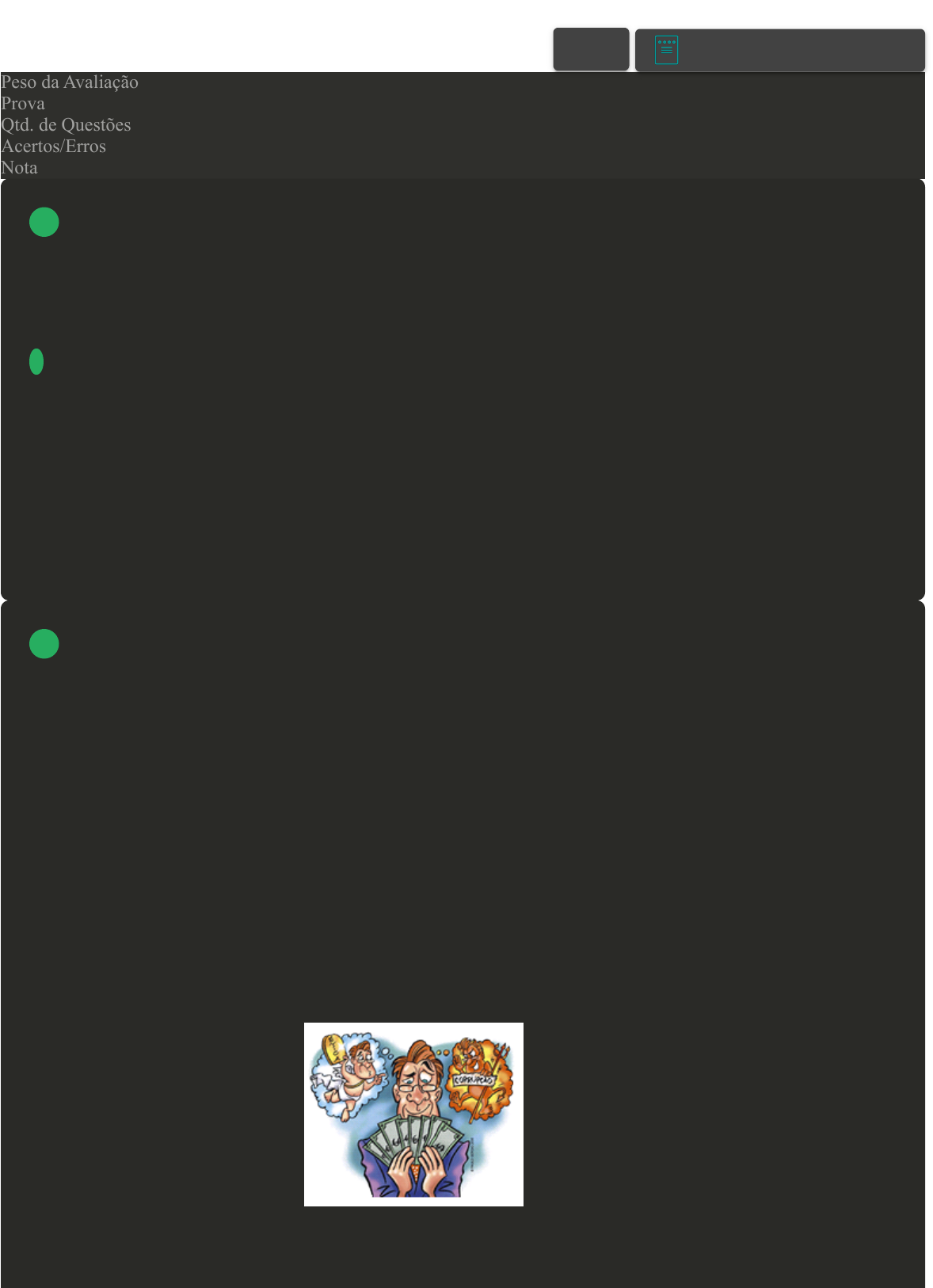 Prova Impressa GABARITO | Avaliação I - Individual (Cod.:954115) Peso da Avaliação 2,00 Prova 76039994 Qtd. de Questões 10 Acertos/Erros 10/0 Nota 10,00 A função da ética tem como principal necessidade apresentar qual a melhor forma de praticar o comportamento, no meio social ou de cada pessoa. Podemos colocar, por exemplo, os políticos. Nesse caso, a ética prevalece como uma situação de grande importância, pois estão representando a população da sua localidade. A ética também faz pensar priorizando a vida presente e futura de modo moral. Sobre a ética, assinale a alternativa CORRETA: A É o modo de agir, de vir a que cada sociedade, grupo, pessoal através do seu comportamento e seus princípios morais, diferenciando o certo do errado. Portanto, o que pode ser certo para nós pode ser ao contrário para outra cultura ou grupo social. B É necessidade dos estados e municípios apresentarem de modo genérico os serviços efetuados para a população, de forma a não apresentar todos os dados. C É a diferença das questões humanitárias. Apenas os políticos têm a necessidade de apresentação da ética, pois representam a população. D Pode-se evidenciar que a ética faz parte das culturas e grupos em que todos têm a mesma crença e nas diferenças sociais. Quando se fala em ética, sempre nos referimos aos políticos, mas os empresários também deveriam ter, pois, depois das operações da Polícia Federal, a “Lava Jato" e o "Petrolão”, ocorrido em 2015, mostraram que ambas as partes não possuem o compromisso com a população, a ganância por mais dinheiro atropela toda as expectativas da ética e da moral. As escolhas entre o correto e o errado dependem de nós mesmos, cabe escolher o caminho a seguir. Representando as nossas escolhas entre o correto e o incorreto ou o que se pode dizer entre a ética e a corrupção, observe a charge sobre as ideias que podem representar esse perfil de pessoas, o que ela transmite com relação aos dias atuais, e analise as afirmativas a seguir: I- Considera-se a ética como um recurso de induzir as pessoas a fazer as coisas erradas. II- Pode-se considerar que a ética estuda a moral através de nossas escolhas, valores, desejos, atitudes e sentimentos. III- As crenças sobre a ética se destacam apenas nas escolhas do tipo de religião sobre a sociedade. IV- A ética tem a função de apresentar formas para melhorar o comportamento de cada indivíduo ou grupo social. Agora, assinale a alternativa CORRETA: FONTE DA IMAGEM: Disponível em: . Acesso em: 10 ago. 2015. (Bem = Ética) x (Mau = Corrupção) A As afirmativas I e II estão corretas. VOLTAR A+ Alterar modo de visualização 1 2 B Somente a afirmativa I está correta. C As afirmativas II e III estão corretas. D As afirmativas II e IV estão corretas. A construção dos nossos valores inicia-se desde criança, a nossa ética, princípios e virtudes. Todas as pessoas possuem valores que são constituídos na sociedade, saber diferenciar o certo ou o errado, os seus direitos e deveres da condução ética profissional, pessoal, familiar, social e principalmente moral. Através da nova Constituição Federal de 1988, temos deveres e direitos com a sociedade em si entre outras normas significativas provenientes da consciência moral. Diante desse aspecto, existem exemplos dos valores e virtudes humanas. Referentes aos exemplos dos valores humanos, classifique V para as opções verdadeiras e F para as falsas: ( ) Amizade, justiça, liberdade, ordem e humildade. ( ) Amizade, pudor, injustiças, sinceridade e simplicidade. ( ) Lealdade, justiça, paciência, autoestima e generosidade. ( ) Respeito, compreensão, obediência, pudor e ordem. Agora, assinale a alternativa que apresenta a sequência CORRETA: A V - F - V - V. B V - F - F - F. C F - F - V - V. D V - V - V - V. Observando a figura, a desigualdade social é muito grande, e não apenas no Brasil, mas nos mais variados países do planeta. Esse grande problema acontece com distintos grupos sociais, como as diferenças religiosas, a cor da pele e a diversidade cultural. Demostra que é muito maior o preconceito, as pessoas não aceitam essas diferenças, o modo de pensar, o jeito de ser. A cultura brasileira é marcada pela mistura de raças (brancos, negros e índios). Isso proporcionou o crescimento de várias culturas e, com isso, as diferenças sociais. Diante desses fatos, assinale a alternativa CORRETA: FONTE DA IMAGEM: Disponível em: . Acesso em: 3 ago. 2015. A Ocorre a diferença social, pensamentos, ideias, ações, orientação sexual, dentro da mesma sociedade, podendo gerar conflitos verbais e até violência. B O desenvolvimento das diferenças da sociedade está ligado apenas aos mais diversos tipos de religião. Dessa forma, existem poucas situações de preconceito referente à raça e à cor da pele. C Ocorre a diferença social apenas com os brancos e índios. D Ocorre a diferença social apenas com a diferença da cor da pele e a raça. 3 4 O feminismo tem origem no ano de 1848, na convenção dos direitos da mulher em Nova Iorque. Essas conquistas se dão pelas grandes revoluções, como a Revolução Francesa, que tinha como lema Igualdade, Liberdade e Fraternidade, e foram reivindicadas por elas, pois acreditavam que os direitos sociais e políticos adquiridos a partir das revoluções deveriam se estender a elas enquanto cidadãs. Algumas conquistas podem ser registradas como consequência da participação da mulher nesta revolução, um exemplo é o divórcio, movimentos políticos cuja meta é conquistar a igualdade de direitos entre homens e mulheres, isto é, garantir a participação da mulher na sociedade de forma equivalente à dos homens. Houve momentos na história da humanidade, como na Idade Média, em que a mulher tinha direitos mais abrangentes, como acesso total à profissão e à propriedade, além de chefiar a família. No entanto, foram diminuindo com o advento do capitalis