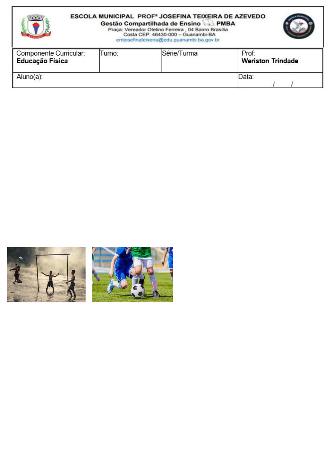 6° ANO - TEMA: JOGO E ESPORTE É comum a utilização dos termos jogos e esportes para definir a mesma atividade. Todavia, é importante perceber que existem diferenças entre essas duas palavras. Segundo o site Nova Escola, o jogo é definido “como uma atividade de caráter lúdico com normas livremente estabelecidas pelos participantes. O esporte, por sua vez, tem regras preestabelecidas pelas diferentes instituições que regem cada modalidade esportiva, sejam ligas, federações, confederações ou comitês olímpicos. DEFININDO MELHOR A DIFERENÇA ENTRE JOGO E ESPORTE O jogo geralmente tem uma finalidade de entretenimento e de diversão, as regras são mais flexíveis e livremente estabelecidas pelos participantes, não é obrigatório um uniforme, os envolvidos na atividade de jogo são chamados de jogadores e não existe uma premiação. Já o esporte, é uma competição profissional, suas regras são regidas por um órgão regulamentador, costuma existir premiação e os envolvidos na atividade são chamados de atleta. Observe as imagens e perceba na prática esta diferença: Jogo Esporte RESUMINDO A PRÁTICA DE JOGOS E ESPORTES Para a prática de esportes, os atletas utilizam uniformes apropriados, e as competições possuem premiações, que podem ser medalhas, troféus, títulos ou prêmios em dinheiro. Também é necessário um local adequado para cada modalidade de esporte, como ginásios, campos de futebol, pistas de corrida, entre outros. Para a prática de jogos, não é necessário o uso de uniformes, e apesar de em muitos casos também existir competitividade e vencedores, não há premiações. Os jogos podem ser praticados em qualquer lugar, não necessitando um espaço específico. ATIVIDADE SOBRE O QUE VOCÊ APRENDEU 1. Marque a alternativa VERDADEIRA: a) O jogo e o esporte possuem a mesma definição. b) O esporte é uma atividade mais informal e não há premiação. c) O jogo tem a finalidade principal o entretenimento dos participantes. d) Não há necessidade de uniformes para a prática do esporte. 2. Qual atividade (esporte ou jogo) tem caráter mais lúdico e normas flexíveis? 3. Com suas palavras, defina: a) Esporte: b) Jogo: 4. Segundo o texto, que tipos de premiações são comuns nas atividades esportivas? 5. Observe a característica de cada alternativa e escreva se ela se refere ao jogo ou ao esporte: a) Pode ser praticado em qualquer lugar. b) As regras são regidas por um órgão regulamentador. c) A idade do participante nunca é levada em consideração. d) Nesta atividade, os participantes são chamados de atletas. 6. Que tipo de atividade você mais pratica? Esporte ou jogo? Por quê? 7. Crie um desenho do jogo ou esporte que você mais gosta, depois escreva um pequeno texto explicando como ele é jogado. COMO SE JOGA ___________________ ___________________ ___________________ ___________________ ___________________ ___________________ ___________________ ___________________ ___________________ ___________________ ___________________ ___________________ ___________________ ___________________ ___________________ ___________________ ___