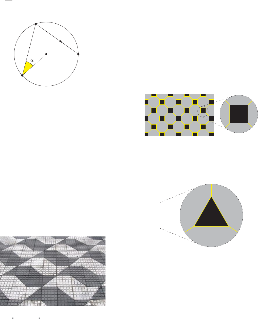 MATEMÁTICA Capítulo 2 Princípios de Geometria Plana286 c) Supondo agora que 30° < θ < 60°, encontre uma expressão, em função de θ, para a medida α do ângulo agudo formado pela reta que contém P e Q e pela reta que contém a trajetória da bola após a primeira reflexão na borda. 30 UEM 2016 Um espelho tem a forma de uma circun- ferência de centro O. A partir de um ponto A1 na circunferência é emitido um feixe de luz na direção de um ponto A2, também na circunferência, como mostra a figura adiante. O feixe de luz é então refletido para um ponto A3 e segue refletindo até tocar novamente em A1, de modo que sua trajetória forme um polígono regular. Sabendo que a medida do ângulo α, em graus, entre o raio OA1 da circunferência e o feixe de luz A1A2, é um número inteiro, assinale o que for correto. A 3 A 1 A 2 O 01 Se α = 60°, então os feixes de luz refletidos forma- rão um hexágono. 02 É impossível que os feixes de luz tenham formado um octógono regular 04 Há exatamente 16 possibilidades para o valor do ângulo α nas condições consideradas 08 O menor valor possível para a medida do ângulo α, em graus, é 30° 16 O polígono com a maior quantidade de lados que pode ser formado nessas condições é um dode- cágono (12 lados) Soma: 31 A imagem a seguir é de uma calçada da Avenida Paulista, na cidade de São Paulo O mosaico presen- te nessa calçada, que imita o formato do estado de São Paulo, pode ser obtido usando-se peças de cerâ- mica quadradas que são completamente brancas ou completamente pretas ou, ainda, metade brancas e metade pretas a) Como pode ser classificado o polígono que re- presenta o formato do estado de São Paulo na calçada? b) Qual é o valor do maior ângulo interno desse po lígono? c) Quanto vale a soma das medidas de todos os ân- gulos internos desse polígono? d) Sabendo que os lados das peças quadradas de cerâmica que compõem esse mosaico medem 20 cm cada, determine o perímetro aproximado desse polígono que representa o formato do es tado de São Paulo. 32 Unifesp A soma de n – 1 ângulos internos de um polígono convexo de n lados é 1 900° O ângulo re- manescente mede A 120° 105° C 95° 80° E 60° 33 A figura a seguir mostra um piso de cerâmica com- posto de peças em forma de polígonos regulares de dois tipos diferentes, em que as peças menores são quadradas e as maiores são octogonais. Um segundo piso também é composto de peças de dois tipos diferentes de polígonos regulares e segue o mesmo princípio de distribuição, porém as peças me- nores desse segundo piso têm a forma de triângulos equiláteros, como mostra o detalhe a seguir. De acordo com os princípios geométricos formadores desses pisos, as peças maiores do segundo piso têm a forma de: A hexágonos regulares. heptágonos regulares C eneágonos regulares. decágonos regulares. E dodecágonos regulares F R E N T E 3 287 34 IFCE 2014 Um robô, caminhando em linha reta, parte de um ponto A em direção a um ponto B, que dis- tam entre si cinco metros Ao chegar ao ponto B, gira novamente 60° à esquerda e caminha mais cinco me- tros, repetindo o movimento e o giro até retornar ao ponto de origem. O percurso do robô formará um po- lígono regular de: A 10 lados. 9 lados. C 8 lados 7 lados. E 6 lados. 35 Considere a figura de um pentágono regular ABCDE e um ponto P em seu interior, de modo que PA e PB tenham o mesmo comprimento e o ângulo A ˆPB tenha 40°. Considere também que, pelo ponto P, pas- sa uma reta paralela ao lado AB desse pentágono, interceptando os lados DE e CD nos pontos Q e R, respectivamente Nessas condições, encontre as medidas de todos os ângulos internos do quadrilátero EAPQ determinado por essa gura. 36 Dados n pontos que dividem uma circunferência em partes iguais, podemos obter formas geométricas po- ligonais e regulares ligando esses pontos por meio de segmentos de diversas maneiras Cada uma des- sas maneiras é designada por um número p, chamado de passo de ligação. As figuras a seguir apresen- tam circunferências divididas em partes iguais por 9 pontos ligados com passos 1, 2, 3 e 4. p = 1 p = 2 p = 3 p = 4 Calcule as medidas dos ângulos determinados nos vértices de cada uma dessas guras. 37 Um pedaço de papel na forma de um paralelogramo é tal que pode ser dobrado formando um pentágono regular Para isso, basta fazer coincidirem as extre- midades da sua diagonal maior, como mostram as figuras a seguir. Figura 1 Vinco da dobradura Figura 2 Sabendo que, para isso acontecer, o vinco da dobradura deve ser perpendicular à diagonal maior do paralelogramo, determine a medida, em graus, do ângulo formado entre o lado menor e a diagonal maior desse paralelogramo. 38 A teoria dos grafos é uma estrutura matemática usa- da para representar mapas rodoviários, sistemas de distribuição de água, hierarquia de cargos em uma empresa ou mesmo para estudar o relacionamento social entre pessoas etc. Ela tem muita relação com a Geometria. Por exemplo, o número máximo de liga- ções que podem existir entre dois dos n elementos de determinado conjunto G pode ser observado geo- metricamente, de modo que cada ligação entre os elementos de G seja representada por um lado ou por uma diagonal de um polígono convexo P com n lados. Sendo y = f(n) a função que expressa esse número má- ximo de ligações entre os n vértices de um polígono regular e sabendo que existem coecientes reais a, b e c tais que f(n) = a · n2 + b · n + c, determine: a) os valores dos coeficientes a, b e c. b) o conjunto domínio da função f. c) os valores de n para y = 28 e para y = 32. 39 Uma das etapas da produção do copo americano tradicional consiste na determinação de um tetrade cágono regular (14 lados) a) Quantas diagonais de um tetradecágono regular não passam pelo centro do polígono? b) Nomeando, em ordem alfabética, os vértices con- secutivos de um tetradecágono regular de centro O com as let
