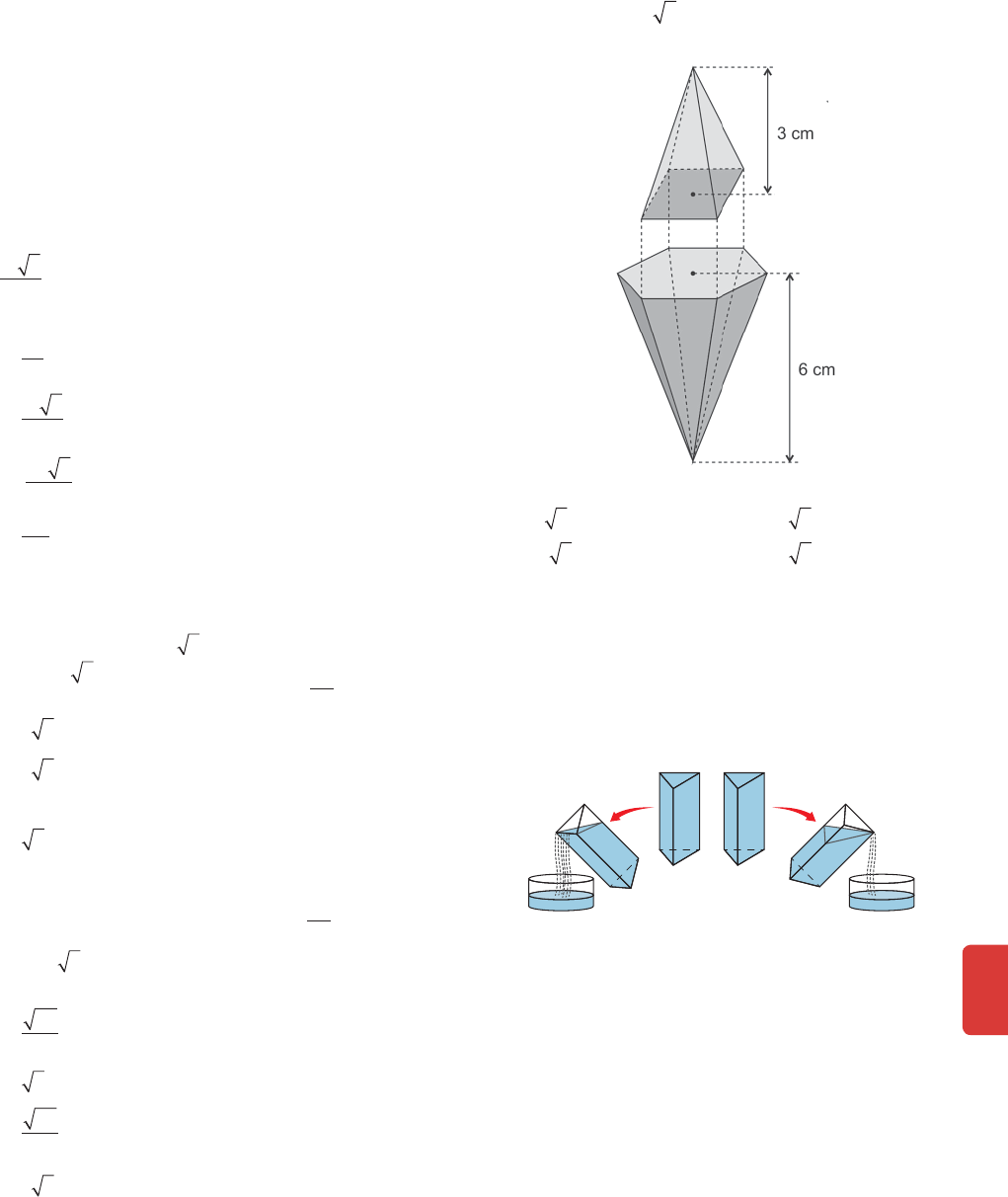 F R E N T E 3 313 • a diagonal da base maior de cada tronco está contida na diagonal da face do cubo que a contém e mede a sua terça parte; • a diagonal da base menor de cada tronco mede a ter ça parte da diagonal da base maior do tronco; e • os troncos e o prisma têm alturas iguais. Assim, o volume do objeto de decoração obtido da di ferença entre o volume do cubo e o volume do sólido esquematizado na gura acima, em cm3, é um número do intervalo A [17 200, 17 800] b ]17 800, 18 400] C ]18 400, 19 000] ]19 000, 19 600] 31 AFA 2017 Se uma pirâmide hexagonal regular está inscrita num cone equilátero cujo volume é igual a 10 3 7 cm 3p , então o volume dessa pirâmide, em cm3, é igual a A 45 7 b 15 3 7 C 30 3 7 135 7 32 AFA 2014 Considere uma pirâmide regular ABCDV de base ABCD. Sendo 2 2 cm a medida da aresta da base e 2 3 cm a medida da altura dessa pirâmide, a distância, em cm, de A à aresta lateral VC é A 2 2 b 2 3 C 4 3 33 AFA 2013 Uma pirâmide regular ABCV, de base trian gular ABC, é tal, que sua aresta lateral AV mede 3 cm. Sendo 5 cm a altura de tal pirâmide, a distância, em cm, de A à face BCV é igual a A 30 2 b 7 C 26 2 2 2 34 AFA 2012 Um sólido maciço foi obtido quando a base de uma pirâmide hexagonal regular de altura 6 cm foi colada à base de uma pirâmide reta de base re- tangular e altura 3 cm, de forma que 4 dos 6 vértices da base da primeira coincidam com os vértices da base da segunda, conforme figura. Desprezando-se o volume da cola, se a aresta da base da pirâmide hexagonal mede 5 cm, então, o volume do sólido obtido, em cm3, é igual a A 15 3 b 20 3 C 25 3 30 3 35 Dois recipientes, I e II, congruentes em forma de pris- ma, cujas bases são triângulos equiláteros e as faces laterais são retangulares, estão completamente cheios de água quando são inclinados a 45°, despejando parte de seus conteúdos nos recipientes cilíndricos III e IV, inicialmente vazios: Recipiente I 45° 45° Recipiente II Recipiente III Recipiente IV Se, durante esse processo, um dos recipientes inclina- dos despeja água por uma de suas arestas, e o outro por um de seus vértices, como mostram as guras, en- tão, ao nal do processo, os respectivos volumes de água (V3 e V4) nos recipientes III e IV serão tais que: A V3 = 3V4 b 3V3 = V4 C V3 = V4 V3 = 2V4 E 2V3 = V4 MATEMÁTICA Capítulo 13 Poliedros314 36 ITA 2018 Considere a classificação: dois vértices de um paralelepípedo são não adjacentes quando não pertencem à mesma aresta. Um tetraedro é formado por vértices não adjacentes de um paralelepípedo de arestas 3 cm, 4 cm e 5 cm. Se o tetraedro tem suas arestas opostas de mesmo comprimento, então o vo- lume do tetraedro é, em cm3: A 10. b 12. C 15. 20. E 30. 37 ITA 2014 Uma pirâmide de altura h = 1 cm e volume V = 50 cm3, tem como base um polígono convexo de n lados. A partir de um dos vértices do polígono traçam se n 3 diagonais que o decompõem em n – 2 triângulos cujas áreas Si, i = 1, 2, ..., n – 2, consti- tuem uma progressão aritmética na qual S 3 2 3 = cm2 e S6 = 3 cm 2. Então n é igual a A 22 b 24. C 26 28. E 32 38 ITA 2013 Um plano intercepta as arestas de um triedro trirretângulo de vértice V, determinando um triângulo ABC cujos lados medem, respectivamente, 10 , 17 e 5 cm O volume, em cm3, do sólido VABC é A 2. b 4. C 17 . 6. E 5 10 . 39 ITA 2013 Seja ABCDEFGH um paralelepípedo de ba- ses retangulares ABCD e EFGH, em que A, B, C e D são, respectivamente, as projeções ortogonais de E, F, G e H. As medidas das arestas distintas AB, AD e AE constituem uma progressão aritmética cuja soma é 12 cm. Sabe-se que o volume da pirâmide ABCF é igual a 10 cm3. Calcule: a) As medidas das arestas do paralelepípedo. ) O volume e a área total da superfície do para lelepípedo. 40 ITA 2012 As interseções das retas r: x 3y + 3 = 0, s: x + 2y − 7 = 0 e t: x + 7y − 7 = 0, duas a duas, respec tivamente, definem os vértices de um triângulo que é a base de um prisma reto de altura igual a 2 unidades de comprimento. Determine: a) A área total da superfície do prisma. ) O volume do prisma 41 ITA 2011 Uma esfera está inscrita em uma pirâmide re- gular hexagonal cuja altura mede 12 cm e a aresta da base mede 10 3 3 cm. Então, o raio da esfera, em cm, é igual a A 10 3 3 . b 13 3 . C 15 4 2 3 E 10 3 . 42 ITA Sejam A, B, C e D os vértices de um tetraedro regu- lar cujas arestas medem 1 cm. Se M é o ponto médio do segmento AB e N é o ponto médio do segmento CD , então a área do triângulo MND, em cm 2, é igual a A 2 6 b 2 8 C 3 6 3 8 E 3 9 43 ITA A razão entre a área lateral e a área da base octo- gonal de uma pirâmide regular é igual a 5. Exprima o volume desta pirâmide em termos da medida a do apótema da base. 44 ITA 2018 Um poliedro convexo tem faces triangulares e quadrangulares. Sabe-se que o número de arestas, o número de faces triangulares e o número de faces quadrangulares formam, nessa ordem, uma progres- são aritmética de razão –5. Determine o número de vértices do poliedro. 45 IME 2018 Um prisma retangular reto possui três arestas que formam uma progressão geométrica de razão 2 Sua área total é de 28 cm2 Calcule o valor da diago- nal do referido prisma A 17 cm b 19 cm C 21 cm 2 7 cm E 29 cm F R E N T E 3 315 46 IME 2018 Seja um cubo regular, onde os centros de suas faces são vértices de um octaedro. Por sua vez, os centros das faces deste octaedro formado são vértices de outro cubo. Obtendo consecutivamente octaedros e cubos infinitamente, determine a razão da soma do volume de todos os poliedros inscritos pelo volume do cubo inicial. 47 IME 2016 Sejam dois quadrados de lado a situados em planos distintos que são paralelos entre si e situados a uma distância d, um do outro. A reta que liga os centros dos quadrados é perpendicular a esses planos. Cada diagonal de um quadrado é paralela a dois lados do outro quadrado. Liga-se cada vértice de cada quadra- do aos