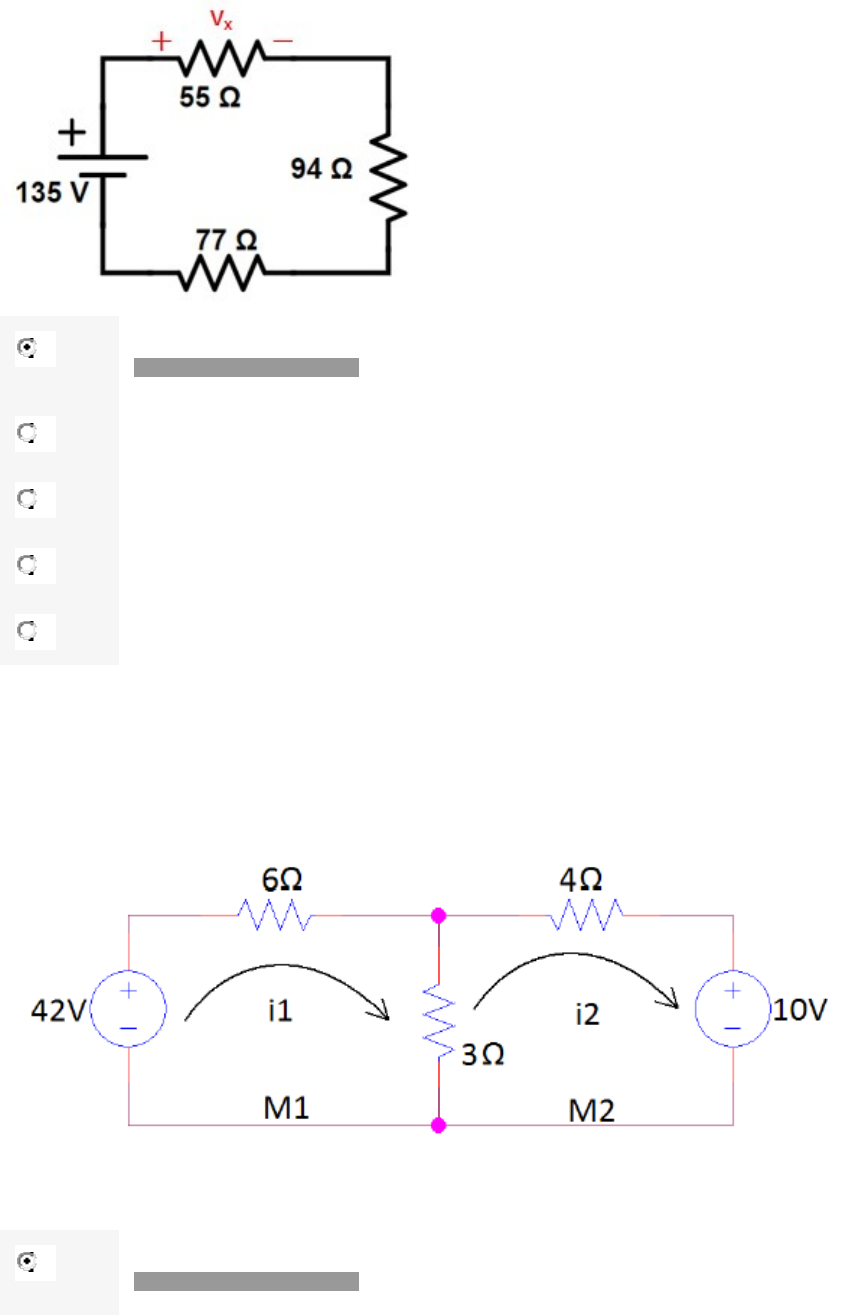 Questão 1/10 - Circuitos Elétricos I Calcule a tensão vx aplicada ao resistor de 55 ΩΩ. A 32,85 V Você assinalou essa alternativa (A) B 40,2 V C 45,99 V D 56,15 V E 70,8 V Questão 2/10 - Circuitos Elétricos I Observe o circuito mostrado e utilize análise de malhas para cacular o que se pede. Calcule o valor da corrente da malha (i1) e a corrente da malha 2 (i2). A i1 = 4,8889 A e i2 = 0,667 A Você assinalou essa alternativa (A) B i1 = 4,8889 A e i2 = 1,333 A C i1 = 6,778 A e i2 = 1,333 A D i1 = 3,972 A e i2 = 1,333 A E i1 = 10 A e i2 = 2 A Questão 3/10 - Circuitos Elétricos I Calcule a corrente i1 do circuito: Você não pontuou essa questão A 0,015 A B 0,02 A C 0,1 A D 0,4 A Você assinalou essa alternativa (D) E 0,75 A Questão 4/10 - Circuitos Elétricos I Calcular o valor da corrente ix no circuito abaixo utilizando a análise nodal por meio do cálculo das tensões dos nós (V1 e V2). Assinale a alternatia correta. A ix = -2 A. B ix = -1 A. C ix = 0 A. D ix = 1 A. E ix = 2 A. Você assinalou essa alternativa (E) Questão 5/10 - Circuitos Elétricos I Calcular as correntes das malhas (i1, i2, i3 e i4) do circuito abaixo. Assinale a alternativa correta. A i1 = -0,891 A; i2 = -2 A; i3 = -2,79 A; i4 = 7,21 A Você assinalou essa alternativa (A) B i1 = -0,891 A; i2 = -2 A; i3 = -2 A; i4 = -7,21 A C i1 = 0,891 A; i2 = 2 A; i3 = 2 A; i4 = -7,21 A D i1 = 0,891 A; i2 = -2 A; i3 = -2,79 A; i4 = 7,21 A E i1 = 0,36 A; i2 = -2 A; i3 = -2,55 A; i4 = 7,21 A Questão 6/10 - Circuitos Elétricos I Calcule os valores de R1, R2 e R3 nos circuitos equivalentes abaixo utilizando a transformação DELTA-ESTRELA e assinale a alternativa correta. A R1=270 ohms; R2=90 ohms; R3=180 ohms. B R1=270 ohms; R2=270 ohms; R3=270 ohms. Você assinalou essa alternativa (B) C R1=270 ohms; R2=180 ohms; R3=90 ohms. D R1=270 ohms; R2=180 ohms; R3=180 ohms. E R1=270 ohms; R2=90 ohms; R3=90 ohms. Questão 7/10 - Circuitos Elétricos I Calcule a corrente i2 do circuito. A 1,96 A B 2,04 A C 2,58 A Você assinalou essa alternativa (C) D 3,76 A E 5,45 A Questão 8/10 - Circuitos Elétricos I Calcule a tensão vx aplicada ao resistor de 94 ΩΩ. A 32,85 V B 40,2 V C 45,99 V D 56,15 V Você assinalou essa alternativa (D) E 70,8 V Questão 9/10 - Circuitos Elétricos I Considere o circuito abaixo: Calcule o valor das correntes i1, i2 e i3: A i1 = 0,1 A; i2 = 0,25 A e i3 = 0,78 A B i1 = 1 A; i2 = 2,909 A e i3 = 2,5 A C i1 = 10 A; i2 = 3 A e i3 = 5 A D i1 = 10 A; i2 = 3,73 A e i3 = 1,84 A Você assinalou essa alternativa (D) E i1 = 10 A; i2 = 1,4545 A e i3 = 0,9318 A Questão 10/10 - Circuitos Elétricos I Calcule a tensão vx aplicada ao resistor de 77 Ω.Ω. Você não pontuou essa questão A 32,85 V B 40,2 V C 45,99 V D 56,15 V Você assinalou essa alternativa (D) E 70,8 V