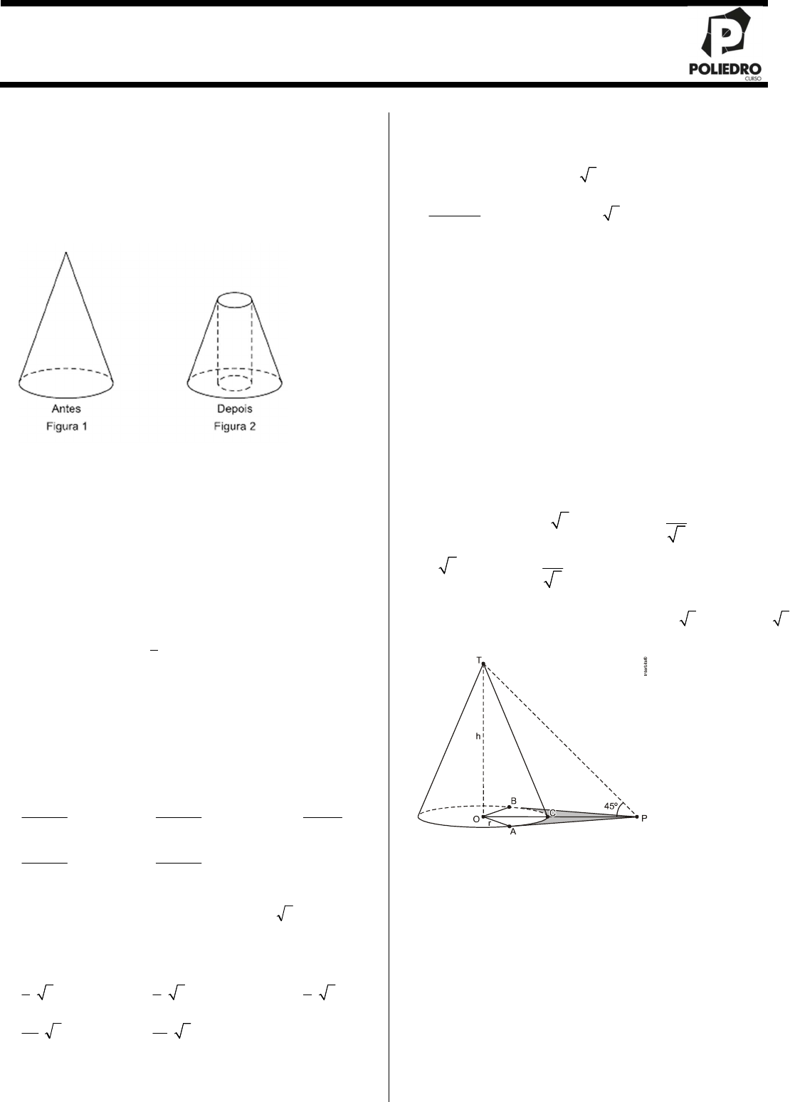 GEOM. ESPACIAL-7: CONE Prof. Marcão 1 1. (FUVEST 2006) Um torneiro mecânico dispõe de uma peça de metal maciça na forma de um cone circular reto de 15 cm de altura e cuja base B tem raio 8 cm (Figura 1). Ele deverá furar o cone, a partir de sua base, usando uma broca, cujo eixo central coincide com o eixo do cone. A broca perfurará a peça até atravessa-la completamente, abrindo uma cavidade cilíndrica, de modo a obter- se o sólido da Figura 2. Se a área da base deste novo sólido é 2/3 da área de B, determine seu volume. 2. (ITA 2012) A superfície lateral de um cone circular reto é um setor circular de 120º a área igual a 3π cm2. A área total e o volume deste cone medem, em cm2 e cm3, respectivamente 3. Um plano paralelo a base de um cone e que passa pelo centro da esfera inscrita divide esse cone em duas partes com mesmo volume. Determine o ângulo entre a geratriz e o plano do base. 4. (ITA 2009) Uma esfera é colocada no interior de um cone circular reto de 8 cm de altura e de 60º de ângulo de vértice. Os pontos de contato da esfera com a superfície lateral do cone definem uma circunferência e distam 2√3 cm do vértice do cone. O volume do cone não ocupado pela esfera, em cm3, é igual a 5.(Ita 2016) Uma esfera 1S , de raio R 0, está inscrita num cone circular reto K. Outra esfera, 2S , de raio r, com 0 r R, está contida no interior de K e é simultaneamente tangente à esfera 1S e à superfície lateral de K. O volume de K é igual a a) 5R . 3r(R r) b) 52 R . 3r(R r) c) 5R . r(R r) d) 54 R . 3r(R r) e) 55 R . 3r(R r) 6. (ITA 2000) Um cone circular reto com altura de 8 cm e raio da base de 2cm está inscrito numa esfera que, por sua vez, está inscrita num cilindro. A razão entre as áreas das superfícies totais do cilindro e do cone é igual a a) 3 2 1 2 b) 9 2 1 4 c) 9 6 1 4 d) 13 8 27 e) 27 3 1 16 7. A área lateral de um cone é igual a soma das áreas da base e da secção meridiana. Se o raio da base é igual R , então o volume do cone é : 2a)2 R 3b) 2 R 2c)3 1 2 3 2 2 R d) 3 1 3e) 1 2 R 8. (ITA 1988) Considere um cone circular reto circunscrito a uma esfera de raio 2 cm . Sabendo-se que a área do círculo, limitado pela circunferência formada por pontos de tangência as duas superfícies, é 22 cm , calcule a altura desse cone. 9. (ITA 2007) Um cone eqüilátero está inscrito numa esfera de raio igual a 4 m. Determine a que distancia do centro da esfera deve-se traçar um plano paralelo à base do cone, para que a diferença das áreas das secções (na esfera e no cone) seja igual à área da base do cone. 10. (ITA 2004) A área total da superfície de um cone circular reto, cujo raio da base mede R cm, é igual à terça parte da área de um círculo de diâmetro igual ao perímetro da seção meridiana do cone. O volume deste cone, em cm³, é igual a a) R³ b) 2R³ c) R³ 2 d) 3R³ e) R³ 3 11. (Ufmg 2013) Um cone circular reto de raio r 3 e altura h 2 3 é iluminado pelo sol a um ângulo de 45°, como ilustrado a seguir. A sombra projetada pelo cone é delimitada pelos segmentos PA e PB, tangentes ao círculo da base do cone nos pontos A e B, respectivamente. Com base nessas informações, a) DETERMINE a distância de P ao centro O do círculo. b) DETERMINE o ângulo ˆAOB. c) DETERMINE a área da sombra projetada pelo cone 12. (ITA 2002) Seja S a área total da superfície de um cone circular reto de altura h, e seja m a razão entre as áreas lateral e da base desse cone. Obtenha uma expressão que forneça h em função apenas de S e m. 2 4D 2D 2D D 13. (IME 2002) Um cone e um cilindro circulares retos têm uma base comum e o vértice do cone se encontra no centro base do cilindro. Determine o ângulo formado pelo eixo do cone e sua geratriz, sabendo-se que a razão entre a área total do cilindro e a área total do cone é 7/4. 14. (Ita 2001) O raio da base de um cone circular reto é igual à média aritmética da altura e a geratriz do cone. Sabendo-se que o volume do cone é 128ðm3, temos que o raio da base e a altura do cone medem, respectivamente, em metros: a) 9 e 8 b) 8 e 6 c) 8 e 7 d) 9 e 6 e) 10 e 8 15. (ITA 1999) Num cone circular reto, a altura é a média geométrica entre o raio da base e a geratriz. A razão entre a altura e o raio da base é: a) 2 51 b) 2 15 c) 2 15 d) 3 153 e) 2 15 16. Determine o volume de um cone com superfície lateral igual a um setor de raio 24cm e ângulo 240°. 17. (ITA 1984) A figura abaixo é a seção de dois cones retos cortados por um plano paralelo às bases. O volume da seção hachurada é: a) 3 5 D 6 b) 3 7 D 12 c) 3 1 D 3 d) 3D e) 32 D 18.(ITA 1989) Justapondo-se as bases de dois cones retos e idênticos de altura H, forma-se um sólido de volume v. Admitindo-se que a área da superfície deste sólido é igual a área da superfície de uma esfera de raio H e volume V, a razão V v vale: a) 11 1 4 b) 13 1 4 c) 15 1 4 d) 17 1 4 e) 19 1 4 19. (ITA 2006) As medidas, em metros, do raio da base, da altura e da geratriz de um cone circular reto formam, nesta ordem, uma progressão aritmética de razão 2 metros. Calcule a área total deste cone em 2m 20. (ITA 2005) Um dos catetos de um triangulo retângulo mede 3 2cm . O volume do sólido gerado pela rotação deste triângulo em trono da hipotenusa é cm³ . Determine os ângulos deste triângulo. 21. (ITA 2003) Considere o triângulo isósceles OAB, com lados OA e OB de comprimento 2 R e lado ABde comprimento 2R. O volume do sólido, obtido pela rotação deste triângulo em torno da reta que passa por O e é paralela ao lado AB , é igual a: a) 3R 2 b) 3R c) 3R 3 4 d) 3R2 e) 3R3 22. (Epcar (Afa) 2016) Considere a região E do plano cartesiano dada por y x 1 3 3 y x 1E x 0 y 0 O volume do sólido gerado, se E efetuar uma rotação de 270 em torno do eixo Ox em unidades de volume, é igual a a) 26 3 b) 26 c) 13 2 d) 13 3 23. (Ita 2014) Três circunferências C1, C2 e C3 são tangentes entre si, duas a duas, externamente. Os raios r1, r2 