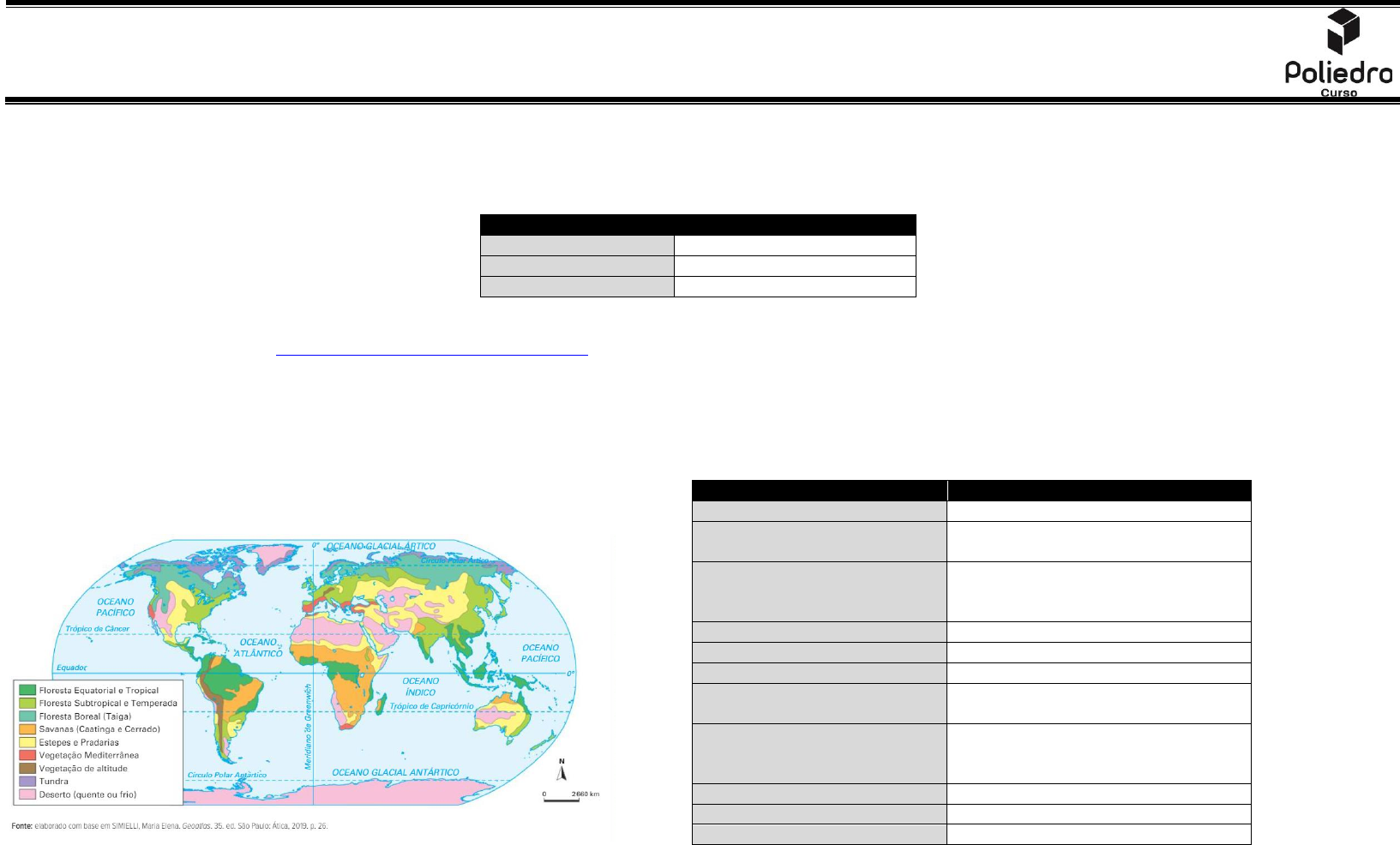 Turma EXTENSIVO ON-LINE Geografia 1- BIOGEOGRAFIA MUNDIAL Prof.ª Thais Formagio Página 1 de 4 Aula 14- Biogeografia Mundial Disciplina: Geografia | Frente: 1 Livro: 3 | Capítulo: 14 Páginas: 569 a 576 Orientações de Estudos Para praticar 1 a 10 É assim no ENEM 1 e 2 De olho na BNCC 1 a 4 Aprofundamento: Debate FAPESP- Biomas e Biodiversidade: https://www.youtube.com/watch?v=1R1VFBP0IBs Ser tão Velho – Documentário sobre o Cerrado: Disponível na Netflix (assista para a próxima aula- Vegetação do Brasil) Ficha Resumo A Biogeografia é o ramo da Geografia que estuda a constituição e dispersão dos diferentes biomas na superfície terrestre. Eles são definidos pela interação entre os elementos naturais: solo, hidrografia, relevo, clima, vegetação e seres vivos, formando ambientes uniformes. Mundo: vegetação original* *É importante salientar que o mapa de vegetação representa a área ocupada pela vegetação nativa, que existia antes das transformações humanas. Classificação Características Perenes Apresentam folhas o ano todo. Caducifólias, decíduas ou estacionais Perdem folhas nas estações muito frias ou secas. Ombrófilas Exigem proteção da radiação solar direta. Plantas adaptadas à sombra e umidade elevada. Esclerófilas Possuem folhas duras. Xerófitas Adaptadas à escassez de água. Higrófilas Adaptadas à ambientes com muita água. Tropófilas Habituadas às estações úmidas e as às secas. Pneumatóforas Crescem em áreas com solos pobres em oxigênio, assim estão adaptadas a trocas gasosas com o ambiente. Halófitas Adaptadas ao mar e a salinidade. Aciculifoliadas Apresentam folhas em forma de agulhas. Latifoliadas Exibem folhas largas https://www.youtube.com/watch?v=1R1VFBP0IBs Turma EXTENSIVO ON-LINE Geografia 1- BIOGEOGRAFIA MUNDIAL Prof.ª Thais Formagio Página 1 de 4 BIOMA LOCALIZAÇÃO TEMPERATURA CHUVA CLIMA FITOFISIONOMIA SOLOS ANIMAIS DEGRADAÇÃO 1- Floresta Tropical - Baixas Latitudes (próximo ao Equador); - América do Sul, na América Central, no centro da África, nas penínsulas do Sudeste Asiático e na Indonésia. - Elevada incidência solar; - Baixa amplitude térmica; -Média anual de 20 a 30º. - Área convectiva; - Muita umidade (+ de 2000 mm/ano); - Ausência de estação seca. Equatorial e Tropical - Higrófilas; Estratificadas; Latifoliadas; Perenifólias; Ombrófilas; - Árvores de 18 a 46 metros. - Castanheiras, Seringueiras, Bromélias, Samambaias. - Pobres e Lixiviados; - Profundos; - Nutrientes distribuídos entre o solo e vegetação. Um auto sustento (ciclo da vegetação) - Elevada biodiversidade; - Elevada densidade da biomassa. - Onça, Gorilas, Tucanos, Cobras. Desmatamento, Avanço da fronteira agrícola, caça ilegal. 2- Floresta Temperada - Médias Latitudes (variação da incidência solar anual); - Entre os trópicos; - América do Norte, Europa, Japão, Chile. - 4 estações bem definidas; - Média anual moderada. - Pluviosidade média; - 750 a 1500 mm/ano; - Bem distribuída. Temperado - Homogênea; Caducifólias/decíduas. - Abundantes em matéria orgânica; - Folhas que caem permitem o ciclo ecológico. - Ursos, Raposas, Castores, Veados, Esquilos. (migram ou hibernam). - Bioma mais degradado do mundo! - Área muito industrializada e urbanizada. 3- Savanas (Campos Tropicais) - Distribuição e Origem controvérsia; - Muitas tipologias são intituladas savanas; - Brasil (Cerrado); África (savana); Austrália. - Elevada; - Presença natural do fogo durante a seca (controlador e estimulador do rebrotamento das herbáceas). - Má distribuída (1000 a 1500 mm/ano); - Concentrada no verão. Tropical - Herbáceas e Arbustos (alguns com xeromorfismo); - Árvores espaçadas entre si; - Espécies variam de acordo com os nutrientes do solo e umidade. - Pobres e ácidos (lateríticos); - Mais férteis na África (sustentam o Baobá, Acácias). - Grandes herbívoros e Carnívoros; - Capivara, Avestruz, Girafas, Leão ... - Pastagem; Agricultura; Caça Ilegal. 4- Campos Temperados (Pradarias na América do Norte e Campos na América do Sul) - Médias Latitudes; - América do Norte; - América do Sul; - Austrália (scrub); - Hungria (Puzta); - Estepes em clima continental. - Varia com a localidade, mas no geral apresenta inverno rigoroso. - Estepes + Secos - Pradarias + Úmidas -Temperado; - Subtropical; - Temperado Continental. - Herbáceas e Gramíneas; - Vegetação Baixa (capinzal). - Relativamente férteis; - Alguns comportam água; - Estepes: solos mais secos. - Invertebrados (Gafanhotos- biomassa disponível); - Cavalos; Bovinos; Antílopes nos estepes. - Pecuária e Agricultura; - Mecanização; Arenização. 5- Desertos Frios: Polos Quentes: Alta Pressão; Barreiras Orográficas; Correntes Marítimas Frias. - Extremos: frio e quente - Nos desertos quentes: grande amplitude térmica diária. - Raras! - Evaporação > Precipitação; - Menos de 250 mm/ano. - Desértico; - Polar; - Desertos quentes: Plantas Temporárias ou Plantas Perenes (xerófitas). - Ex. Cacto. - Litólicos; Rasos; Jovens. - Artrópodes; lagartos. Aves; roedores. - Desertificação. 6- Taiga (Floresta Boreal/Septentrional ou de Coníferas) - Médias/Altas latitudes: 45 a 70º Norte; - Península escandinava; Norte da Rússia; Canadá. - Debate: Araucárias no Sul. - 2 estações: Inverno > Verão. - Menos de 300 mm/ano; - Precipitação na forma de neve. - Subpolar. - Coníferas (corpo em forma de cone); - Aciculifoliadas (folhas na forma de agulha). - Congelado durante o inverno e descongelado durante o verão. - Alces, Lobos, Raposas; Ursos. (migram ou hibernam) - Exploração de Madeira; - Exemplo no Canadá: Indústria de Papel & Celulose. 7- Tundra - Altas Latitudes; - Acima de 57º Norte. - Inverno Longo e muito frio. - Verão Curto e Ameno. - Baixa e concentrada no verão; - Menos de 200 mm/ano. (tx. de evaporação baixa) - Subpolar; -Polar. - Líquens (nas áreas mais altas e secas); - Musgos (nas baixadas úmidas); - Arbu