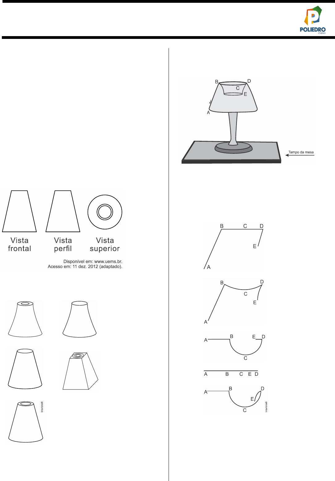 Matemática (F3) – EXT ONLINE REVISÃO - ENEM Prof. Batista 1 ORIENTAÇÃO DE ESTUDOS: Tarefa Mínima: 1, 3, 4, 5, 7, 12, 14, 20, 24, 25, 27, 30, 31, 36, 37, 41, 42. Tarefa Complementar: 2, 11, 15, 16, 18, 22, 26, 32, 33, 34, 44, 45. BONS ESTUDOS!!! _______________________________________ 1. (Enem PPL 2020) No desenho técnico, é comum representar um sólido por meio de três vistas (frontal, perfil e superior), resultado da projeção do sólido em três planos, perpendiculares dois a dois. A figura representa as vistas de uma torre. Com base nas vistas fornecidas, qual figura melhor representa essa torre? a) b) c) d) e) 2. (Enem PPL 2020) Uma formiga move-se sobre um castiçal de vidro transparente, do ponto A para B em linha reta, percorre o arco circular BCD, sendo C localizado na parte da frente do castiçal, e desce o arco DE, como representado na figura. Os pontos A, B, D e E estão sobre um mesmo plano perpendicular à mesa sobre a qual se encontra o castiçal. A projeção ortogonal, sobre o plano da mesa, do trajeto percorrido pela formiga, do ponto A até o ponto E, é melhor representada por a) b) c) d) e) 3. (Enem 2020) Em um jogo desenvolvido para uso no computador, objetos tridimensionais vão descendo do alto da tela até alcançarem o plano da base. O usuário pode mover ou girar cada objeto durante sua descida para posicioná-lo 2 convenientemente no plano horizontal. Um desses objetos é formado pela justaposição de quatro cubos idênticos, formando assim um sólido rígido, como ilustrado na figura. Para facilitar a movimentação do objeto pelo usuário, o programa projeta ortogonalmente esse sólido em três planos quadriculados perpendiculares entre si, durante sua descida. A figura que apresenta uma possível posição desse sólido, com suas respectivas projeções ortogonais sobre os três planos citados, durante sua descida é a) b) c) d) e) 4. (Enem 2020) O consumo de espumantes no Brasil tem aumentado nos últimos anos. Uma das etapas do seu processo de produção consiste no envasamento da bebida em garrafas semelhantes às da imagem. Nesse processo, a vazão do líquido no interior da garrafa é constante e cessa quando atinge o nível de envasamento. Qual esboço de gráfico melhor representa a variação da altura do líquido em função do tempo, na garrafa indicada na imagem? a) b) c) d) e) 5. (Enem 2020) Uma das Sete Maravilhas do Mundo Moderno é Templo de Kukulkán, localizado na cidade de Chichén Itzá, no México. Geometricamente, esse templo pode ser representado por um tronco reto de pirâmide de base quadrada. 3 As quantidades de cada tipo de figura plana que formam esse tronco de pirâmide são a) 2 quadrados e 4 retângulos. b) 1 retângulo e 4 triângulos isósceles. c) 2 quadrados e 4 trapézios isósceles. d) 1 quadrado, 3 retângulos e 2 trapézios retângulos. e) 2 retângulos, 2 quadrados e 2 trapézios retângulos. 6. (Enem 2019) Um grupo de países criou uma instituição responsável por organizar o Programa Internacional de Nivelamento de Estudos (PINE) com o objetivo de melhorar os índices mundiais de educação. Em sua sede foi construída uma escultura suspensa, com a logomarca oficial do programa, em três dimensões, que é formada por suas iniciais, conforme mostrada na figura. Essa escultura está suspensa por cabos de aço, de maneira que o espaçamento entre letras adjacentes é o mesmo, todas têm igual espessura e ficam dispostas em posição ortogonal ao solo, como ilustrado a seguir. Ao meio-dia, com o sol a pino, as letras que formam essa escultura projetam ortogonalmente suas sombras sobre o solo. A sombra projetada no solo é a) b) c) d) e) 7. (Enem digital 2020) Considere o guindaste mostrado nas figuras, em duas posições (1 e 2). Na posição 1, o braço de movimentação forma um ângulo reto com o cabo de aço CB que sustenta uma esfera metálica na sua extremidade inferior. Na posição 2, o guindaste elevou seu braço de movimentação e o novo ângulo formado entre o braço e o cabo de aço ED, que sustenta a bola metálica, é agora igual a 60 . Assuma que os pontos A, B e C, na posição 1, formam o triângulo 1T e que os pontos A, D e E, na posição 2, formam o triângulo 2T , os quais podem ser classificados em obtusângulo, retângulo ou acutângulo, e também em equilátero, isósceles ou escaleno. Segundo as classificações citadas, os triângulos 1T e 2T são identificados, respectivamente, como a) retângulo escaleno e retângulo isósceles. b) acutângulo escaleno e retângulo isósceles. c) retângulo escaleno e acutângulo escaleno. d) acutângulo escaleno e acutângulo equilátero. e) retângulo escaleno e acutângulo equilátero. 8. (Enem 2019) As luminárias para um laboratório de matemática serão fabricadas em forma de sólidos geométricos. Uma delas terá a forma de um tetraedro truncado. Esse sólido é gerado a partir de secções paralelas a cada uma das faces de 4 um tetraedro regular. Para essa luminária, as secções serão feitas de maneira que, em cada corte, um terço das arestas seccionadas serão removidas. Uma dessas secções está indicada na figura. Essa luminária terá por faces a) 4 hexágonos regulares e 4 triângulos equiláteros. b) 2 hexágonos regulares e 4 triângulos equiláteros. c) 4 quadriláteros e 4 triângulos isósceles. d) 3 quadriláteros e 4 triângulos isósceles. e) 3 hexágonos regulares e 4 triângulos equiláteros. 9. (Enem 2018) O remo de assento deslizante é um esporte que faz uso de um barco e dois remos do mesmo tamanho. A figura mostra uma das posições de uma técnica chamada afastamento. Nessa posição, os dois remos se encontram no ponto A e suas outras extremidades estão indicadas pelos pontos B e C. Esses três pontos formam um triângulo ABC cujo ângulo ˆBAC tem medida de 170 . O tipo de triângulo com vértices nos pontos A, B e C, no momento em que o remador está nessa posição, é a) retângulo escaleno. b) acutângul