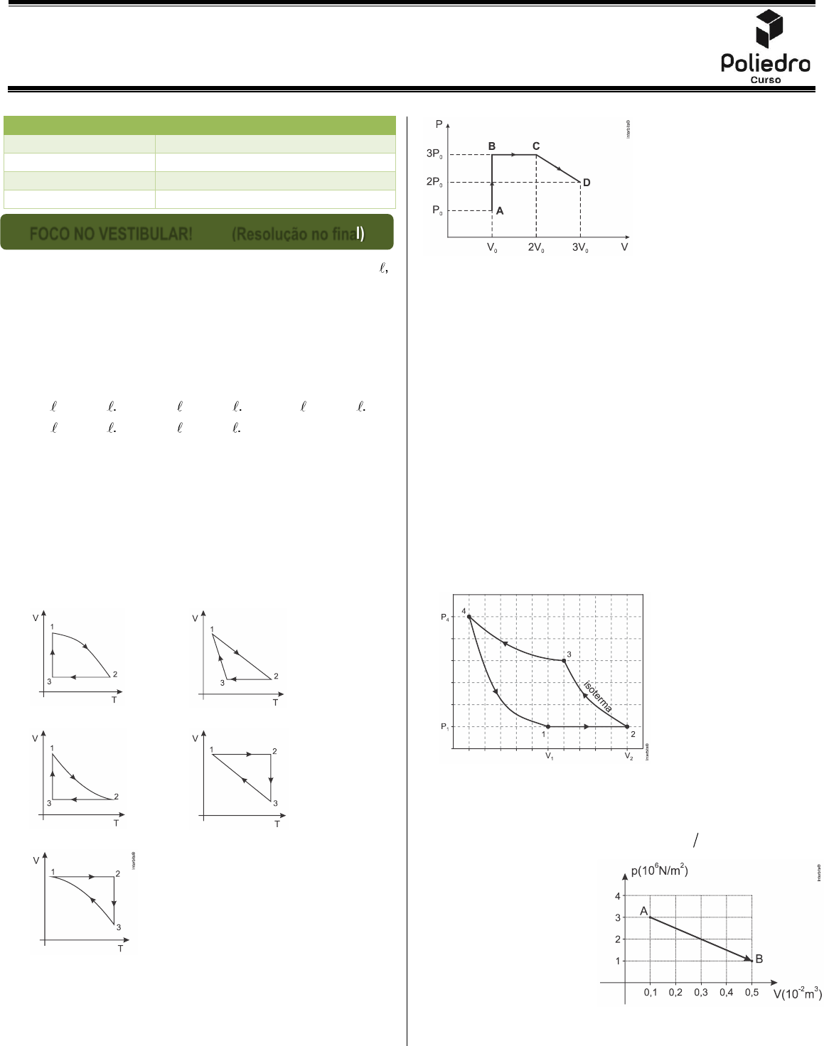 MATERIAL EXTRA – (Gases 2 – Aula 8) Turma Extensivo Online – (FÍSICA / F.3) Professor Fabio Teixeira Página 1 de 3 1. (Mackenzie 2018) Um gás perfeito, que tem um volume de 12,0 , encontra-se no interior de um frasco sob pressão de 3,00 atm e com temperatura de 200 K. Inicialmente, o gás sofre uma transformação isotérmica, de tal forma que sua pressão passa a ser de 9,00 atm, a seguir, o gás sofre uma transformação segundo a lei de Gay-Lussac, atingindo uma temperatura de 500 K. Os volumes, após as duas transformações, respectivamente, são iguais a a) 10,0 e 4,00 . b) 4,00 e 2,00 . c) 10,0 e 2,00 . d) 2,00 e 4,00 . e) 4,00 e 10,0 . 2. (Ufrgs 2020) Uma amostra de gás ideal monoatômico encontra-se em um estado inicial 1. O gás sofre três transformações sucessivas até completar um ciclo: passa do estado 1 para o estado 2 através de uma compressão adiabática; depois, passa do estado 2 para o estado 3 através de uma transformação isocórica; e, finalmente, retorna ao estado inicial 1, sofrendo uma expansão isotérmica. Qual dos diagramas volume (V) temperatura absoluta (T) abaixo melhor representa esse ciclo? a) b) c) d) e) 3. (Ufpr 2019) O diagrama P V ao lado ilustra uma sequência de processos termodinâmicos executada por um gás ideal monoatômico, passando pelos pontos A, B, C e D, caracterizados pelos valores de pressão e volume apresentados no diagrama. Tendo em vista as informações apresentadas no diagrama, considere as seguintes afirmativas: 1. O processo A B→ é isométrico. 2. Os pontos C e D estão à mesma temperatura. 3. O trabalho realizado pelo gás no processo B C→ é nulo. 4. O processo C D→ é isobárico. Assinale a alternativa correta. a) Somente as afirmativas 1 e 2 são verdadeiras. b) Somente as afirmativas 2 e 3 são verdadeiras. c) Somente as afirmativas 3 e 4 são verdadeiras. d) Somente as afirmativas 1, 2 e 4 são verdadeiras. e) As afirmativas 1, 2, 3 e 4 são verdadeiras. 4. (Unicamp 2019) Nas proximidades do Sol, a Sonda Solar Parker estará exposta a altas intensidades de radiação e a altas temperaturas. Diversos dispositivos serão usados para evitar o aquecimento excessivo dos equipamentos a bordo da sonda, entre eles um sistema de refrigeração. Um refrigerador opera através da execução de ciclos termodinâmicos. a) Considere o ciclo termodinâmico representado abaixo para um gás ideal, em que 2 1V 1,5 V= e 1T 200 K.= Calcule a temperatura 3T . b) A partir do gráfico, estime o módulo do trabalho realizado sobre o gás em um ciclo, em termos apenas de 1 2 1V , V , P e 4P . 5. (Uepg-pss 2 2019) O gráfico abaixo representa uma transformação sofrida por 4 mol de um gás ideal monoatômico. A respeito dessa transformação, assinale o que for correto. Dado: constante geral dos gases ideais R 8,31J mol K= 01) O trabalho foi realizado sobre o gás. 02) A transformação foi isobárica. 04) O trabalho realizado na transformação foi de 8 kJ. 08) A temperatura do gás para a situação A vale aproximadamente 90 K. ROTEIRO DE ESTUDOS FOCO NO VESTIBULAR! OBRIGATÓRIOS 1, 3, 5, 7, 8 e 9 APROFUNDAMENTO 2, 4 e 6 DESAFIO FOCO NO VESTIBULAR! (Resolução no final) Página 2 de 3 6. (Fgv 2018) Estamos passando por uma fase de grande evolução tecnológica. O aperfeiçoamento das máquinas e motores é evidente e, dentro em breve, o motor térmico será considerado peça de museu. Considere, no entanto, um motor térmico que realiza um ciclo representado qualitativamente pelo gráfico da pressão (p) versus volume (V) da figura, em que sua frequência de giro é f. Com esses dados, a potência efetiva desse motor será dada por a) e 2 1 3 2 2 1Pot f [(V V ) (V V )] (p p )= − + − − b) e 2 1 3 2 2 1Pot f [(V V ) (V V )] (p p ) 2= − + − − c) e 2 1 3 2 2 1Pot 2 f [(V V ) (V V )] (p p )= − + − − d) e 2 1 3 2 2 1Pot [(V V ) (V V )] (p p ) f= − + − − e) e 2 1 3 2 2 1Pot 2 [(V V ) (V V )] (p p ) f= − + − − 7. (Famerp 2018) Certa massa de gás ideal sofre a transformação cíclica 1 2 3 4 5 1− − − − − representada no diagrama de pressão (P) e volume (V). O trecho em que a força exercida pelo gás realiza o maior trabalho é a) 2 3− b) 4 5− c) 3 4− d) 1 2− e) 5 1− 8. (Ufrgs 2019) Um gás ideal contido em um cilindro com pistão pode ser levado de um estado inicial i até um estado final f, seguindo dois processos distintos, I e II, conforme ilustrado na figura abaixo. Os trabalhos WI e WII, realizados pelo gás nos processos I e II, valem respectivamente a) 10 J e 30 J. b) 20 J e 20 J. c) 20 J e 30 J. d) 30 J e 10 J. e) 30 J e 20 J. 9. (Uefs 2018) Determinada massa de gás ideal pode ser levada de um estado inicial A para um estado final D por dois caminhos: a transformação isotérmica AD ou a transformação ABCD, composta de duas transformações isovolumétricas (AB e CD) e de uma transformação isobárica (BC), conforme mostra o gráfico. Sendo τ o trabalho realizado pelas forças de pressão exercidas pelo gás nessas transformações, é correto afirmar que: a) AD ABCDτ τ= b) ABCD ADτ τ c) AB 0τ e CD 0τ d) AD 0τ = e) BC 0τ Resposta da questão 1: [E] Usando a equação geral dos gases, temos: Para o processo isotérmico: = 1 1 2 2P V P V = = =1 12 2 2 P V 3 atm 12 L V V 4 L P 9 atm Para o processo isobárico: =3 2 3 2 V V T T = = =23 3 3 3 2 V 4 L 500 K V T V V 10 L T 200 K Resposta da questão 2: [C] Em um diagrama de Volume por Temperatura (diagrama VT) fica bem mais fácil identificar os processos isocóricos (2 3)→ e isotérmicos (3 1),→ pois aparecem, respectivamente, como retas paralelas aos eixos T (horizontal) e V (vertical). Assim, descartam-se as alternativas [B], [D], [E] por apresentarem desacordos com os processos isocórico e isotérmico. De acordo com a compressão adiabática, para aumentar a pressão o volume deve diminuir bruscamente, pois, de acordo com a equação dos gases ideais, estas grandezas são inversamente proporcionais, e, 