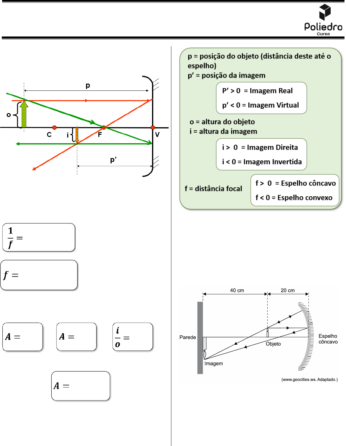 RESUMO – (Espelhos Esféricos - Analítico – Aula 14) Turma EXTENSIVO ONLINE – (Física / F.3) Professor Fabio Teixeira Página 1 de 2 7. Estudo Analítico Equação de Gauss: Aumento Linear (Ampliação) [A] Foco No Vestibular! 1. (Famerp 2018) Um objeto luminoso encontra-se a 40 cm de uma parede e a 20 cm de um espelho côncavo, que projeta na parede uma imagem nítida do objeto, como mostra a figura. Considerando que o espelho obedece às condições de nitidez de Gauss, a sua distância focal é a) 15 cm. b) 20 cm. c) 30 cm. d) 25 cm. e) 35 cm. Página 2 de 2 2. (Famerp 2017) Uma calota esférica é refletora em ambas as faces, constituindo, ao mesmo tempo, um espelho côncavo e um espelho convexo, de mesma distância focal, em módulo. A figura 1 representa uma pessoa diante da face côncava e sua respectiva imagem, e a figura 2 representa a mesma pessoa diante da face convexa e sua respectiva imagem. a) Considerando as informações contidas na figura 1, calcule o módulo da distância focal desses espelhos. b) Na situação da figura 2, calcule o aumento linear transversal produzido pela face convexa da calota. 3. (Famerp 2021) A figura mostra um objeto luminoso colocado sobre o eixo principal de um espelho esférico côncavo, que obedece às condições de Gauss, e dois raios de luz, 1 e 2, que partem do objeto e incidem na superfície refletora do espelho. Considere que o raio 1 seja paralelo ao eixo principal do espelho e que os pontos C, F e V correspondam, respectivamente, ao centro de curvatura, ao foco principal e ao vértice do espelho. a) Na figura a seguir, esboce as trajetórias dos raios 1 e 2 após refletirem no espelho. b) Sabendo que a distância focal do espelho é 30 cm, que a distância do objeto ao espelho é 90 cm e que a altura do objeto é 6,0 cm, calcule a distância da imagem ao espelho e a altura da imagem, ambas em centímetros.