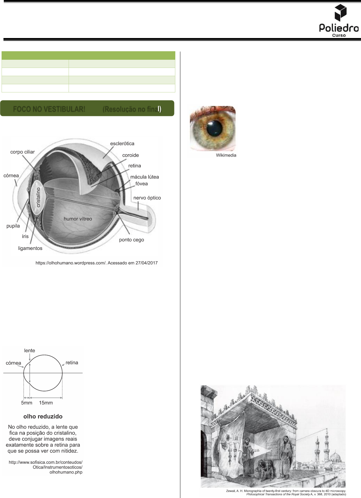 MATERIAL EXTRA – (Óptica da visão – Aula 19) Turma Extensivo Online – (FÍSICA / F.3) Professor Fabio Teixeira Página 1 de 7 1. (Fac. Albert Einstein - Medicin 2017) Óptica da Visão O olho humano, responsável pela visão, pode distinguir cerca de 10 milhões de cores e é capaz de detectar um único fóton. É um sistema óptico complexo, formado por vários meios transparentes, além de um sistema fisiológico com inúmeros componentes e todo o conjunto é chamado GLOBO OCULAR. Pela complexidade de se traçar os trajetos dos raios luminosos através desses diferentes meios, convencionou-se representar todos eles por uma única lente convergente biconvexa (o cristalino), de distância focal variável, essa representação é chamada de olho reduzido. Chama-se Óptica da Visão o estudo das trajetórias dos raios luminosos, através do globo ocular, até a formação de imagens no cérebro. As pessoas que tem visão considerada normal, emetropes, têm a capacidade de conjugar imagens nítidas para objetos situados em média a 25 cm da lente (ponto próximo), por convenção, até distâncias no infinito visual (ponto remoto). O cristalino é uma lente transparente e flexível, localizada atrás da pupila. Sua distância focal pode ser ajustada para focar objetos em diferentes distâncias, num mecanismo chamado acomodação. A íris (na figura acima) é a área verde/cinza/marrom (castanha), medindo cerca de 12 mm de diâmetro. As outras estruturas visíveis são a pupila (círculo preto no centro) e a esclera (parte branca do olho) ao redor da íris. A córnea está presente, mas não é possível vê-la na foto, por ser transparente. Teoricamente, poderíamos pensar no centro da pupila como sendo o centro da íris. A pupila é um espaço vazio em forma circular, normalmente preto, definido pela margem interior da íris. Mede de 1,5 mm de diâmetro com muita luz até 8mm de diâmetro com pouca luz. Sua função é controlar a passagem de luz que chega até a retina. Quando o olho é exposto a níveis de iluminação muito elevados, a pupila se contrai (na verdade a íris dilata), efeito chamado de Pupillary Reflex. a) Admita a íris da figura recebendo pouca luz. Qual a área da região colorida? (adote 3,1)π b) Chamamos de amplitude de acomodação visual a variação da vergência do cristalino de um olho, funcionando como uma lente, capaz de conjugar imagens nítidas para um objeto situado em seu ponto próximo e no seu ponto remoto. Determine, em metros, a distância do ponto próximo para uma pessoa que possua o ponto remoto normal e cuja amplitude de acomodação visual seja de 2,5 di. 2. (Enem 2015) Entre os anos de 1028 e 1038, Alhazen (lbn al-Haytham: 965-1040 d.C.) escreveu sua principal obra, o Livro da Óptica, que, com base em experimentos, explicava o funcionamento da visão e outros aspectos da ótica, por exemplo, o funcionamento da câmara escura. O livro foi traduzido e incorporado aos conhecimentos científicos ocidentais pelos europeus. Na figura, retirada dessa obra, é representada a imagem invertida de edificações em tecido utilizado como anteparo. ROTEIRO DE ESTUDOS FOCO NO VESTIBULAR! OBRIGATÓRIOS 2, 3, 6, 8, 9, 11 e 13 APROFUNDAMENTO 1, 4, 5,12, 15 e 16 DESAFIO 7, 10 e 14 FOCO NO VESTIBULAR! (Resolução no final) Página 2 de 7 Se fizermos uma analogia entre a ilustração e o olho humano, o tecido corresponde ao(à) a) íris b) retina c) pupila d) córnea e) cristalino 3. (Ifsul 2020) João, um estudante de ensino médio, leva para a aula de Física sua receita oftalmológica, para que possa debater com o professor e seus colegas o possível defeito de visão que possui. LONGE ESFÉRICO CILÍNDRICO EIXO OD 2,00− 180 OE 1,75− 10 PERTO ESFÉRICO CILÍNDRICO EIXO OD OE Considerando que João tem dificuldade de enxergar objetos distantes e que a solução para seu problema é a utilização de óculos com lentes esféricas divergentes, é correto afirmar que o defeito de visão que esse estudante apresenta é a) astigmatismo. b) hipermetropia. c) miopia. d) estrabismo. 4. (Ufsc 2019) Em 2017, Carlos Mastrangelo, da Universidade de Utah, nos EUA, divulgou seus estudos sobre a criação de óculos formados por lentes líquidas, para fazer o foco automático. Seu objetivo foi resolver o problema de quem tem presbiopia e miopia, por exemplo, para não precisar trocar de óculos. Mastrangelo conta que os óculos possuem uma câmera infravermelha entre as lentes que serve para identificar a distância entre o rosto do usuário e o objeto que ele está olhando e, assim, fazer o foco correto. Sobre o assunto abordado e com base no exposto acima, é correto afirmar que: 01) o defeito da visão chamado hipermetropia provoca o mesmo efeito que a miopia, ou seja, o indivíduo tem dificuldades em enxergar objetos próximos. 02) uma das formas de ajustar o foco da lente é alterando sua curvatura. 04) o fenômeno óptico que explica o funcionamento de uma lente é a refração. 08) para determinar a distância, a câmera acoplada aos óculos utiliza a onda de calor liberada pelos objetos. 16) uma causa do defeito da visão chamado presbiopia está relacionada com um globo ocular mais achatado. 32) a lente utilizada para corrigir o defeito da visão chamado miopia é a lente convergente. 64) em um olho hipermetrope a imagem é formada após a retina. 5. (Enem 2019) A maioria das pessoas fica com a visão embaçada ao abrir os olhos debaixo d’água. Mas há uma exceção: o povo moken, que habita a costa da Tailândia. Essa característica se deve principalmente à adaptabilidade do olho e à plasticidade do cérebro, o que significa que você também, com algum treinamento, poderia enxergar relativamente bem debaixo d’água. Estudos mostraram que as pupilas de olhos de indivíduos moken sofrem redução significativa debaixo d’água, o que faz com que os raios luminosos incidam quase paralelamente ao eixo óptico da pupila. GISLÉN, A. et al. Visual Trai