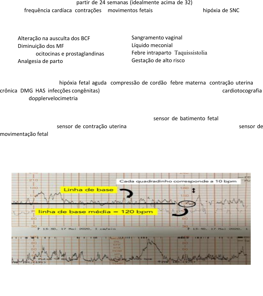 Cardiotocografia Consiste em um exame feito a partir de 24 semanas (idealmente acima de 32) que avalia a vitalidade fetal, registra a frequência cardíaca, contrações e movimentos fetais, além de identificar hipóxia de SNC de forma indireta. Ela permite um auxilio mais efetivo quando comparada ao sonar de BCF. INDICAÇÕES • Alteração na ausculta dos BCF • Diminuição dos MF • Uso de ocitocinas e prostaglandinas • Analgesia de parto SOFRIMENTO FETAL Traduz a ocorrência de hipóxia fetal aguda (compressão de cordão, febre materna, contração uterina) ou crônica (DMG, HAS, infecções congênitas). O principal exame para casos de hipóxia aguda é a cardiotocografia, enquanto a dopplervelocimetria obstétrica é indicado para casos de hipóxia crônica. INTERPRETAÇÃO DA CARDIOTOCOGRAFIA Consiste em um exame com 3 sensores, caracterizados pelo sensor de batimento fetal (no dorso fetal – Manobra de Leopold), sensor de contração uterina (avaliação do tônus – no fundo do útero) e sensor de movimentação fetal (dependente da sensibilidade materna). Linha de Base – parâmetro Média aproximada dos valores da FCF, avaliada em qualquer segmento de 10 minutos na CTG, excluindo segmentos em que haja variação da frequência cardíaca superior a 25 bpm, acelerações e desacelerações. Linha de base normal: - 110 – 160 bpm no feto à termo - 120 – 160 bpm no feto pré termo • Sangramento vaginal • Líquido meconial • Febre intraparto; Taquissistolia • Gestação de alto risco Linha base alterada: - Abaixo de 110bpm = bradicardia fetal - Acima de 160bpm = taquicardia fetal (2) (2) (2) (2) (2) (2) (2) (2) (2) (2) (2) (2) (2) (2) (2) (2) (2) (2) (2) (2) (2) (2) (2) (2) (2) (2) (2) Variabilidade Consiste na oscilação da FCF na linha de base (variações rápidas), regulada pelo SN autônomo. Não pega de onde tem aceleração. Essa flutuação varia de 10 a 25 bpm (abaixo e acima desses valores traduzem variabilidade comprimida (<10) ou saltatoria (>25)) → USP 6 a 25 bpm → MS Aceleração transitória Aumento da FCF, ≥ 15 bpm em relação a linha de base, com duração mínima de 15 segundos e máxima de 2 minutos após 32 semanas. Para um feto ser considerado saudável, são necessárias pelo menos duas acelerações em 20 minutos. Pega o pico maior e subtrai do menor. É uma resposta do feto saudável a um estimulo ou situação de stress. (2) < 32 semanas: 10 batimentos em 10s > 2 min mudança da linha de base Desacelerações Traduzem quedas periódicas da FCF em mais de 15 bpm por mais de 15 seg, podendo ser: • Não periódicas (sem ralação com as contrações uterinas): DIP-0 ou desaceleração prolongada. • Periódicas (expressam alguma relação com a contração uterina): DIP-I, DIP-II e DIP-III DIP-0: observada no traçado da CTG, sem relação com a contração. Normalmente é um queda com bradicardia prolongada. DIP-I (desaceleração precoce): Imagem em espelho com a contração (Pode ter decalagem curta). Queda gradual e simétrica. Duração maior que 30s. Ele ocorre pela compressão do polo cefálico fetal com reflexo vagal. DIP-II (desaceleração tardia): normalmente é patológico, devido a presença de decalagem (espaço entre o pico da contração e o pico da desaceleração = não são coincidentes), implica em insuficiência placentária, ocorrendo diminuição da reserva de oxigênio comprometendo a oxigenação fetal durante a contração. DIP-III (desaceleração variável): queda abrupta de recuperação rápida, normalmente não esta associado a contração. DIP-I é fisiológico quando são fisiológicas quando ocorrem no trabalho de parto da bolsa rota; no final da dilatação; no período expulsivo e no oligoamnio Favorável (aceleração inicial e secundaria) Desfavorável (recuperação lenta, perda da oscilação com desaceleração dupla → mal prognostico) (2) (2) (2) (2) (2) (2) (2) (2) (2) (2) (2) (2) (2) (2) Tratamento para DIP3 DESFAVORÁVEL: indicação absoluta de cesárea (2) (2) (2) (2) (2) (2) Contrações Uterinas Deve-se avaliar a dinâmica uterina (quantas contrações por 10 min), determinando se há taquissistolia e identificando sua causa se possível (uso de ocitocina é a mais comum). Interpretação de CTG normal: analisar os parâmetros acima citados, avaliar linha de base (entre 110 a 160), variabilidade (USP: 10 A 25bpm e MS: 6 a 25); aceleração transitória (no mínimo 2) e ausência de desaceleração CARDIOTOCOGRAFIA ANTEPARTO (fora do trabalho de parto) CTG com padrão tranquilizador: todos os parâmetros normais CTG com padrão não-tranquilizador: quando ocorre alteração em 1 ou mais parâmetros Pontuações: • Linha de base (110-160 bpm) – 1 • Variabilidade (10-25 bpm) – 1 • Acelerações transitórias (15 segundos e 15 bpm) – 2 • Desacelerações (nenhuma) - 1 Com base nessa pontuação, o feto é classificado em: • Ativo → índice de 4 e 5 – normal (padrão tranquilizador) • Hipoativo → índice de 2 e 3 – suspeito (padrão não tranquilizador) • Inativo → índice de 0 e 1 – anormal (padrão não tranquilizador) **Quando a CTG for padrão não tranquilizador, devemos realizar outra CTG mas com estimulo** CTG COM ESTIMULO Estimulação sonora: frequência de 500 a 1.000 Hz e pressão sonora de 110 a 120 Db (Buzina Kobo). Na região do polo cefálico mantendo esse estímulo de pelo menos 3 segundos. Interpretação da CTG com estimulo sonoro: • Feto reativo: aumento da FCF maior que 20 bpm por mais de 3 minutos • Feto hiporeativo: aumento menor que 20 bpm e ou duração menor que 3 minutos • Feto não reativo: sem resposta cardíaca fetal CARDIOTOCOGRAFIA INTRAPARTO (em trabalho de parto) É indicada para gestantes com alto risco de hipóxia. • Categoria 1: todos os parâmetros estão normais – sem sinais de hipóxia • Categoria 2: o que a diferencia é a variabilidade, que estará normal, enquanto os outros parâmetros estarão al
