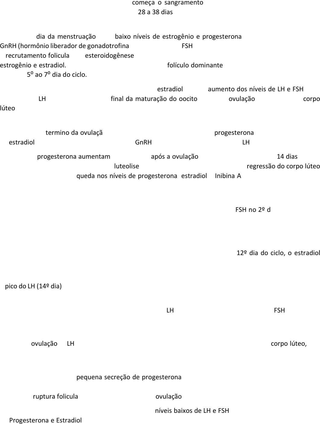 Ciclo menstrual O ciclo menstrual se inicia no dia em que começa o sangramento (1⁰ dia) e termina no dia anterior ao sangramento seguinte. Tem duração media de 28 a 38 dias e é dividido em duas fases FASE FOLICULAR Inicia-se no dia da menstruação, com baixo níveis de estrogênio e progesterona, resultando em pulsos de GnRH (hormônio liberador de gonadotrofinas), aumentando o FSH na fase folicular inicial, que é essencial para o recrutamento folicular e a esteroidogênese, cada um dos folículos recrutados secreta níveis crescentes de estrogênio e estradiol. Um desses folículos será eleito o folículo dominante e sua seleção é estabelecida em torno do 5⁰ ao 7⁰ dia do ciclo. Na fase folicular tardia, em resposta ao aumento do estradiol, ocorre aumento dos níveis de LH e FSH. Essa presença de LH é importante para o final da maturação do oocito, inicio da ovulação e formação do corpo lúteo. FASE LUTEA Inicia-se com o termino da ovulação. O corpo lúteo inicia a produção de progesterona e ocorre o 2 aumento de estradiol, mantendo a secreção pulsátil do GnRH, levando a maior liberação de LH. Os níveis de progesterona aumentam subitamente após a ovulação. A fase lútea é fixa e dura 14 dias, se não ocorre fecundação o corpo lúteo sofre luteolise (2 a 3 dias antes de sangrar). Com a regressão do corpo lúteo (final dos 14 dias) ocorre queda nos níveis de progesterona, estradiol e Inibina A levando a descamação do endométrio. COMPORTAMENTO HORMONAL No início do ciclo menstrual, há aumento dos níveis de FSH. Depois do pico de FSH no 2º dia, a tendência é que os níveis dessa gonadotrofina caiam gradativamente no transcurso do ciclo. A segunda função do FSH é transformar a testosterona em estradiol na camada granulosa do folículo ovariano. Como há um pico de FSH no início do ciclo, também haverá aumento da transformação de testosterona em estradiol, consequentemente, ocorre um aumento dos níveis de estradiol. No 12º dia do ciclo, o estradiol atinge os seus níveis máximos. O pico de estradiol é o “gatilho” para a secreção de LH. Depois de 24/48 horas do pico do Estradiol, ocorrerá o pico do LH (14º dia). Se o pico de estradiol não for suficiente, não haverá o feedback positivo para a secreção do LH e, consequentemente, não haverá ovulação. No meio do ciclo, ao mesmo tempo que ocorre o pico de LH, também haverá um plus/pico de FSH, pois a área física a ser estimulada na hipófise anterior para a liberação do LH é a mesma área física a ser estimulada para a liberação do FSH. Depois da ovulação, o LH provocará a luteinização das células foliculares para formação do corpo lúteo, que produz progesterona (hormônio da segunda fase do ciclo menstrual), hormônio responsável por manter a gestação. Observamos que há uma pequena secreção de progesterona antes da ovulação; essa pequena secreção de progesterona é responsável por diminuir a tensão superficial do folículo dominante, permitindo que o LH promova a ruptura folicular e, consequentemente, a ovulação. Portanto na segunda fase do ciclo menstrual temos: níveis baixos de LH e FSH (gonadotrofinas) e níveis altos de Progesterona e Estradiol, com predominância da progesterona nesta segunda fase → foi a partir dai que foi criado o anticoncepcional, que mantem os níveis altos de estrogênio e progesterona, impedindo que os níveis de gonadotrofinas aumentem, o que impede a ovulação. (2) (2) (2) (2) (2) (2) (2) (2) (2) (2) (2) (2) (2) (2) (2) (2) (2) (2) (2) (2) (2) (2) (2) (2) (2) (2) (2) (2) (2) (2) (2) (2) (2) (2) (2) (2) (2) (2) (2) (2) (2) (2) (2) (2) (2) DOSAGEM HORMONAL Avaliação da fertilidade feminina – Dosar o FSH, no 2º dia do ciclo, pois é quando ele atinge seu pico máximo de secreção (nesta etapa, o FSH tem como função estimular o desenvolvimento dos folículos ovarianos - foliculogênese). Avaliação da ovulação (se o estrogênio é suficiente para a ovulação) – Dosar estradiol no 12º dia do ciclo (em um ciclo ovariano com intervalo de 28 dias) Dosagem de progesterona – dosar do 14º ao 20º dia, em um ciclo com 28 dias de intervalo. Resumindo Características Fase Folicular Fase Lútea Inicio 1⁰ dia do ciclo (dia da menstruação) Com a ovulação Termino Com a ovulação Com o 1⁰ dia do ciclo Tempo Variável Fixo (14 dias) Hormônio Dominante Estrogênio Progesterona (marcador da ovulação) Gonadotrofina Dominante FSH LH Inibina Inibina B Inibina A