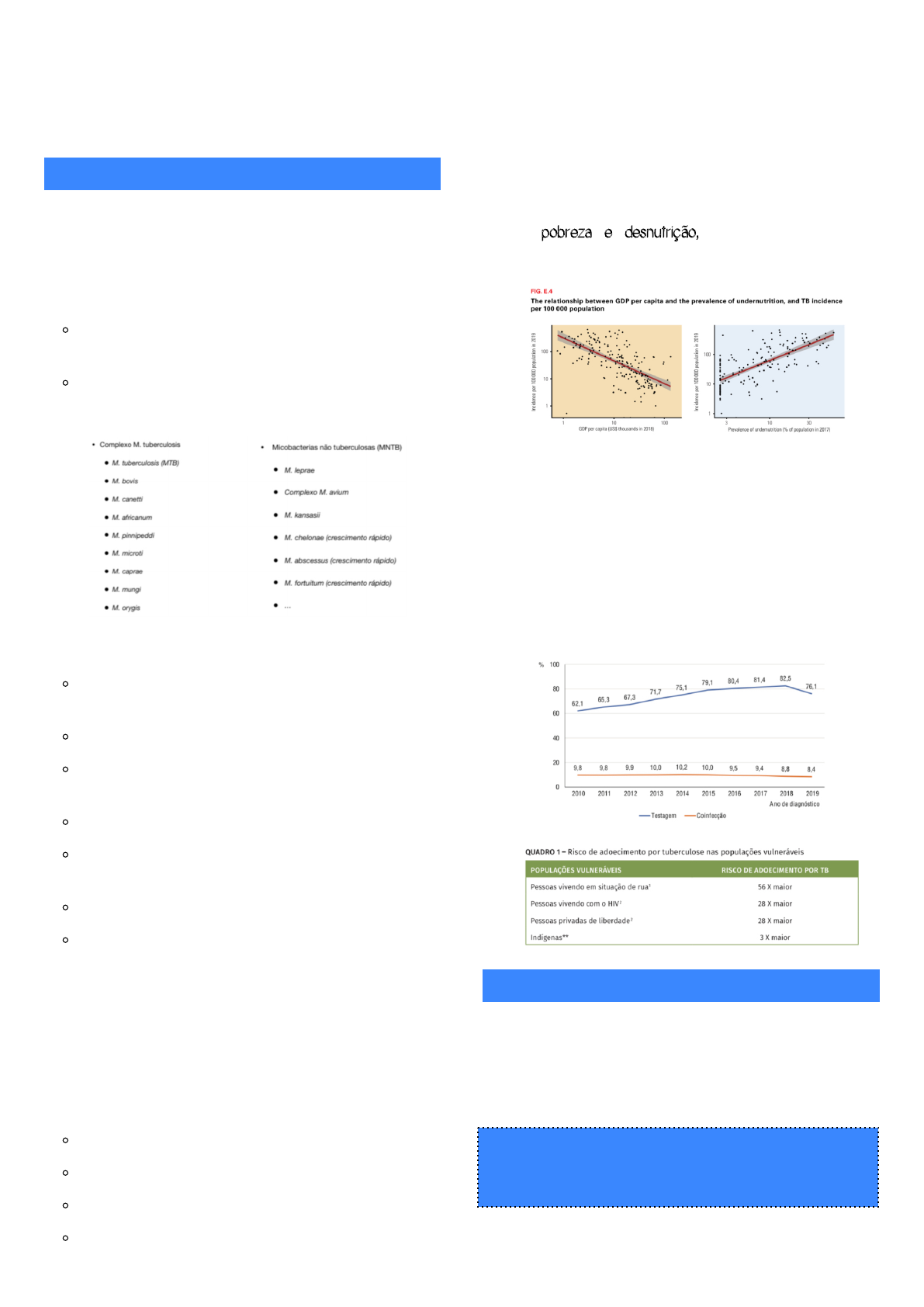 Universidade Nove de Julho Maria Lívia Introdução: • Bacilo de Koch - é o bacilo que está presente na tuberculose, são álcool ácidos resistentes (BAAR+); • Mycobacterium - um bacilo fino, ligeiramente curvo, aeróbio, medindo 0,5 a 2 um; É um BAAR, apresenta parede celular rica em lipídeos - ácido micólico, arabinogalactano; Apresenta um complexo M tuberculosis (MTB) e micobactérias não tuberculosas (MNTB); • Bacius Calmee-Guérin (BCG) - bactéria meno patogênica Maior eficácia em proteção de tuberculose miliar e meníngea; Usada para vacinação contra tuberculose; Não tem uma grande eficácia para qualquer forma de tuberculose no adulto; Indicada ser aplicada logo ao nascimento (<5 anos); Não pode ser aplicada em imunossuprimidos e RN de baixo peso; Dose única - não se recomenda uma segunda dose; Outras Indicações - profilaxia dos contatos de hanseníase e imunoterapia neoplasia vesical. Top Infectious Kier: • A tuberculose está no “top” de infecções mortais; • As evidências são tão antigas quanto a própria civilização; • Ondas: 1ª Onda - primeiras civilizações; 2ª Onda - revolução industrial; 3ª Onda - HIV; 4ª Onda - tuberculose multirresistente. Epidemiologia: • A incidência de tuberculose está diretamente relacionada com pobreza e desnutrição, sendo mais comum em homens; • A incidência em crianças é baixa; Co-Infeccao TB-HIV: • A prevalência de HIV em pessoas com tuberculose é de 8-10% • Sempre pede sorologia de HIV em quem tem tuberculose e sempre procura Tuberculose em quem tem HIV. Infecção: • Quem transmite é o paciente com tuberculose pulmonar ou laríngea; • Pessoas “bacilíferas” têm maior chance de transmissibilidade - pessoas infectadas com muita tosse; • Transmião - tosse; Tuberculose Tuberculose Pessoas bacilíferas são pacientes com cavernas cheias de bacilos. Universidade Nove de Julho Maria Lívia • Bacilo infecta na via aérea inferior (alvéolo) após ser respirado - não infecta na via aérea superior • 1. Gotículas exaladas secam e tornam-se partículas menores - < 5 a 10 um; • 2. Partículas menores ficam suspensas no ar por horas; • 3. Ao serem inaladas, são capazes de alcançar os alvéolos - ou seja, a tuberculose não infecta via área superior, por isso não há contaminação de contato, apenas ao inspirar o ar contaminado, que chega até o alvéolo; • 4. São fagocitados por macrófagos alveolares; • 5. Ocorre formação de granulomas; • Probabilidade de Infecção: Depende da infectividade do caso-fonte, da duração do contato, do tipo de ambiente compartilhado; Estima-se que 1 pessoa bacilífera infecte 10 a 15 pessoas em 1 ano; Risco de transmissão após 15 dias de tratamento efetivo é muito baixo. Tipos de Tuberculose: Tubercule Primária: • Reinfecção é possível; • Pode ser assintomática; • Manifestações clínicas são mais comuns em crianças; • Aprentaçõ - pulmonar, ganglionar, miliar (hematogênica); Pulmonar - pneumonia arrastada; Ganglionar - linfadenopatia superficial cervical (diagnóstico diferencial - linfoma), linfadenopatia profunda (intratorácico - massa mediastinal); Miliar - distribuição sanguínea da tuberculose. • Quadro Clínico - febre vespertina, sudorese noturna, anorexia, tosse; Pode evoluir p/ tuberculose latente - 1/4 dessa população apresenta tuberculose secundária. • Apresenta Complexo de Gohn, uma lesão pulmonar causada pela tuberculose que, quando calcificada, recebe o nome de complexo de Ranke; • A forma ganglionar é a forma mais comum extrapulmonar em crianças. Tubercule Secundária: • Também pode ser chamada de pós-primária; • Reativação da infecção primária latente; • Sintomas dependem do órgão acometido; Acometimento pulmonar, “sintomático respiratório” (tosse por 3 semanas ou mais); Acometimento extrapulmonar - depende do órgão acometido; Síndrome consumptiva; Febre de origem indeterminada. Diagnóstico de Tuberculose: Bacilcopia Direta: • Amtra - escarro espontâneo, escarro induzido, LBA (lavado broncoalveolar) • BAAR - coloração de Ziehl-Nielsen; • Sensibilidade se 60 a 80% na tuberculose pulmonar em adultos; • A baciloscopia direta (pesquisa de BAAR no escarro) é indicada em casos de: Sintomático respiratório; Suspeita clínica ou radiológica de tuberculose; Acompanhamento e controle de cura. Sintomático Respiratório - pessoa que, durante a estratégia programática de busca ativa, apresenta tosse por 3 semanas ou mais. Essa pessoa deve ser investigada para tuberculose através de exames bacteriológicos. E Como Realizar Coleta de Escarro? Em ambiente aberto, deve ser feito ao despertar, lavar a boca e não escovar os dentes; Inspirar profundamente e tossir/escarrar até 3x (de 5 a 10mL); Fechar o pote e colocar em saco plástico; Lavar as mãos, se não for possível a entrega imediata, conservar em geladeira até o dia seguinte. Universidade Nove de Julho Maria Lívia • Diagnóstico presumido. Tte Rápido Molecular - TRM-TB: • GeneXpert - melhor teste (sensibilidade de 95%); • Detecta gene de resistência à Rifampicina; • Não é útil para controle de tratamento; • Faz diagnóstico de certeza; • Não identifica micobactérias não tuberculosas. • Diagnóstico de certeza - escarro positivo e TRM negativo NÃO é tuberculose; • Sempre que for possível deve solicitar esse meio. Cultura e Tte de Sensibilidade: • Sempre realizar em pessoas com maior vulnerabilidade; Pessoas que vivem com HIV, profissionais de saúde; Pessoas privadas de liberdade, moradores de rua; Contato com tuberculose resistente; Retratamento - casos em que o paciente abandonou o tratamento e vai voltar a tratar. • Acrescenta 30% de sensibilidade nos casos de tuberculose pulmonar com baciloscopia negativa; • Mei Sólid - tempo de crescimento de 14 a 30 dias (até 8 semanas); • Mei Líquid Automatizad - tempo de crescimento de 5 a 12 dias (at