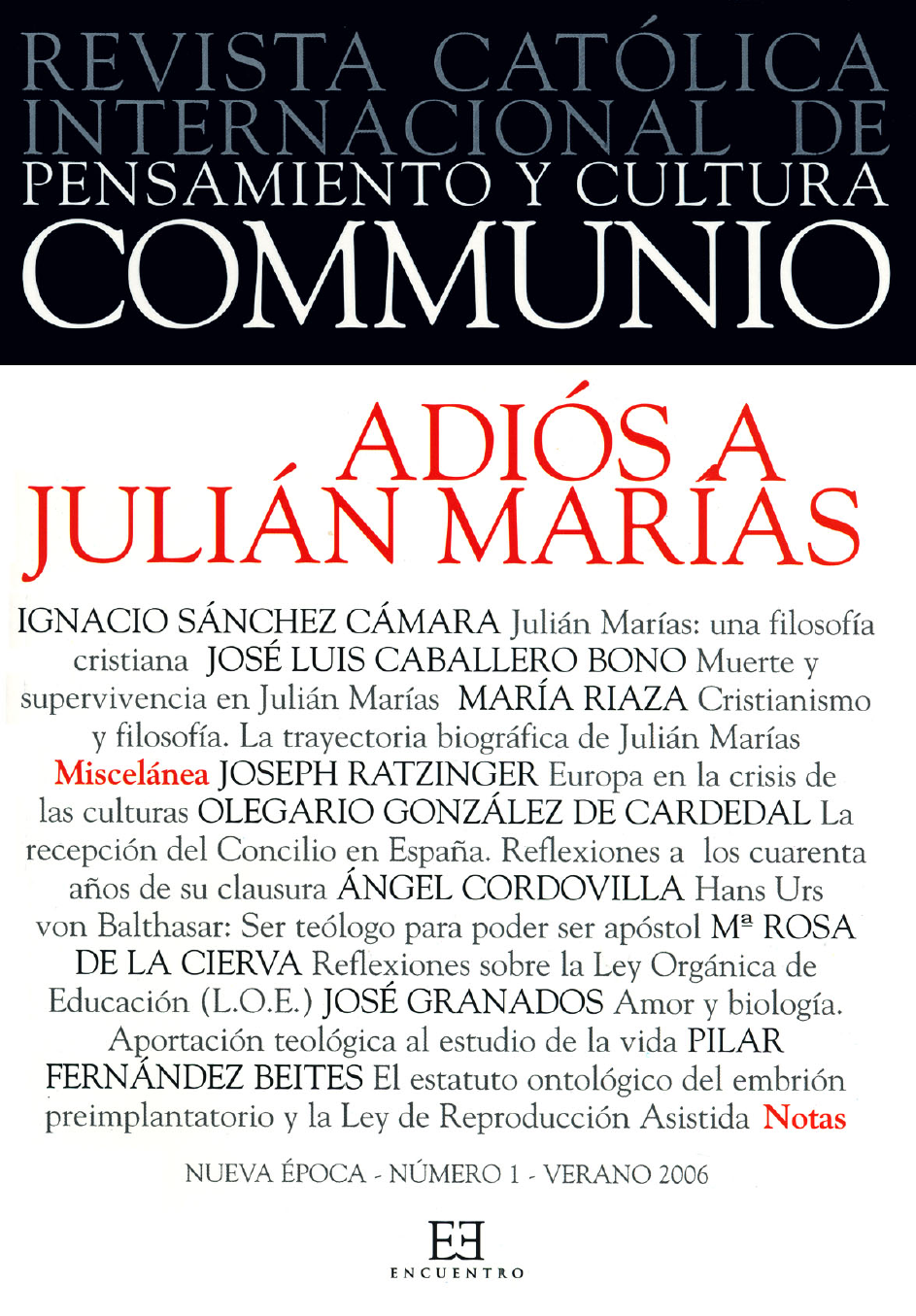 Communio I/2006 Indice Nota del Editor Editorial por Leonardo Rodríguez Duplá Julián Marías, Una filosofía cristiana por Ignacio Sánchez Cámara Muerte y supervivencia en Julián Marías por José Luis Caballero Bono Cristianismo y Filosofía. La trayectoria biográfica de Julián Marías por María Riaza Europa en la crisis de las culturas por Joseph Ratzinger La recepción del concilio en España. Reflexiones a los 40 años de su clausura por Olegario González de Cardedal Hans Urs Von Balthasar. "Ser teólogo para poser ser apóstol" por Angel Cordovilla Reflexiones sobre la ley orgánica de educación (LOE) por María Rosa de la Cierva, rscj Amor y biología. Aportación teológica al estudio de la vida por José Granados, dcjm El estatuto ontológico del embrión preimplantatorio y la ley de reproducción asistida por Pilar Fernández Beites Marina: un cristianismo postmoderno por Gabriel Alonso Literatura y sentido: la propuesta de H. Bloom por Ignacio Carbajosa La filosofía personalista de K. Wojtyla por Juana Sánchez-Grey Crónica de una exposición por Wifredo Rincón