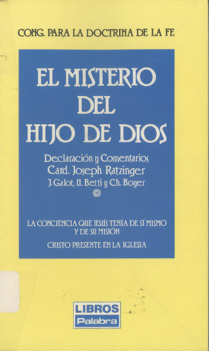 COHG. PARA LA DOCTRIHAI* LA FE EL MISTERIO DEL HIJO DE DIOS Declaración y Comentarios Card. ]o$eph Ratzinger IGalot, II. Betti y Ch. Boger LA COHCIEHCIA QUE 1ESIÍS TENÍA DE SÍ MISMO Y DE SU MISIÓM CRISTO PRESENTE EN LA IGLESIA LIBROS Palabra La versión original de este libro apareció con el título: «MYSTERIUM FILII DEI», en Librería Editrice Vaticana, Roma, 1989 © 1992 by L ibrería Editrice Vaticana - Cittá del Vaticano O 1992 de la presente edición by Ediciones Palabra, S. A. P.° de la Castellana, 210 - 28046 Madrid Traducción: Juan José Espinosa Producción: Francisco Fernández Con licencia eclesiástica Printed in Spain ISBN: 84-7118-871-6 Depósito legal: M. 20.402-1993 Pedidos a su librería editorial o a Ediciones Palabra, S. A. Anzos, S. L. - Fuenlabrada (Madrid) Card. Joseph Ratzinger JGalot, Ü. Betti y Ch. Boyer COHG. MRA LA DOCTRINA DE LA FE EL MISTERIO DEL HIJO DE caos Declaración g Comentarios LA CQNCIEHCIA QUE JESÚS TEHÍA DE SÍ MISMO Y DE Sil MISÓ1 CRISTO PRESENTE EH LA IGLESIA PRÓLOGO: M ons. A n to n io Cañ izares Segunda edición LIBROS Palabra NOTA A LA EDICIÓN ESPAÑOLA Una cuestión radical que se nos plantea hoy a los cris tianos es responder a la pregunta: «¿Por qué Jesús es la verdad definitiva del hombre y de la historia?» Esta cues tión, como dice el Cardenal Ratzinger, es decisiva. Para afirmar con la seguridad de Pedro que Jesús es el Hijo de Dios (cfr Mt 16, 16), es necesaria, por encima de las opiniones de los hombres acerca de Él, la ayuda de la gracia: así confesaremos, con la Iglesia, que Jesucristo, en su verdad más íntima, es el Mesías, el Hijo de Dios vivo. El 21 de febrero de 1972, el Papa Pablo VI firmaba y mandaba publicar a la Congregación para la Doctrina de la Fe, a cuyo frente estaba entonces el Cardenal Seper, la Declaración sobre el misterio del Hijo de Dios, Mysterium Filii Dei, con la finalidad expresa de salvaguardar los mis terios de la Encarnación y la Santísima Trinidad. Se trata de una exposición relativamente breve, en la que se pre cisan los términos dentro de los cuales debe moverse el estudioso de cristología que quiera mantenerse fiel a la fe de la Iglesia. Recientemente la Congregación para la Doctrina de la Fe, bajo la dirección del Cardenal Joseph Ratzinger, ha decidido iniciar la publicación de Instrucciones, Declara ciones y Cartas de mayor interés, emanadas de ese Dicas- terio acompañadas de comentarios teológicos que contri buyan a resaltar el sentido de tales documentos. Así ha 7 NOTA A LA EDICIÓN ESPAÑOLA nacido la colección Documenti e Studi editada por la Li brería Editrice Vaticana, y con la que Ediciones Palabra ha llegado a un acuerdo para editar en lengua castellana los títulos que hasta ahora han aparecido. Por tanto, el lector encontrará en este volumen la Declaración sobre el misterio del Hijo de Dios, la importante introducción del Cardenal Ratzinger, y los comentarios de tres teólo gos, Ch. Boyer, U. Betti y J. Galot. Pero, además, los edi tores hemos decidido introducir, con la autorización de la Congregación para la Doctrina de la Fe otros dos do cumentos sobre Jesucristo de gran interés. Uno de ellos es el texto de la Comisión Teológica In ternacional que se titula La conciencia que Jesús tenía de sí mismo y de su misión, aprobado en 1985; trabajo pre ciso, riguroso y fundado en abundantes textos de la Sa grada Escritura, que recoge buena parte de las investiga ciones del documento de la Pontificia Comisión Bíblica del año anterior, Biblia y Cristología. El otro documento que publicamos es la nota que han redactado los Obispos españoles de la Comisión para la Doctrina de la Fe, el 20 de febrero de 1992, que se titula Cristo presente en la Iglesia, sobre algunas cuestiones cris- tológicas y sus implicaciones eclesiológicas. Es un punto doctrinal de enormes consecuencias pastorales, y de una actualidad evidente. Está, pues, el lector ante un libro extraordinariamen te útil para profundizar en el conocimiento de la identi dad de Jesucristo, en el que se han aunado esfuerzos de Pastores y de teólogos. El mismo Jesús, que nace en Be lén de la Virgen María, es el que se autodefine en el Apo calipsis así: «Yo soy el Alfa y la Omega, dice el Señor Dios, aquel que es y que era, y que ha de venir, el Todopode roso» (Apc 1, 8); es nuestro hermano pero es el Hijo de Dios. Sólo reconociendo que Jesús, verdadero hombre, es NOTA A LA EDICIÓN ESPAÑOLA el Hijo de Dios, descubriremos plenamente el misterio del amor de Dios hacia nosotros, y nos sentiremos invitados a contemplar conmovidos y admirados hasta el más pe queño gesto de ese Jesús que nació, vivió, murió, resuci tó y ascendió a los cielos..., por nosotros y por nuestra sal vación. Juan José Espinosa PRÓLOGO Anunciar a Jesucristo, el Hijo de Dios vivo y Reden tor de todos los hombres, y hacer posible el encuentro sal vador con El, es el primer servicio de la Iglesia a los hom bres de todos los tiempos. En esta hora en que somos lla mados y urgidos a una nueva evangelización y ante la pu blicación del «Catecismo de la Iglesia Católica», de Juan Pablo II, este anuncio del misterio íntegro de Jesucristo cobra una especial fuerza y actualidad. La publicación en lengua española, en estos momen tos, de la Declaración de la Congregación para la Doctri na de la Fe «Mysterium Filii Dei» de 1972, constituye un gran servicio en orden precisamente a llevar a cabo la evangelización de nuestro mundo y emprender un cami no largo y hondo de catequización de los fieles cristianos que íes fortalezca y fundamente en la fe de la Iglesia y les haga capaces de proclamarla con obras y palabras. Esta Declaración nos sitúa ante el núcleo de nuestra fe: la fe en Jesucristo, el Hijo de Dios hecho hombre, ver dadero Dios y verdadero hombre, y sola persona en dos naturalezas; que «subsiste desde la eternidad, en el mis terio de Dios, distinto del Padre y del Espíritu Santo»