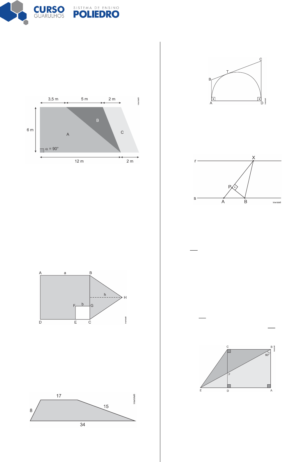 Prof. Anderson Weber Matemática Página 1 de 2 Lista de Exercícios – Áreas 1. Seja A um quadrado de lado a cuja área é nove vezes maior do que a área de um outro quadrado B, de lado b. A fração irredutível que representa a razão entre a diagonal do quadrado B e a diagonal do quadrado A possui como denominador um número a) par. b) primo. c) múltiplo de 5. d) múltiplo de 9. 2. Observe a figura abaixo. A figura representa a divisão de um terreno; o proprietário pretende vender somente a área B. Sabe-se que o valor de venda do 2m é de R$ 2.000,00. Após a venda e retirada da área B da figura, assinale a alternativa que apresenta, respectivamente, o valor da venda da área B e quanto sobrou da área do terreno para o proprietário. a) 2R$ 30.000,00 / 58,5 m . b) 2R$ 60.000,00 / 73,5 m . c) 2R$ 15.000,00 / 42,0 m . d) 2R$ 18.000,00 / 46,5 m . e) 2R$ 45.000,00 / 61,5 m . 3. Na figura a seguir, o lado do quadrado ABCD mede a 6 cm; o lado do quadrado CEFG mede b 2 cm e a altura do triângulo BCH mede h 4 cm. Assinale a alternativa CORRETA. Com base nesses dados, calcule a área da parte acinzentada da figura. a) 252 cm b) 240 cm c) 244 cm d) 248 cm e) 250 cm 4. A figura a seguir mostra um trapézio com bases medindo 17 e 34, com os comprimentos dos lados medidos em centímetros. Qual será a área desse trapézio, em centímetros quadrados? 5. Na figura a seguir ATD é uma semicircunferência inscrita no trapézio ABCD e A, T, e D são pontos de tangência. Se os lados paralelos desse trapézio medem 4 cm e 9 cm, então sua área, em 2cm , é igual a a) 22. b) 45. c) 78. d) 90. 6. Considere duas calçadas r e s, paralelas entre si, a uma distância de 6 m uma da outra. Duas pessoas distantes 5 m uma da outra se encontram nos pontos A e B definidos na calçada s. Na calçada r está uma placa de parada de ônibus no ponto X que dista 10 m da pessoa posicionada em A. Quando a pessoa em A se deslocar para P sobre o segmento AX, a distância que irá separá-la da pessoa posicionada no ponto B, em metros, será de a) 3 b) 4 c) 5 d) 6 7. Na figura abaixo: - Os pontos B, F e E são colineares; - Os pontos A, D e E são colineares; - ABCD é um quadrilátero equiângulo; - O segmento EB é bissetriz do ângulo CEA; - O ângulo ABE; mede 60 e o segmento BC mede 18 cm. Com essas informações, calcule a medida da área, em 2cm do triângulo BCE. 8. Na geometria, um trapézio retângulo é aquele que apresenta dois ângulos retos. Qual é a área do trapézio retângulo que tem um ângulo interno de 45 e bases 10 cm e 8 cm? a) 236 cm b) 216 cm c) 218 cm d) 212 cm Prof. Anderson Weber Matemática Página 2 de 2 9. A figura a seguir representa a justaposição de um trapézio isósceles e um quadrado. Se a área do trapézio vale 10 então o perímetro da figura vale a)10 18 2. b) 7 21 2. c) 11 13 2. d) 9 11 2. 10. Considere uma circunferência de centro “O” e raio “r”. Prolonga-se o diâmetro AB de um comprimento BC de medida igual a “r” e, de “C”, traça-se uma tangente que toca a circunferência em “D”. A perpendicular traçada de “C”, a BC, intersecta a reta que passa por “A” e “D” em “E”. Sendo assim, a área do triângulo ODE em função do raio é a) 2r 3 4 b) 2r 6 c) 2r 2 2 d) 2r 2 4 e) 2r 3 11. Um trapézio retângulo, cujas base maior e altura são o quádruplo da base menor e do seu perímetro, vale 14 cm e tem como área, em 2cm , o valor igual a: a) 10. b) 12. c) 14. ) 16. e) 20. 12. Sobre os lados AB e BC do retângulo ABCD são tomados os pontos M e N, respectivamente, de tal forma que AM, MB e BN tenham medida 1, e NC tenha medida 3. Nessas condições, a área do triângulo MND é a) 4. b) 2. c) 3. d) 3,5. e) 2,5. 13. Deseja-se determinar a área de um trapézio, cuja base maior mede 1 metro a mais que a altura, e a base menor 1 metro a menos que a altura. Sabendo que a altura desse trapézio mede 4 metros, qual é, em metros quadrados, a área desse trapézio? a) 10. b) 16. c) 20. d) 25. e) 30. 14. Seja o quadrado ABCD de lado 2. Traça-se, com centro no ponto M, médio do lado AB, uma semicircunferência de raio 2 que intersecta os lados BC e AD, respectivamente, em “E” e “F”. A área da superfície externa à semicircunferência e que também é interna ao quadrado, é igual a Dado: 3π a) 3 3 b) 2 3 c) 3 3 d) 2 3 e) 3 2 15. Um trapézio isósceles tem bases medindo 4 e 8. Se o perímetro desse trapézio é 20, então sua área mede a) 12 3. b) 12. c) 12 2. d) 6 3. e) 6 2. 16. Na figura a seguir, ABCD é um quadrado de lado igual a 16cm. Os segmentos AF e BE medem, respectivamente, 12 e 10cm. A área do triângulo CEF, em 2cm , é igual a a) 54 b) 80 c) 108 d) 148 17. Seja ABC um triângulo retângulo de hipotenusa 26 e perímetro 60. A razão entre a área do círculo inscrito e do círculo circunscrito nesse triângulo é, aproximadamente: a) 0,035 b) 0,055 c) 0,075 d) 0,095 e) 0,105 18. Num triângulo retângulo, os lados perpendiculares têm o mesmo comprimento e o lado oposto ao ângulo reto mede 12 2 cm. Qual é a área desse triângulo? a)12 cm2 b)24 cm2 c)72 cm2 d)144 cm2 e) 212 2 cm . 19. Na figura abaixo, os segmentos AB, AE e ED possuem o mesmo comprimento. Sendo F o ponto médio do segmento BE e sabendo-se que ABCD é um retângulo de área 200 m2, é correto concluir-se que a área do triângulo CDF, em metros quadrados, vale a) 120. b) 100. c) 90. d) 75. e) 50. 20. A figura abaixo representa um octógono regular tal que CH 6 cm. A área desse polígono, em 2cm , é igual a a) 56 2 1 b) 64 2 1 c) 72 2 1 d) 80 2 1 _________________________________________________ GABARITO: 1: B 2: A 3: C 4: 180 5: C 6: A 7: S 81 3Δ 8: C 9: A 10: A 11: A 12: E 13: B 14: B 15: A 16: C 17: D 18: C 19: D 20: C