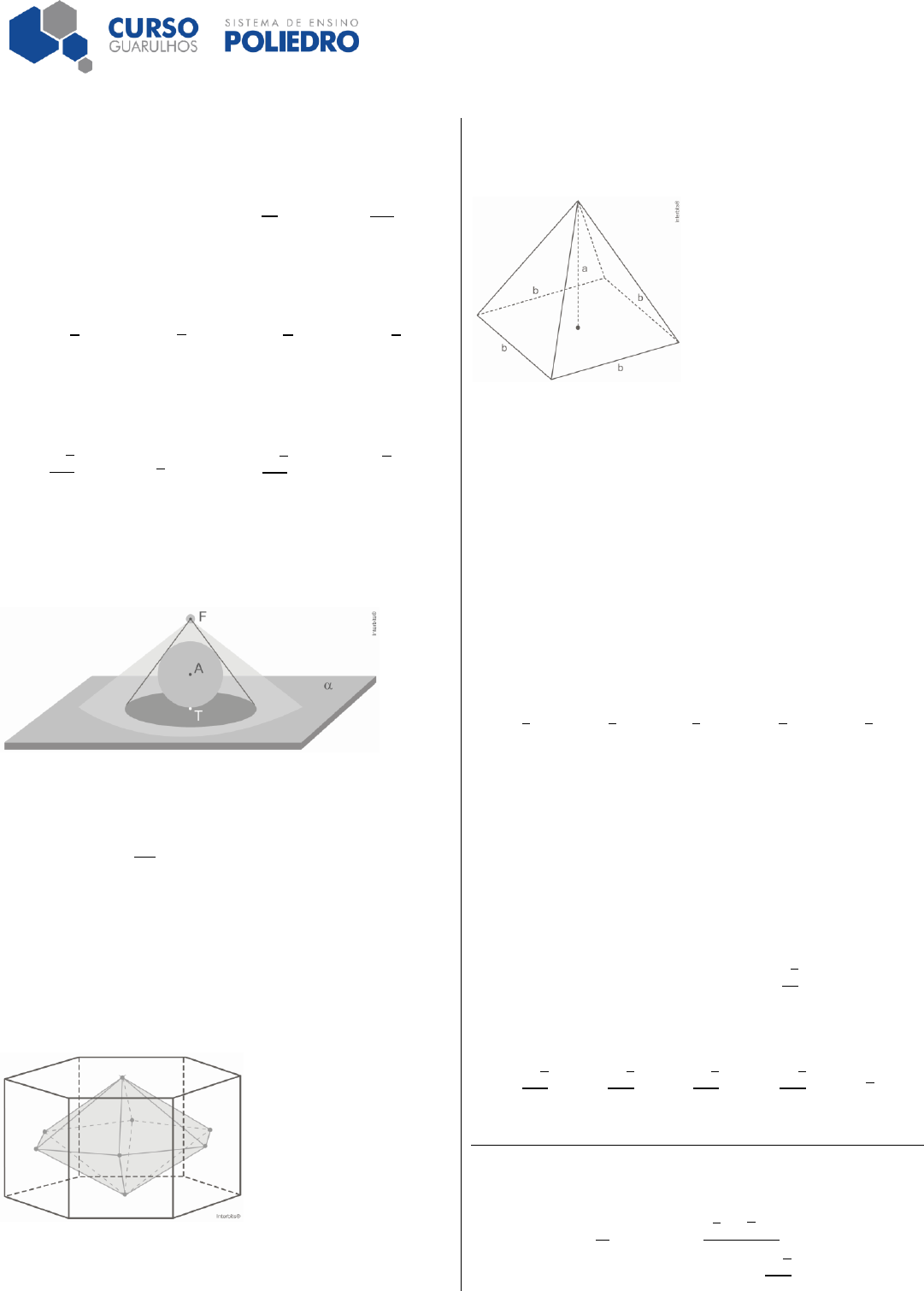 Prof. Anderson Weber Matemática Página 1 de 1 Lista de Exercícios – Sólidos inscritos e circunscritos 1. (EEAR 2017) Uma esfera está inscrita num cilindro equilátero cuja área lateral mede 16𝜋 𝑐𝑚2. O volume da esfera inscrita é a) 8𝜋 b) 16𝜋 c) 32 3 𝜋 d) 256 3 𝜋 2. (UECE 2017) Um cubo cuja medida de cada aresta é 3 𝑑𝑚 está inscrito em uma esfera de raio 𝑅. A medida de um diâmetro (2 𝑅) da esfera é a) 2√3 𝑑𝑚 b) 3√2 𝑑𝑚 c) 3√3 𝑑𝑚 d) 4√3 𝑑𝑚 3. (UNICAMP 2016) Um cilindro circular reto, cuja altura é igual ao diâmetro da base, está inscrito numa esfera. A razão entre os volumes da esfera e do cilindro é igual a a) 4√2 3 b) 4 3 c) 3√2 4 d) √2 4. (UERJ 2014) Uma esfera de centro A e raio igual a 3𝑑𝑚 é tangente ao plano 𝛼 de uma mesa em um ponto 𝑇. Uma fonte de luz encontra-se em um ponto 𝐹 de modo que 𝐹, 𝐴 e 𝑇 são colineares. Observe a ilustração: Considere o cone de vértice 𝐹 cuja base é o círculo de centro 𝑇 definido pela sombra da esfera projetada sobre a mesa. Se esse círculo tem área igual à da superfície esférica, então a distância FT, em decímetros, corresponde a: a) 10 b) 9 c) 8 d) 7 5. (UERJ 2013) Um cristal com a forma de um prisma hexagonal regular, após ser cortado e polido, deu origem a um sólido de 12 faces triangulares congruentes. Os vértices desse poliedro são os centros das faces do prisma, conforme representado na figura. Calcule a razão entre os volumes do sólido e do prisma. 6. (UNICAMP 2014) Considere a pirâmide reta de base quadrada, ilustrada na figura abaixo, com lado da base b = 6 m e altura 𝑎. a) Encontre o valor de 𝑎 de modo que a área de uma face triangular seja igual a 15 m2. b) Para a = 2 m, determine o raio da esfera circunscrita à pirâmide. 7. (ITA 2016) Em um cone circular reto de altura 1 e raio da base 1 inscreve-se um tetraedro regular com uma de suas faces paralela à base do cone, e o vértice oposto coincidindo com o centro da base do cone. Determine o volume do tetraedro. 8. (FUVEST 2014) Três das arestas de um cubo, com um vértice em comum, são também arestas de um tetraedro. A razão entre o volume do tetraedro e o volume do cubo é a) 1 8 b) 1 6 c) 2 9 d) 1 4 e) 1 3 9. (ITA 2013) Seja ABCDEFGH um paralelepípedo de bases retangulares ABCD e EFGH, em que A, B, C e D são, respectivamente, as projeções ortogonais de E, F, G e H. As medidas das arestas distintas AB, AD e AE constituem uma progressão aritmética cuja soma é 12 cm. Sabe-se que o volume da pirâmide ABCF é igual a 10 cm3. Calcule: a) As medidas das arestas do paralelepípedo. b) O volume e a área total da superfície do paralelepípedo. 10. (ITA 2010) Um cilindro reto de altura √6 3 cm esta inscrito num tetraedro regular e tem sua base em uma das faces do tetraedro. Se as arestas do tetraedro medem 3 cm, o volume do cilindro, em cm3, e igual a a) 𝜋√3 4 b) 𝜋√3 6 c) 𝜋√6 6 d) 𝜋√6 9 e) 𝜋 3 Gabarito: 1: [C] 2: [C] 3: [A] 4: [C] 5:1/4 6: a) 4m b) 𝑅 = 11 2 𝑚 7: 𝑉 = √6⋅(5√2−7) 4 8: [B] 9:a) 3 𝑐𝑚, 4𝑐𝑚 e 5𝑐𝑚 b) 94 𝑐𝑚2. 10: 𝜋√6 9 𝑐𝑚3