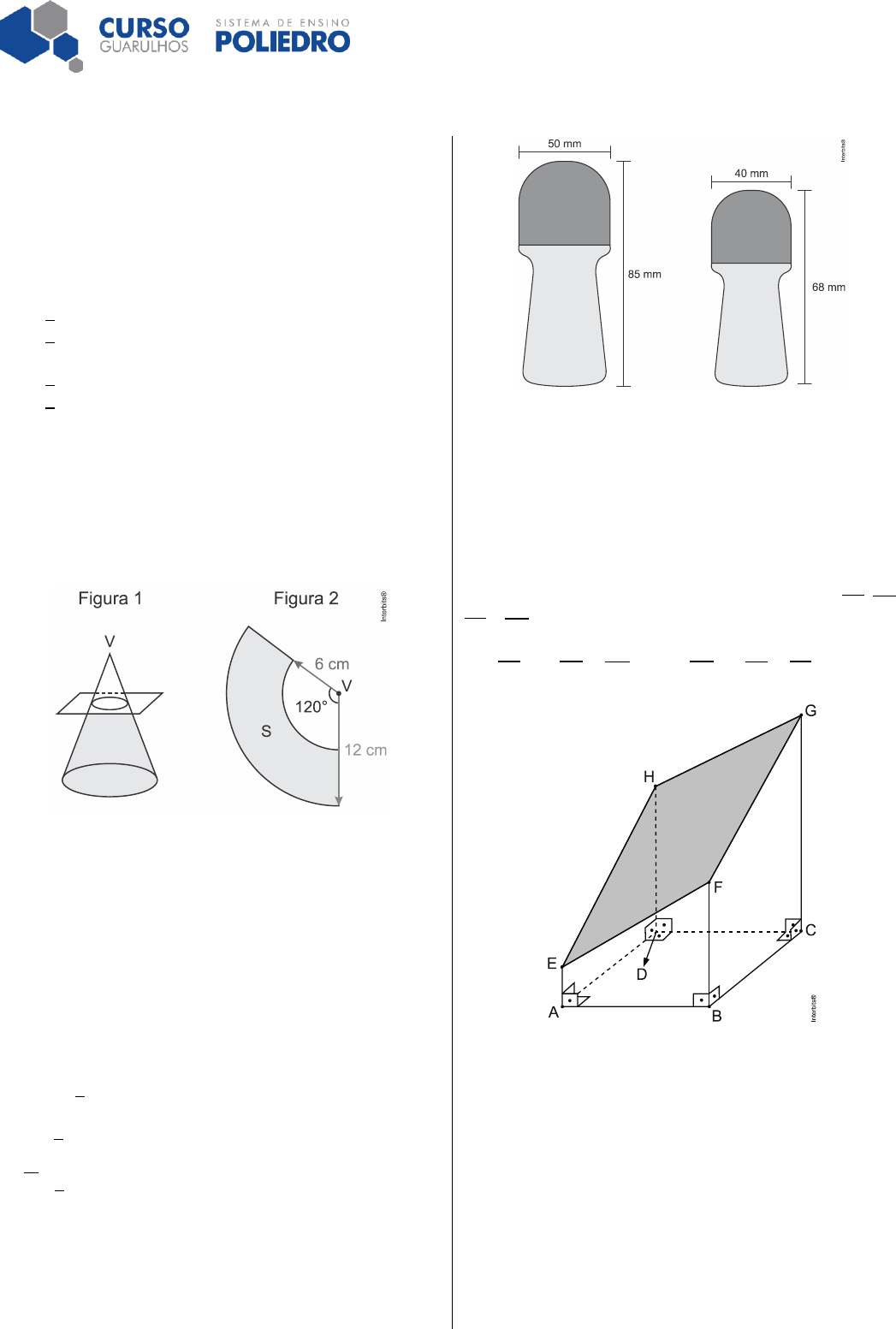 Prof. Anderson Weber Matemática Página 1 de 4 Lista de Exercícios – Troncos 1. (Ita 2019) Os volumes de um tronco de cone, de uma esfera de raio 5 𝑐𝑚 e de um cilindro de altura 11 𝑐𝑚 formam nessa ordem uma progressão aritmética. O tronco de cone é obtido por rotação de um trapézio retângulo, de altura 4 𝑐𝑚 e bases medindo 5 𝑐𝑚 e 9 𝑐𝑚, em torno de uma reta passando pelo lado de menor medida. Então, o raio da base do cilindro é, em 𝑐𝑚, igual a a) 2√2. b) 2√3. c) 4. d) 2√5. e) 2√6. 2. (Unesp 2017) Um cone circular reto de geratriz medindo 12 𝑐𝑚 e raio da base medindo 4 𝑐𝑚 foi seccionado por um plano paralelo à sua base, gerando um tronco de cone, como mostra a figura 1. A figura 2 mostra a planificação da superfície lateral 𝑆 desse tronco de cone, obtido após a secção. Calcule a área e o perímetro da superfície 𝑆. Calcule o volume do tronco de cone indicado na figura 1. 3. (Puccamp 2017) Considere dois troncos de pirâmides retas exatamente iguais. A base maior é um quadrado de lado igual a 2 metros, a base menor um quadrado de lado igual a 1 metro, e a distância entre as bases igual a 1 metro. Um monumento foi construído justapondo-se esses dois troncos nas bases menores, apoiando-se em um piso plano por meio de uma das bases maiores, formando um sólido. Desta maneira, a medida da área da superfície exposta do monumento é, em 𝑚2, igual a a) 4 + 6√5. b) 8. c) 12√2 + 4. d) 16 3 . e) 12√2 − 8. 4.(Famerp 2017) Um desodorante é vendido em duas embalagens de tamanhos diferentes, porém de formatos matematicamente semelhantes. A figura indica algumas das medidas dessas embalagens. Se a capacidade da embalagem maior é de 100 𝑚𝐿, a capacidade da embalagem menor é de a) 64,0 𝑚𝐿. b) 48,6 𝑚𝐿. c) 56,4 𝑚𝐿. d) 80,0 𝑚𝐿. e) 51,2 𝑚𝐿. 5. (Fgv 2013) No poliedro 𝐴𝐵𝐶𝐷𝐸𝐹𝐺𝐻, as arestas 𝐴𝐸, 𝐵𝐹, 𝐶𝐺 e 𝐷𝐻 são perpendiculares ao plano que contém a face retangular 𝐴𝐵𝐶𝐷, conforme indica a figura. Sabe-se ainda que 𝐴𝐸 = 1, 𝐴𝐵 = 𝐷𝐻 = 4 e 2𝐴𝐷 = 2𝐵𝐹 = 𝐶𝐺 = 6. a) Calcule a distância entre os pontos 𝐴 e 𝐺. b) Calcule o volume do poliedro 𝐴𝐵𝐶𝐷𝐸𝐹𝐺𝐻. 6. (Espcex (Aman) 2013) Um recipiente em forma de cone circular reto, com raio da base R e altura h, está completamente cheio com água e óleo. Sabe-se que a superfície de contato entre os líquidos está inicialmente na metade da altura do cone. O recipiente dispõe de uma torneira que permite escoar os líquidos de seu interior, conforme indicado na figura. Se essa torneira for aberta, exatamente até o instante em que toda água e nenhum óleo escoar, a altura do nível do óleo, medida a partir do vértice será Prof. Anderson Weber Matemática Página 2 de 4 a) √7 3 2 ℎ b) √7 3 3 ℎ c) √12 3 2 ℎ d) √23 3 2 ℎ e) √23 3 3 ℎ 7.(Ita 2012) Um cone circular reto de altura 1 cm e geratriz 2√3 3 é interceptado por um plano paralelo à sua base, sendo determinado, assim, um novo cone. Para que este novo cone tenha o mesmo volume de um cubo de aresta ( 𝜋 243 ) 1 3 cm, é necessário que a distância do plano à base do cone original seja, em cm, igual a a) 1 4 b) 1 3 c) 1 2 d) 2 3 e) 3 4 8. (Fgv 2009) A figura A mostra um copo cilíndrico reto com diâmetro da base de 10 cm e altura de 20 cm, apoiado sobre uma mesa plana e horizontal, completamente cheio de água. O copo foi inclinado lentamente até sua geratriz formar um ângulo de 45° com o plano da mesa, como mostra a figura B. Então, o volume de água derramada, em cm3, foi: a) 120𝜋 b) 125𝜋 c) 250𝜋 d) 300𝜋 e) 500𝜋 9. (Unicamp 2009) Uma caixa d'água tem o formato de um tronco de pirâmide de bases quadradas e paralelas, como mostra a figura, na qual são apresentadas as medidas referentes ao interior da caixa. a) Qual o volume total da caixa d'água? b) Se a caixa contém ( 13 6 )m3 de água, a que altura de sua base está o nível d'água? 10. (Fgvrj 2016) A figura abaixo mostra um tronco de pirâmide regular formado por dois quadrados 𝐴𝐵𝐶𝐷 e 𝐴'𝐵'𝐶'𝐷' de centros 𝑂 e 𝑂' contidos em planos paralelos e quatro trapézios congruentes. Os quadrados são as bases do tronco e a sua altura é a distância 𝑂𝑂' = ℎ entre os planos paralelos. Se 𝑆 e 𝑆' são as áreas das bases de um tronco de pirâmide de altura ℎ, o volume desse tronco é dado pela fórmula 𝑉 = ℎ 3 (𝑆 + 𝑆' + √𝑆𝑆'). São dadas, em decímetros, as medidas das arestas: 𝐴𝐵 = 12, 𝐴'𝐵' = 6, 𝐴𝐴' = 9. Calcule o volume desse poliedro em decímetros cúbicos e dê um valor aproximado usando algum dos dados abaixo. Dados: √2 ≅ 1,41, √3 ≅ 1,73, √5 ≅ 2,24, √7 ≅ 2,65. Prof. Anderson Weber Matemática Página 3 de 4 11. (Uerj 2016) Um prisma triangular reto 𝐴𝐵𝐶𝐷𝐸𝐹 foi dividido em duas partes por um plano 𝛼, de acordo com a imagem abaixo. Os ângulos 𝐵𝐴𝐶 e 𝐸𝐷𝐹 das bases do prisma são retos, e o plano 𝛼 contém os pontos 𝐴, 𝐵 𝑒 𝐺, sendo que 𝐺 pertence à aresta 𝐶𝐹 e dista 4 𝑐𝑚 de 𝐶. Calcule o volume, em 𝑐𝑚3, do maior sólido definido pela separação estabelecida no prisma pelo plano 𝛼. 12. (Uerj 2015) Um recipiente com a forma de um cone circular reto de eixo vertical recebe água na razão constante de 1 cm3 𝑠. A altura do cone mede 24cm, e o raio de sua base mede 3cm. Conforme ilustra a imagem, a altura h do nível da água no recipiente varia em função do tempo 𝑡 em que a torneira fica aberta. A medida de ℎ corresponde à distância entre o vértice do cone e a superfície livre do líquido. Admitindo 𝜋 ≅ 3, a equação que relaciona a altura ℎ, em centímetros, e o tempo 𝑡, em segundos, é representada por: a) ℎ = 4√𝑡 3 b) ℎ = 2√𝑡 3 c) ℎ = 2√𝑡 d) ℎ = 4√