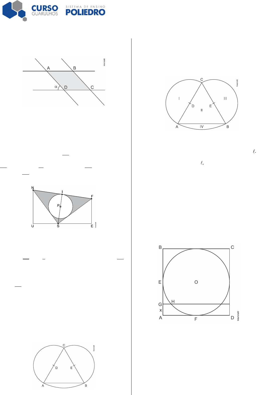 Prof. Anderson Weber Matemática Página 1 de 2 Lista de Exercícios – Revisão Geometria 1. (Unesp 2019) Na figura, as retas 𝐴𝐵 e 𝐶𝐷 são paralelas, assim como as retas 𝐴𝐷 e 𝐵𝐶. A distância entre 𝐴𝐵 ⃡ e 𝐶𝐷 ⃡ é 3 𝑐𝑚, mesma distância entre 𝐴𝐷 ⃡ e 𝐵𝐶 ⃡ . a) Calcule o perímetro do paralelogramo 𝐴𝐵𝐶𝐷, formado pelas intersecções das retas, na situação em que 𝛼 = 60°. b) Considere que 𝑆 seja a área do paralelogramo 𝐴𝐵𝐶𝐷 representado na figura. Determine 𝑆 em função de α e determine a área mínima do paralelogramo 𝐴𝐵𝐶𝐷. 2. (Unifesp 2019) A figura representa um trapézio retângulo 𝑈𝑁𝐹𝐸 de altura 𝑈𝐸 e uma circunferência de centro 𝑃 inscrita no triângulo 𝑆𝑁𝐹, com 𝑆 pertencente à 𝑈𝐸. Sabe-se que 𝑆𝐼 é perpendicular a 𝑁𝐹, que 𝐼 é o ponto médio de 𝑁𝐹 e que 𝑈𝑁 = 8 𝑐𝑚, 𝐸𝐹 = 6 𝑐𝑚 e 𝐸𝑆 = 8 𝑐𝑚. a) Calcule 𝑁𝑆 e a área do trapézio 𝑈𝑁𝐹𝐸. b) Calcule a área da região destacada em verde na figura. 3. (Ime 2019) Uma corda 𝐶𝐷 corta o diâmetro 𝐴𝐵 de um círculo de raio 𝑅 no ponto 𝐸. Sabendo que o ângulo 𝐴�̂�𝐶 = 30° e que 𝐸𝐶 = 𝑅√2, calcule a medida do segmento 𝐸𝐷. 4. (Ita 2018) A aresta lateral de uma pirâmide reta de base quadrada mede 13 𝑐𝑚 e a área do círculo inscrito na base mede 25𝜋 2 𝑐𝑚2. Dois planos, 𝜋1 e 𝜋2, paralelos à base, decompõem a pirâmide em três sólidos de mesmo volume. Determine a altura de cada um desses sólidos. 5. (Pucrj 2018) Seja 𝐴𝐵𝐶 um triângulo equilátero de lado 16.. Com centro em 𝐶, temos um arco de círculo entre 𝐴 e 𝐵, como na figura. Sejam 𝐷 e 𝐸 os pontos médios de 𝐴𝐶 e 𝐵𝐶, respectivamente. Com centros em 𝐷 e 𝐸, temos semicírculos de 𝐴 a 𝐶 e de 𝐵 a 𝐶, como na figura. a) Determine os raios dos círculos na figura, de centros C, D e E, respectivamente. b) Calcule o comprimento dos arcos AC, CB e BA. c) Calcule as áreas das quatro regiões indicadas na figura abaixo. 6. (Fuvest 2018) Uma cerca tem formato de um polígono regular de n lados, cada lado com comprimento . A égua Estrela pasta amarrada à cerca por uma corda, também de comprimento , no exterior da região delimitada pelo polígono. Calcule a área disponível para pasto supondo que: a) a extremidade da corda presa à cerca está fixada num dos vértices do polígono; b) a extremidade da corda pudesse deslizar livremente ao longo de todo o perímetro da cerca. 7. (Pucrj 2017) Considere, como na figura, um quadrado ABCD de lado 2 e um círculo inscrito de centro O e raio 1. Sejam E e F os pontos médios dos lados AB e AD, respectivamente. a) Calcule a área do quadrado e a área do círculo. b) Calcule a área da região limitada pelos segmentos AE, AF e pelo arco EF. c) Seja GH um segmento de reta paralelo ao lado AD, em que G pertence ao segmento AE e H pertence ao arco EF. Sabendo que os pontos A, H e C são colineares, calcule a área da região limitada pelos segmentos AF, AG, GH e pelo arco FH. Prof. Anderson Weber Matemática Página 2 de 2 8. (Fuvest 2016) Dois aviões vão de Brasília a Moscou. O primeiro voa diretamente para o norte, até atingir o paralelo de Moscou, quando então muda o rumo para o leste, seguindo para o seu destino final. O segundo voa para o leste até atingir o meridiano de Moscou, tomando então o rumo norte até chegar a esta cidade. a) Desprezando as variações de altitude, qual avião terá percorrido a maior distância em relação ao solo? Justifique sua resposta. b) Calcule a diferença entre as distâncias percorridas, supondo que a Terra seja esférica. Note e adote: 𝑐𝑜𝑠 56° = 0,56; 𝑠𝑒𝑛 56° = 0,83; 𝑐𝑜𝑠 16º = 0,96; 𝑠𝑒𝑛 16° = 0,28 Latitude e longitude de Brasília: 16 S e 48 W Latitude e longitude de Moscou: 56 N e 37 E Raio da Terra: 6.400 km 9. (Unicamp 2016) A figura abaixo exibe o gráfico da função f(x) 1 x,= definida para todo número real x 0. Os pontos P e Q têm abscissas x 1= e x a,= respectivamente, onde a é um número real e a 1. a) Considere o quadrilátero T com vértices em (0, 0), P, Q e (a, 0). Para a 2,= verifique que a área de T é igual ao quadrado da distância de P a Q. b) Seja r a reta que passa pela origem e é ortogonal à reta que passa por P e Q. Determine o valor de a para o qual o ponto de intersecção da reta r com o gráfico da função f tem ordenada y a 2.= 10. (Fgvrj 2016) A figura abaixo mostra um quadrado ABCD e os pontos médios de cada um dos lados. Traçando os segmentos que unem cada ponto médio aos dois vértices do lado oposto do quadrado, forma-se a “estrela” que está sombreada na figura a seguir A área da estrela representa que porcentagem da área do quadrado? Gabarito: 1. a) 8 3 cm. b) 29cm . 2. a) 298 cm . b) − − 250(1 (3 2 2)) cm .π 3. ( )2 5 1 R . 4 − 4. 3 1 23 3 12 2 1 h cm, h 12 cm 3 3 − = = e 33 3 3 3 2 h cm. 3 − = 5. a) Centro C : 16 Centros A e B : 8 b) 16 3 π c) 2 I 2 II III I 2 2 IV 8 A 32 2 16 3 A 64 3 4 A A 32 16 60 16 3 128 A 64 3 360 4 3 π π π π π = = = = = = = − = − 6. a) + 2n 2 . 2n π b) +2(n ).π 7. a) 2 quadrado 2 círculo S 2 4 S 1π π = = = = b) = −S 1 4 π c) 5 2 4 2 8 π − − 8. a) O segundo avião percorreu a maior distância. b) 1208,9 kmπ 9. a) 5 4 b) =a 4 10. 60%
