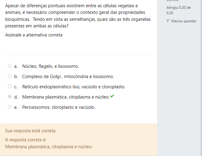 Apesar de diferenças pontuais existirem entre as células vegetais e animais, é necessário compreender contexto geral das propriedades bioquímicas. Tendo em vista as semelhanças, quais são as três organelas presentes em ambas as células? Assinale a alternativa correta. a. Núcleo, flagelo, e lisossomo. b. Complexo de Golgi, mitocôndria e lisossomo. c. Retículo endoplasmático liso, vacuolo e cloroplasto. d. Membrana plasmática, citoplasma e núcleo. e. Peroxissomos, cloroplasto e vacuolo.