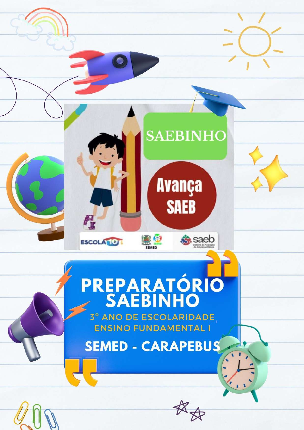 SAEBINHO 3º ANO DE ESCOLARIDADE - SEMED – PREFEITURA MUNICIPAL DE CARAPEBUS 1 PREFEITURA MUNICIPAL DE CARAPEBUS ESTADO DO RIO DE JANEIRO SECRETARIA MUNICIPAL DE EDUCAÇÃO COORDENAÇÃO DE ENSINO TÉCNICO – PEDAGÓGICA MINHA ESCOLA TEM SAEBINHO PREPARATÓRIO 01 3º ANO ENSINO FUNDAMENTAL I ESCOLA: PROFESSOR: ALUNO(A): LÍNGUA PORTUGUESA CACHORROS Os zoólogos acreditam que o cachorro se originou de uma espécie de lobo que vivia na Ásia. Depois os cães se juntaram aos seres humanos e se espalharam por quase todo o mundo. Essa amizade começou há uns 12 mil anos, no tempo em que as pessoas precisavam caçar para se alimentar. Os cachorros perceberam que, se não atacassem os humanos, podiam ficar perto deles e comer a comida que sobrava. Já os homens descobriram que os cachorros podiam ajudar a caçar, a cuidar de rebanhos e a tomar conta da casa, além de serem ótimos companheiros. Um colaborava com o outro e a parceria deu certo. www.recreionline.com.br ITEM 01- O assunto tratado nesse texto é a: (A) relação entre homens e cães. (B) profissão de zoológico (C) amizade entre os animais. (D) alimentação dos cães. Leia o texto abaixo. ITEM 02-O tema do cartaz acima alerta para os cuidados que as pessoas devem ter com os animais quanto a sua: (A) identificação. (B) alimentação. (C) reprodução. (D) vacinação. http://www.recreionline.com.br/ Leia o texto abaixo. O desperdício da água A maioria das pessoas tem o costume de desperdiçar água, mas isso tem de mudar, porque o consumo de água vem aumentando muito e está cada vez mais difícil captar água de boa qualidade. Por causa do desperdício, a água tem de ser buscada cada vez mais longe, o que encarece o processo e consome dinheiro que poderia ser investido para proporcionar a todas as pessoas condições mais dignas de higiene. Soluções inviáveis e caras já foram cogitadas, mas estão longe de se tornar realidade. São elas:retirar o sal da água do mar, transportar geleiras para derretê-las, etc. Fonte: http://www.tvcultura.com.br/aloescola/ciencias/ aguanaboca/index.htm ITEM 03- A frase que expressa a opinião do autor é: (A) “Por causa do desperdício, a água tem de ser buscada cada vez mais longe (...).” (B) “São elas: retirar o sal da água do mar, transportar geleiras para derretê-las, etc.” (C) “A maioria das pessoas não têm o costume de desperdiçar água (...).” (D) “A maioria das pessoas têm o costume de desperdiçar água, mas isso tem de mudar, porque o consumo de água vem aumentando muito (...).” Leia o trecho da música a seguir. Carinhoso PIXINGUINHA E JOÃO DE BARRO Meu coração Não sei por que Bate feliz, quando te vê E os meus olhos ficam sorrindo E pelas ruas vão te seguindo Mas mesmo assim, foges de mim. Disponível em: https://www.letras.com.br. Acesso em: 29 maio 2020. ITEM 04- A música que você leu é de autoria de: (A) Pixinguinha. (B) João de Barro. (C) Pixinguinha e João de Barro. (D) Carinhoso, Pixinguinha e João de Barro LEIA O ratinho, o gato e o galo A rã e o touro A formiga e a pomba A cigarra e a formiga ITEM 05- O título que pode fazer parte dessa lista é: (A)Chapeuzinho vermelho. (B)A raposa e o touro. (C)A Bela adormecida. (D)Hoje é domingo. SAEBINHO 3º ANO DE ESCOLARIDADE - SEMED – PREFEITURA MUNICIPAL DE CARAPEBUS MATEMÁTICA ITEM 06- Esse trenzinho foi comprado para ser dado como presente de aniversário e foi pago com uma nota de cinquenta reais. O troco devolvido foi: (A) R$ 10,00. (B) R$ 40,00. (C) R$ 50,00. (D) R$ 60,00. O gráfico a seguir apresenta o tempo de gestação, em meses, de alguns animais. ITEM 07- Os animais que têm os menores tempos de gestação são: (A) baleia e camelo. (B) camelo e girafa. (C) elefante e baleia. (D) girafa e elefante. Considere a figura geométrica plana a seguir. ITEM 08- O nome desta figura é? (A) pentágono. (B) quadrado. (C) retângulo. (D) triângulo. Considere as figuras a seguir. ITEM 09- Das figuras apresentadas a que representa um cone é? (A) (B) (C) (D) ITEM 10- A seguir está o valor de um trenzinho de brinquedo. (A) 26 (B) 25 (C) 21 (D) 20 SAEBINHO 3º ANO DE ESCOLARIDADE - SEMED – PREFEITURA MUNICIPAL DE CARAPEBUS PREFEITURA MUNICIPAL DE ENSINO FUNDAMENTAL I CARAPEBUS ESTADO DO RIO DE JANEIRO SECRETARIA MUNICIPAL DE EDUCAÇÃO COORDENAÇÃO DE ENSINO TÉCNICO-PEDAGÓGICA ESCOLA:____________________________________________________________________________ COMPONENTE CURRICULAR: LÍNGUA PORTUGUESA e MATEMÁTICA DATA:________________ ALUNO(A):___________________________________________________________________________ PROFESSOR(A):_________________________________ ANO DE ESCOLARIDADE:_________ CARTÃO RESPOSTA Agora, de acordo com as respostas que você marcou, preencha corretamente o cartão- resposta. Pinte somente UMA LETRA (resposta) para cada questão. 1. A. B. C. D. 2. A. B. C. D. 3. A. B. C. D. 4. A. B. C. D. 5. A. B. C. D. 6. A. B. C. D. 7. A. B. C. D. 8. A. B. C. D. 9. A. B. C. D. 10. A. B. C. D.