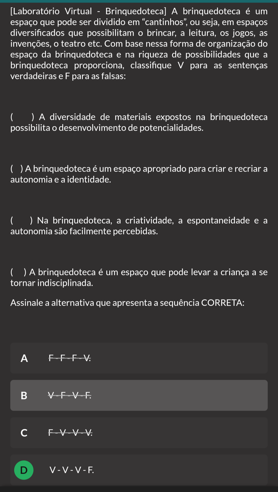 A brinquedoteca é um espaço que pode ser dividido em "cantinhos", ou seja, em espaços diversificados que possibilitam brincar, a leitura, os jogos, as invenções, teatro etc. Com base nessa forma de organização do espaço da brinquedoteca e na riqueza de possibilidades que a brinquedoteca proporciona, classifique V para as sentenças verdadeiras e F para as falsas: Assinale a alternativa que apresenta a sequência CORRETA: ( ) A diversidade de materiais expostos na brinquedoteca possibilita desenvolvimento de potencialidades. ( ) A brinquedoteca é um espaço apropriado para criar e recriar a autonomia e a identidade. ( ) Na brinquedoteca, a criatividade, a espontaneidade e a autonomia são facilmente percebidas. ( ) A brinquedoteca é um espaço que pode levar a criança a se tornar indisciplinada. A - V-V-V-F B - V-V-F-V C - V-F-V-V D - F-V-V-V
