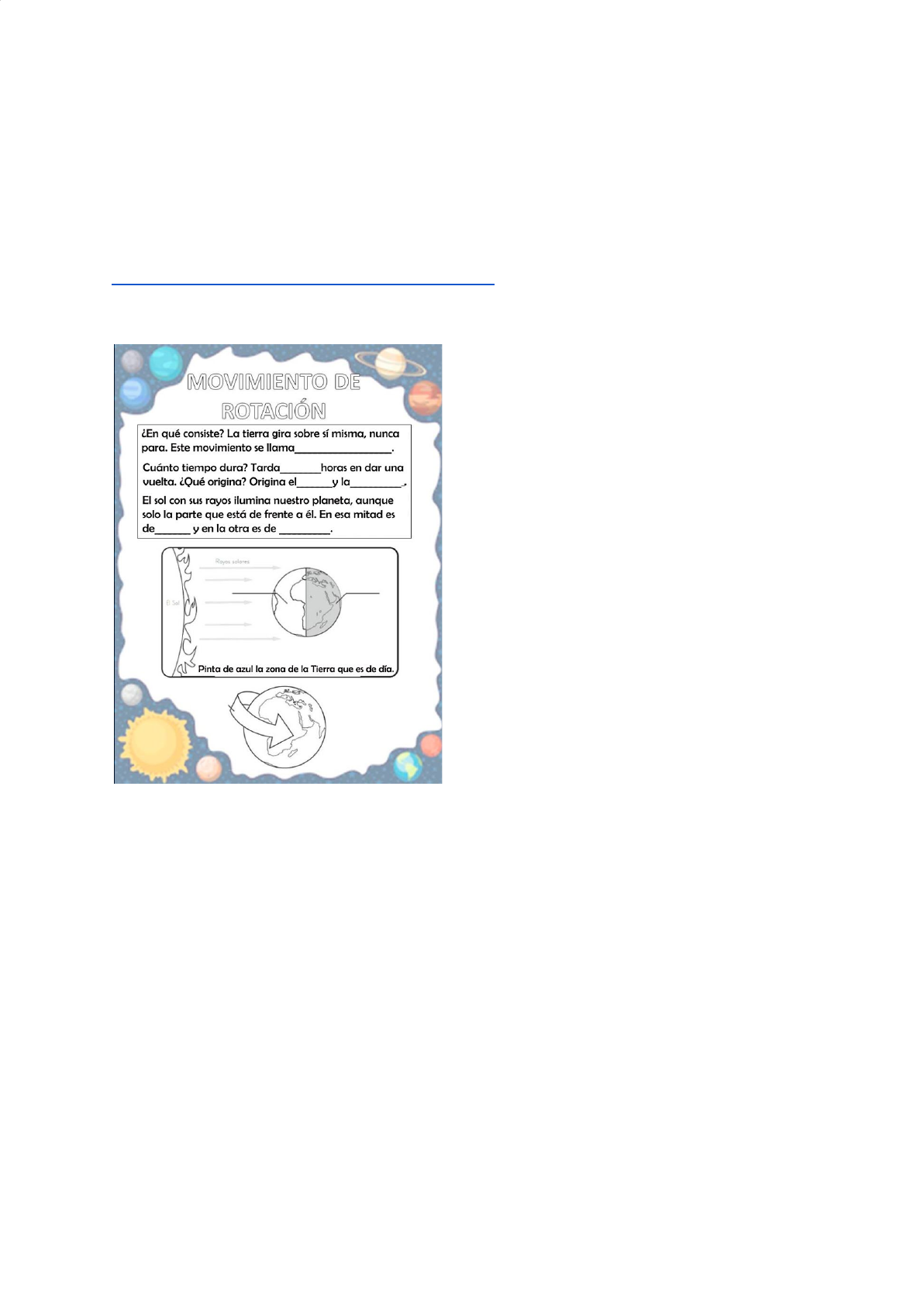 ACTIVIDADES SOBRE LOS MOVIMIENTOS DEL PLANETA TIERRA PARTE 1. En clase estudiamos que la Tierra realiza dos movimientos: el movimiento de rotación y el movimiento de traslación. En esta semana y la próxima semana vamos a estudiar ambos movimientos. Hoy vamos a repasar el movimiento de rotación. En primer lugar, les proponemos ver este vídeo. https://m.youtube.com/watch?v=T04ZPvhHrg0 ACTIVIDAD DEL MOVIMIENTO DE ROTACIÓN. MANUALIDAD. Posteriormente realizarán esta manualidad sobre los movimientos de rotación y traslación. Con ella, pueden pueden practicar de forma manipulativa ambos movimientos. Guarden la manualidad para la próxima semana que la utilizaremos para repasar el movimiento de traslación también. https://m.youtube.com/watch?v=T04ZPvhHrg0 Les incluimos un vídeo en el que se puede observar la manualidad. Nosotros también le vamos a añadir la Luna. https://m.youtube.com/watch?v=tGFnFObHbQk