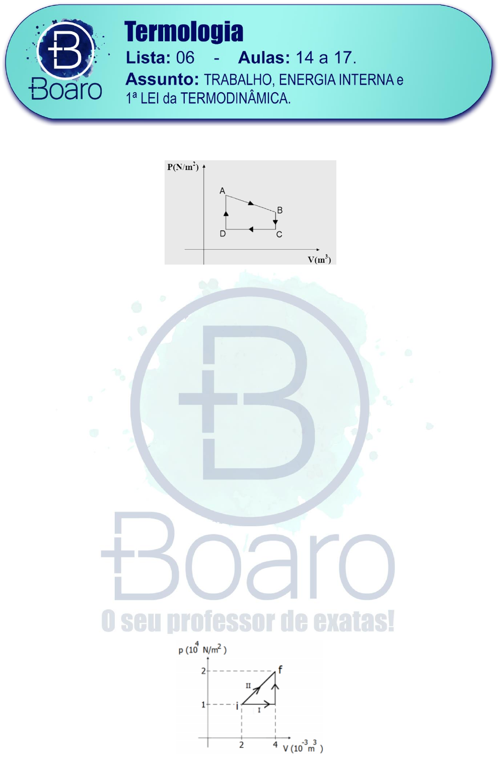 EXC174. (Uern) O gráfico representa um ciclo termodinâmico: Os trabalhos realizados nas transformações AB, BC, CD e DA são, respectivamente: a) Negativo, nulo, positivo e nulo. b) Positivo, nulo, negativo e nulo. c) Positivo, negativo, nulo e positivo. d) Negativo, negativo, nulo e positivo. EXC175. (Uece) O processo de expansão ou compressão de um gás em um curto intervalo de tempo pode representar um processo termodinâmico que se aproxima de um processo adiabático. Como exemplo, pode-se mencionar a expansão de gases de combustão em um cilindro de motor de automóvel em alta rotação. É correto afirmar que, em um processo adiabático no sistema, a) a temperatura é constante e o trabalho realizado pelo sistema é nulo. b) não há transferência de calor. c) a pressão e o volume são constantes. d) a energia interna é variável e a pressão é constante. EXC176. (Uema) No controle de qualidade de produção de seringa, para aplicação de injeção, fez-se o seguinte teste: escolheu-se uma amostra da seringa fabricada e colocou-se 6 33,0 10 m− de determinado gás. Em seguida, levou-se o sistema para uma estufa em que o volume passou para 6 33,5 10 m− ao atingir o equilíbrio térmico. Considerando que esse processo ocorreu sobre pressão constante de 51,5 10 Pa, calcule, em joule, o trabalho realizado pelo sistema. EXC177. (Ufrgs) Um gás ideal contido em um cilindro com pistão pode ser levado de um estado inicial i até um estado final f, seguindo dois processos distintos, I e II, conforme ilustrado na figura abaixo. Os trabalhos WI e WII, realizados pelo gás nos processos I e II, valem respectivamente a) 10 J e 30 J. b) 20 J e 20 J. c) 20 J e 30 J. d) 30 J e 10 J. e) 30 J e 20 J. EXC178. (Uece) Do ponto de vista da primeira lei da termodinâmica, o balanço de energia de um dado sistema é dado em termos de três grandezas: a) trabalho, calor e densidade. b) trabalho, calor e energia interna. c) calor, energia interna e volume. d) pressão, volume e temperatura. EXC179. Um gás perfeito sofre uma compressão, recebendo 1.000 J de trabalho, e cedendo 400 J de calor para o meio ambiente. Calcule a variação da energia interna e identifique se o gás esquentou ou esfriou. EXC180. Numa transformação isotérmica, uma amostra de gás ideal recebe 600 J de calor. Calcule o trabalho realizado. EXC181. Numa transformação isotérmica um gás ideal perde 1.200 J de calor para o meio ambiente. O gás sofreu contração ou expansão? Calcule o trabalho envolvido nessa transformação. EXC182. Um botijão metálico contém uma porção de gás ideal. Com a válvula de escape fechada ele perde 2.000 J de calor. O gás aqueceu ou resfriou? Calcule a variação da energia interna. EXC183. Durante uma contração gasosa, um gás perde 1.500 J de calor sendo realizado sobre o êmbolo um trabalho de 2.000 J. O gás aqueceu ou resfriou? Qual a variação da energia interna? EXC184. Um gás ideal recebeu 1.500 J de calor e realizou trabalho igual a 2.000 J. O gás aqueceu ou resfriou? Qual a variação da energia interna? EXC185. (Fuvest) Certa quantidade de um gás perfeito sofre três transformações sucessivas: A→B; B→C e C→A, conforme o diagrama pressão volume a seguir. 0 A C B P V Sejam AB, BC, CA os valores absolutos dos trabalhos realizados pelo gás em cada uma daquelas transformações. Podemos afirmar que a) AB = 0. b) CA = AB. c) BC = 0. d) BC > AB. e) AB + BC + CA = 0. EXC186. A figura mostra a sequência de transformações A→B→C→A sofridas por certa massa de gás ideal, sendo uma delas isotérmica. 1 0 40 80 A C B (L)V a) Determine o trabalho realizado pelo gás nas transformações A→B e B→C. b) Se a temperatura em A é TA = 500 K, determine TB e TC. c) Qual a pressão em C? EXC187. A figura mostra a sequência de transformações A→B→C→A sofridas por certa massa de gás ideal, sendo uma delas isotérmica. 10 2 5 3 0 0,4 0,8 A C B (N/m )P (m )V Se a temperatura em A é 500 K, a pressão e a temperatura em C valem, respectivamente, A) 5104 N/m2 e 500 K. B) 5104 N/m2 e 250 K. C) 5103 N/m2 e 500 K. D) 2,5103 N/m2 e 300 K. E) 2,5104 N/m2 e 400 K. EXC188. (Pucrs) A observação de alguns corpos celestes tem se tornado difícil em grandes centros urbanos, principalmente por conta da poluição luminosa produzida. Os rastros luminosos deixados no céu pelas estrelas cadentes, por exemplo, são mais facilmente observados em locais ermos e distantes das cidades. As estrelas cadentes são, na verdade, meteoros cujas velocidades medidas são da ordem de milhares de quilômetros por hora. Erroneamente se atribui o aquecimento das regiões próximas ao meteoro ao atrito entre ele e a atmosfera, mas a principal razão desse aquecimento é a __________ do ar atmosférico logo à frente do meteoro. a) compressão isobárica b) compressão adiabática c) expansão isobárica d) expansão adiabática EXC189. (Udesc) Em um laboratório de física são realizados experimentos com um gás que, para fins de análises termodinâmicas, pode ser considerado um gás ideal. Da análise de um dos experimentos, em que o gás foi submetido a um processo termodinâmico, concluiu-se que todo calor fornecido ao gás foi convertido em trabalho. Assinale a alternativa que representa corretamente o processo termodinâmico realizado no experimento. a) processo isovolumétrico b) processo isotérmico c) processo isobárico d) processo adiabático e) processo composto: isobárico e isovolumétrico EXC190. (Cefet MG) Um extintor de incêndio de 2CO é acionado e o gás é liberado para o ambiente. Analise as asserções que se seguem: A figura ilustra uma expansão volumétrica muito rápida, característica de uma transformação adiabática PORQUE em uma transformação adiabática, a transmissão de calor entre o gás e a vizinhança é muito grande e o trabalho realizado pelo gás é igual à variação da sua energia interna. É correto afirmar que a) as duas asserções são